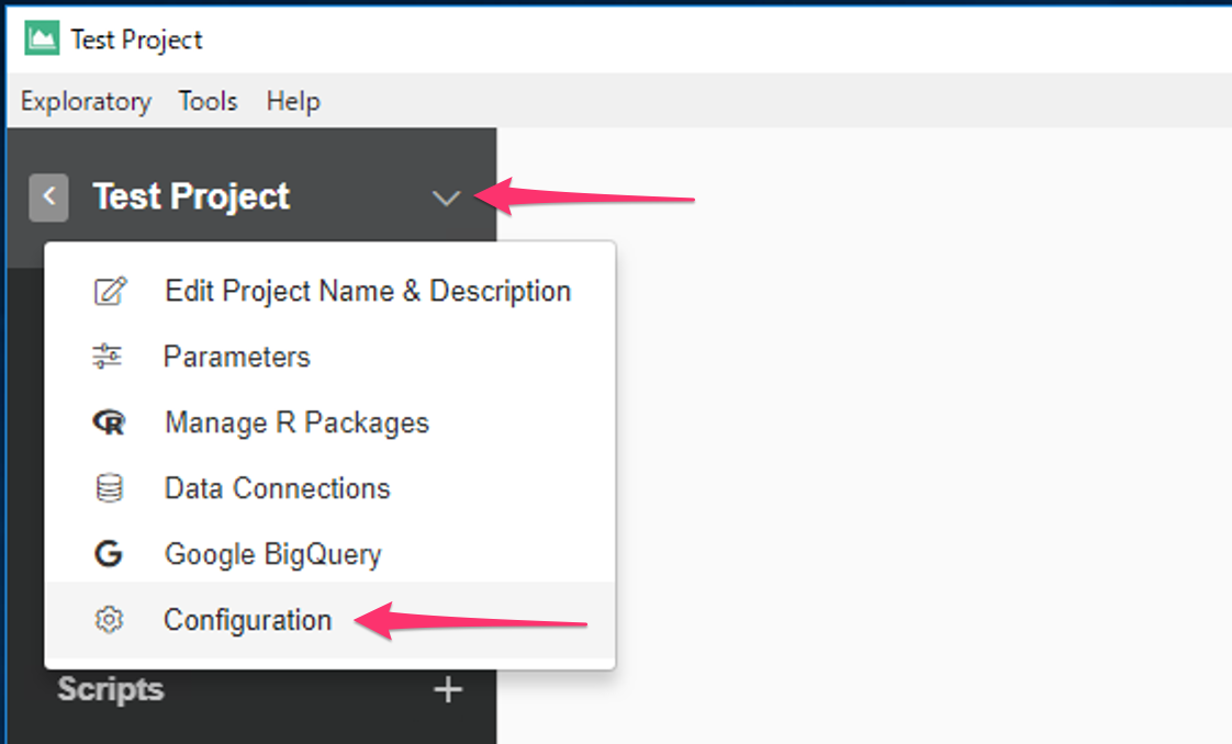 To set System Encoding, click down arrow icon next to project name and select Configuration from pulldown menu.