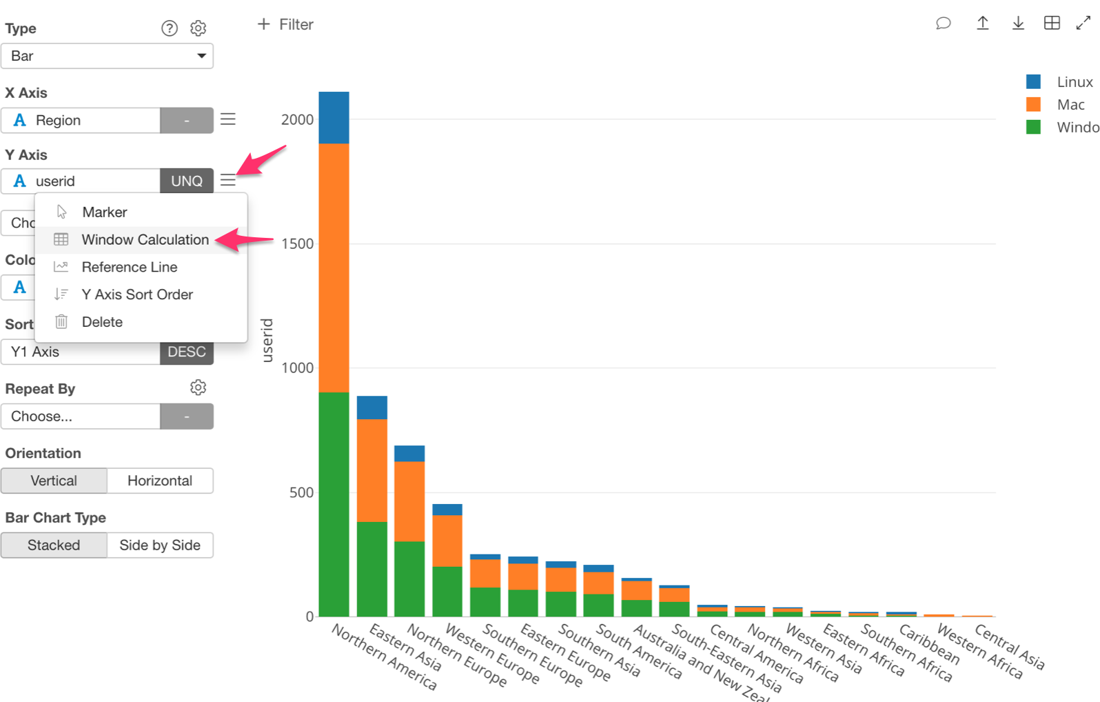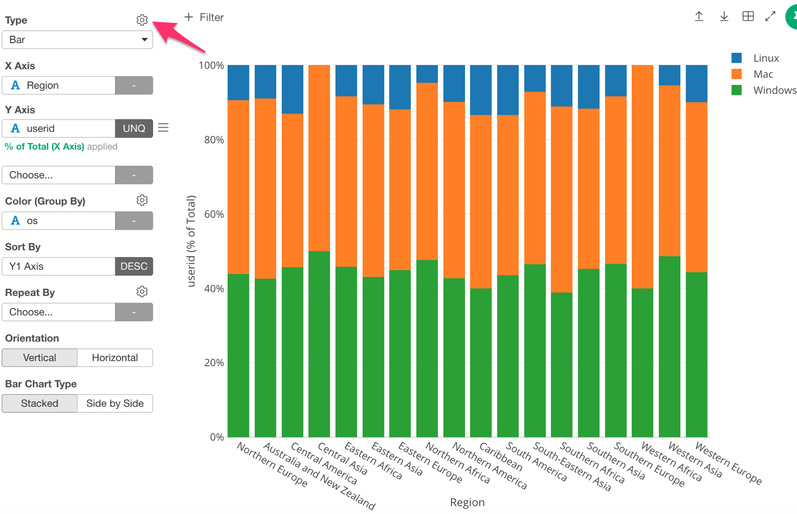 This makes ‘% of’ into ‘% of Total’. That means that it will calculate the total number of users for each region, which is the ‘Sum (Total)’ part. It will then calculate the percentage of each OS in each region, which is the ‘% of’ part.