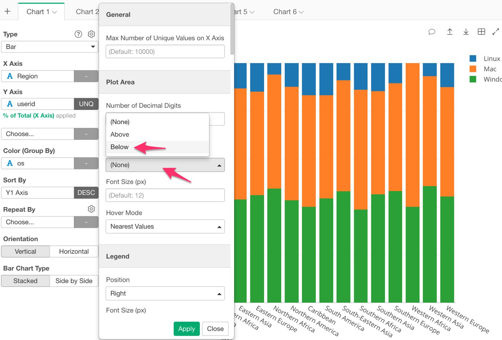 By looking at this chart, we can tell that each region has a different percentage of users using each operating system. But, I want to be able to tell what percentage each OS is just by looking at each section. For this, we can show each value on the chart.