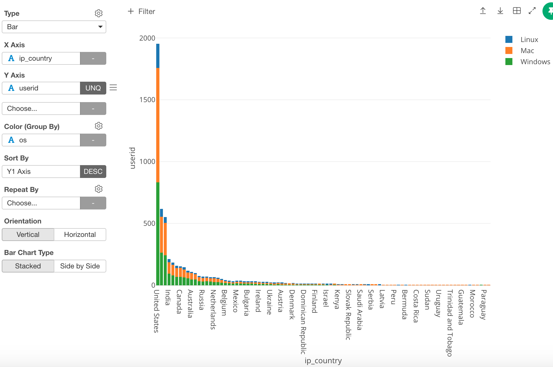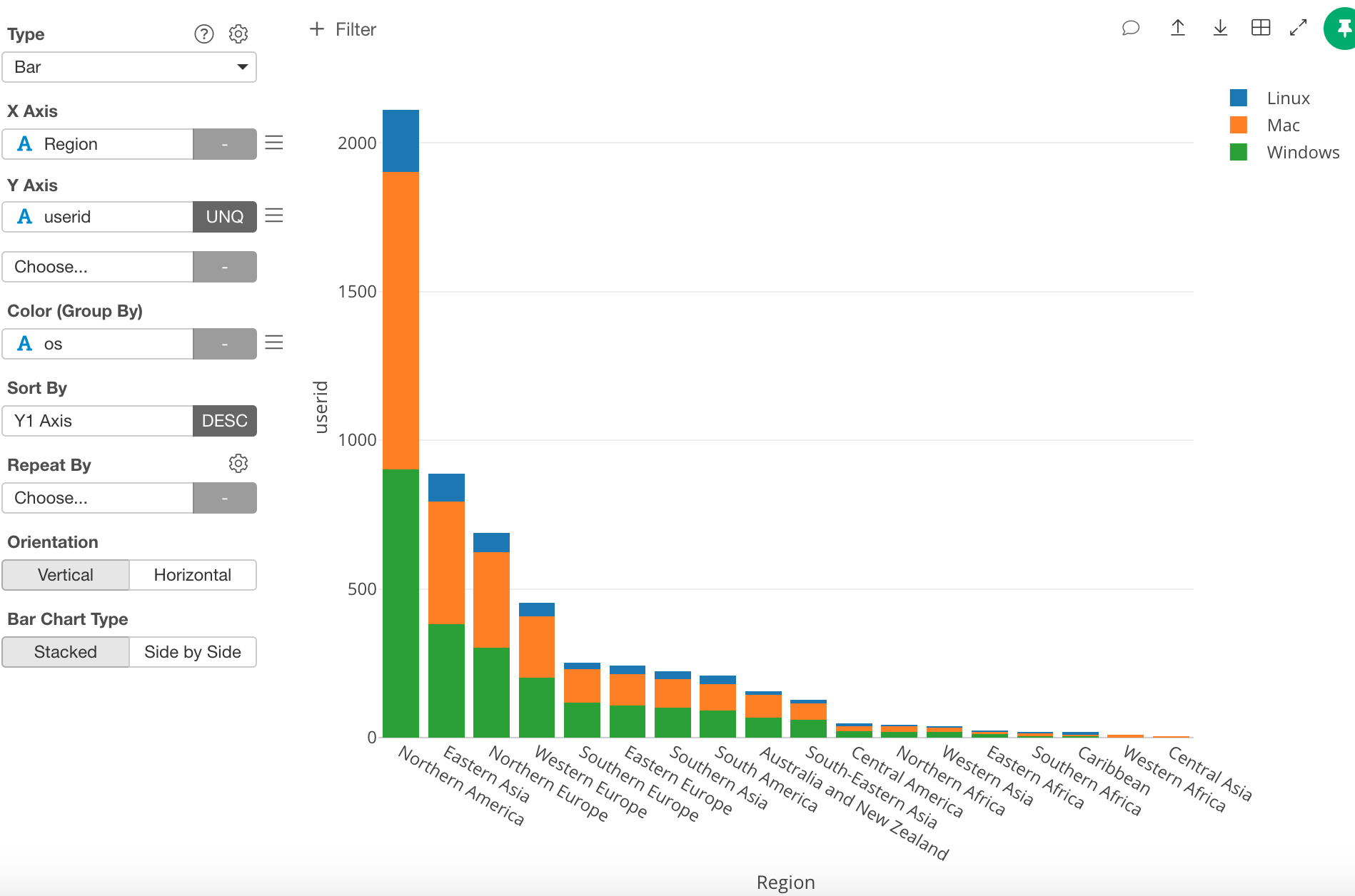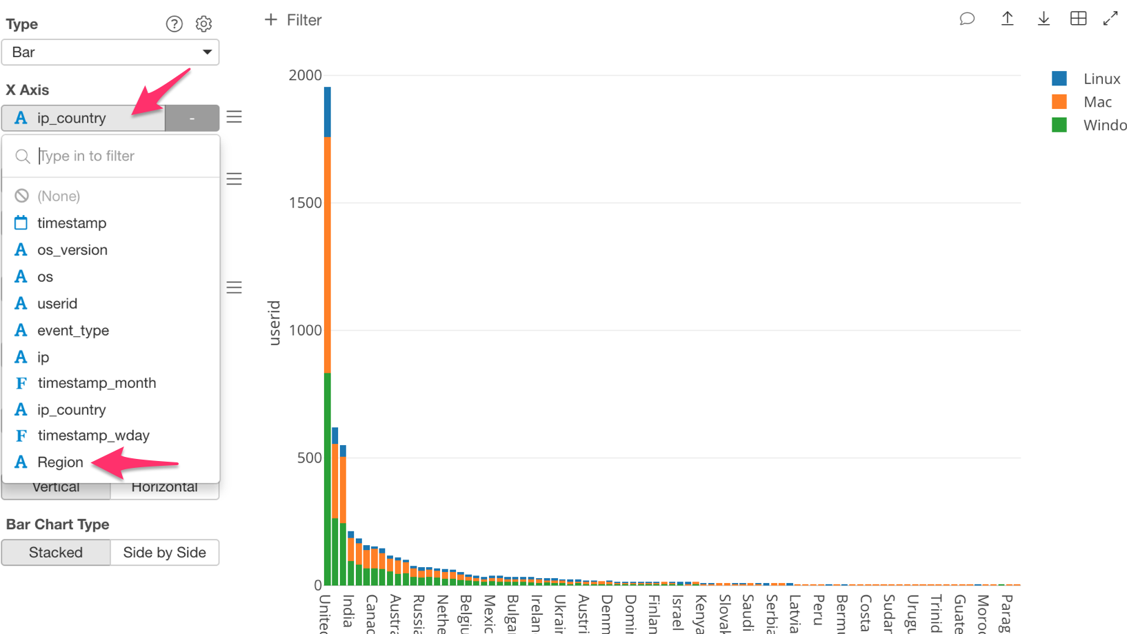 Until now we have been using countries, however, in this post I want to use regions. In order to do this, change the ‘X Axis’ from ‘ip_country’ to ‘Region.’
