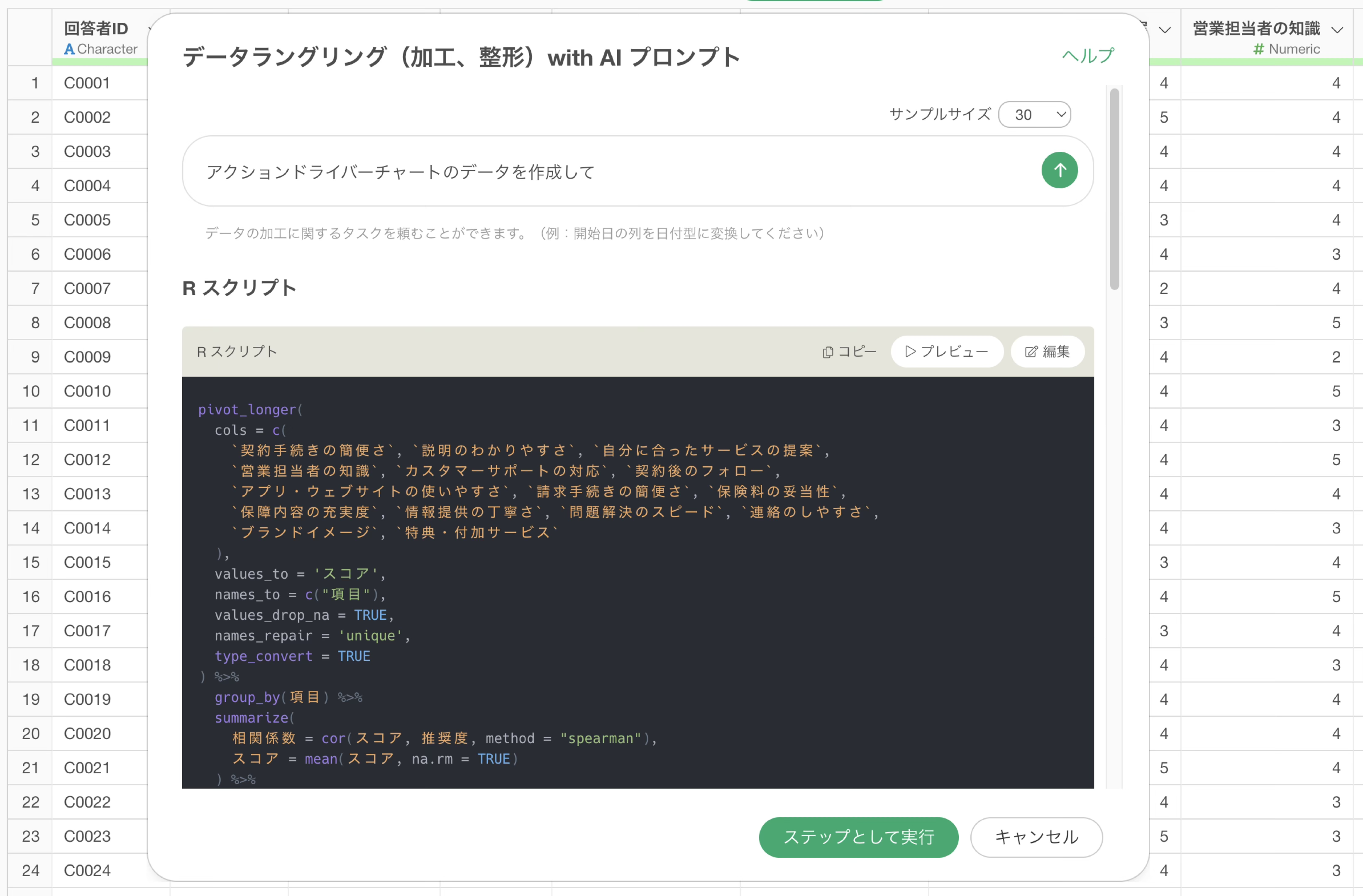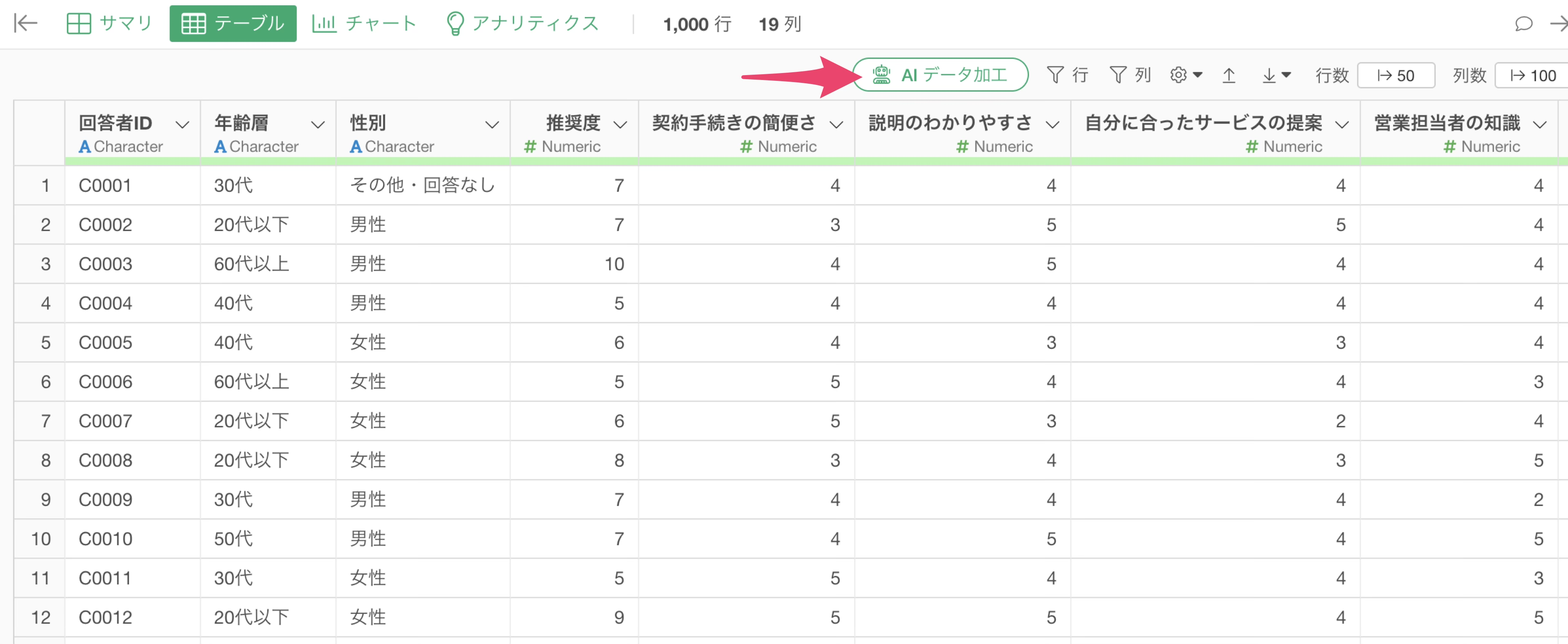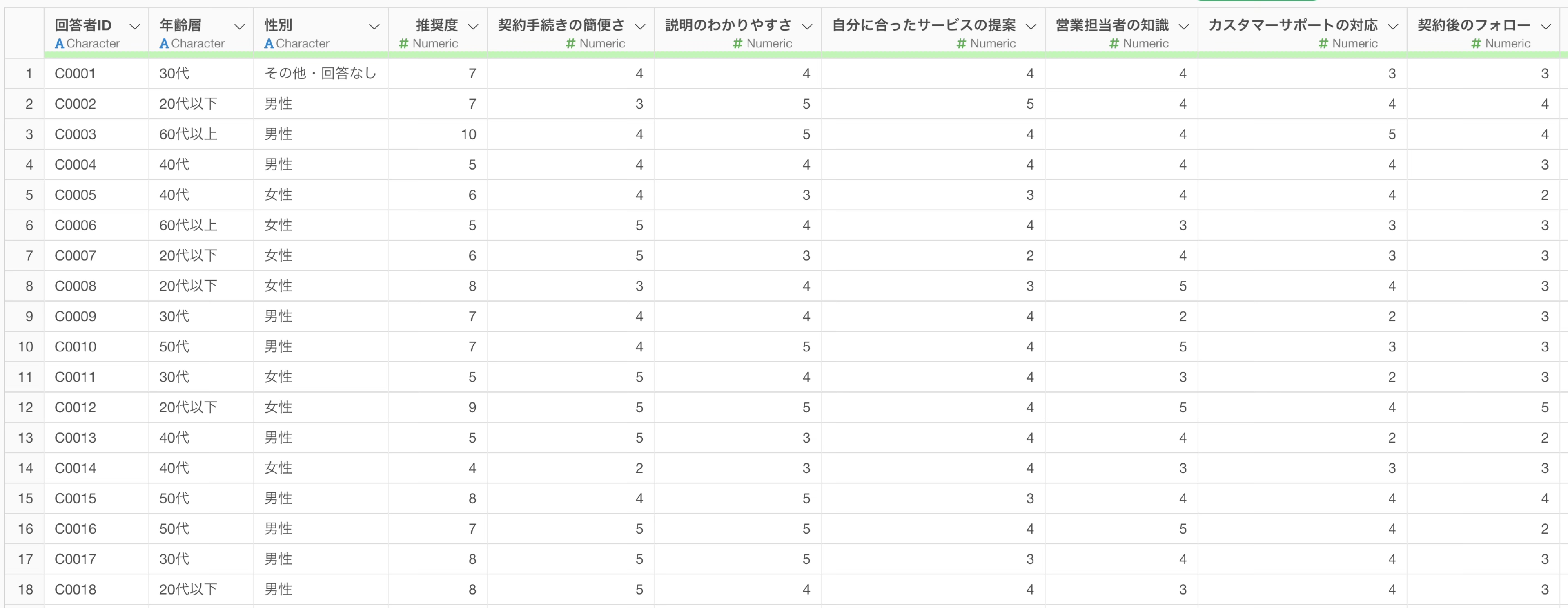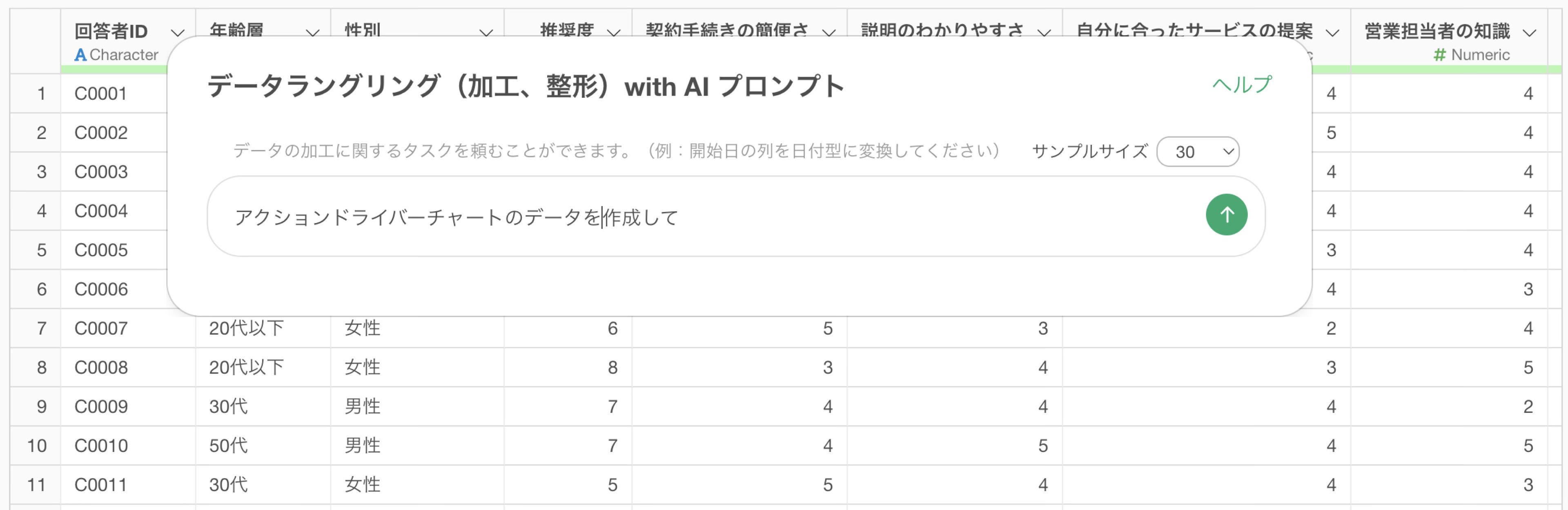 今回は、1行が1人の回答者を表すアンケートデータを使って、AI プロンプトでNPSに対するアクションドライバー・チャートを作成します。(データはこちらからダウンロードいただけます)
