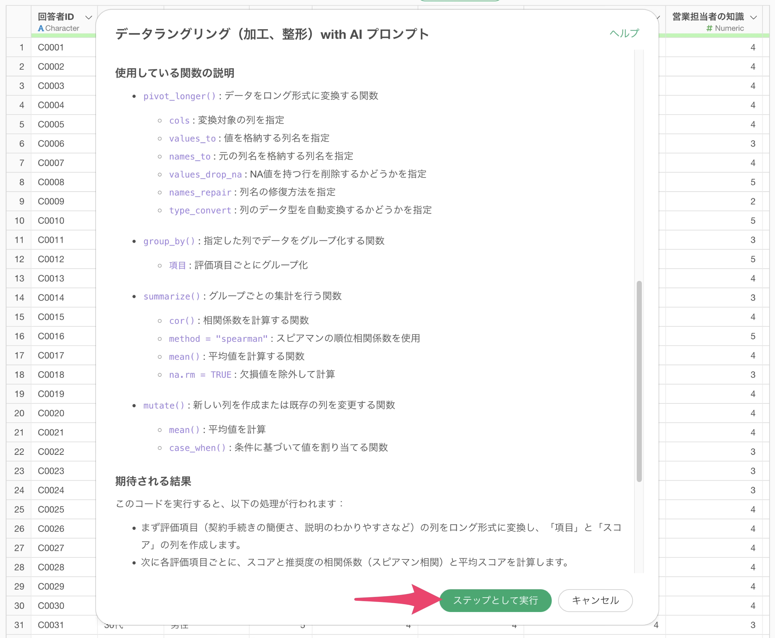使用している関数の説明や期待される結果を確認し、「ステップとして実行」ボタンをクリックします。