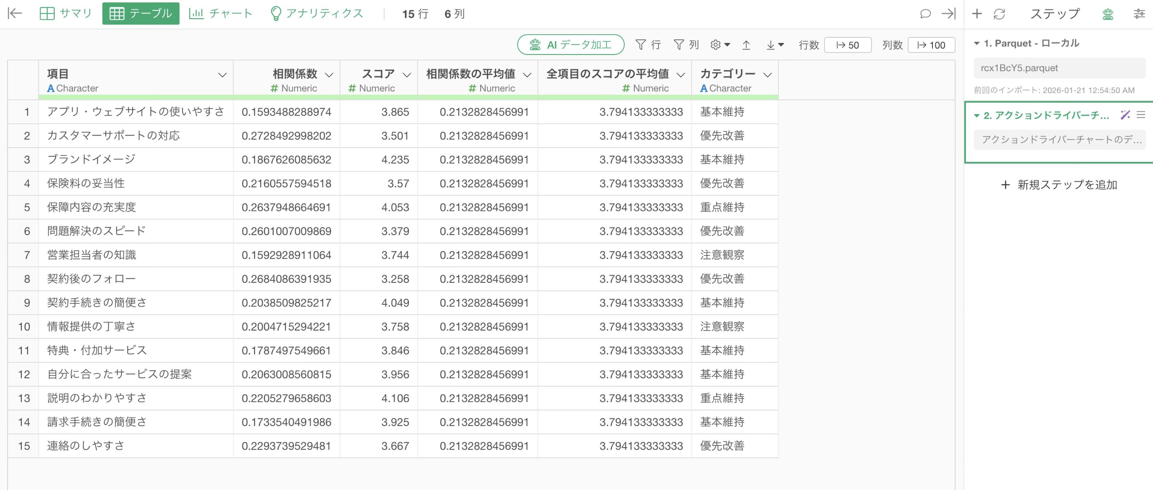 作成されたデータには、評価項目の名前、(平均)スコア、ターゲット指標であるNPSとの相関係数、そして前述したカテゴリー(重点維持、優先改善など)の情報が含まれています。