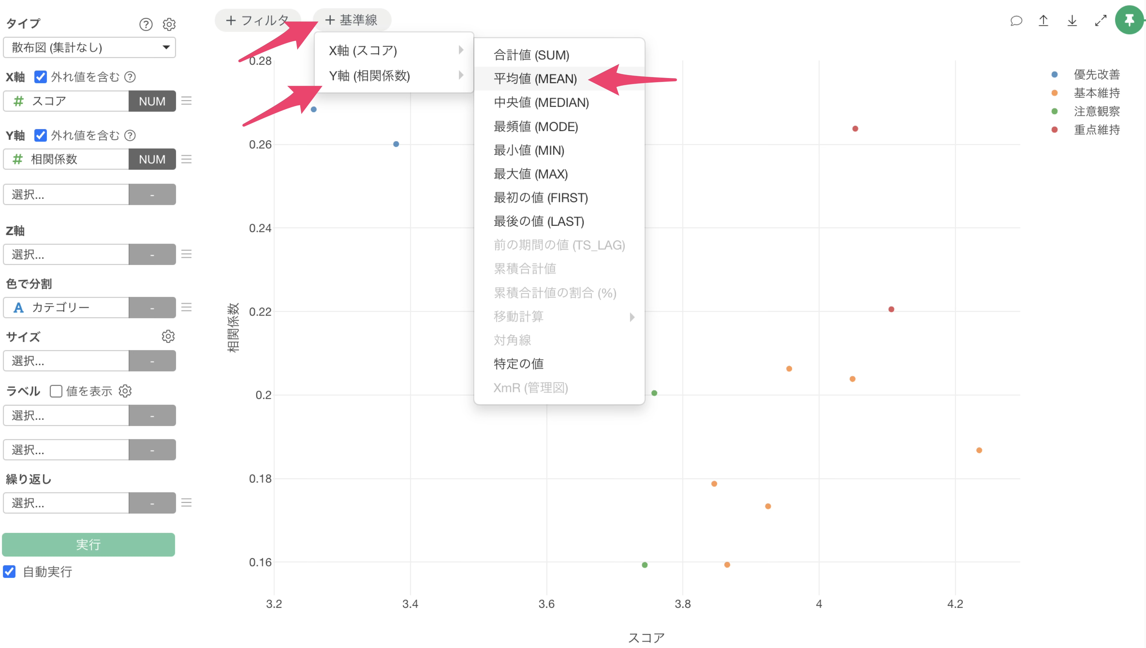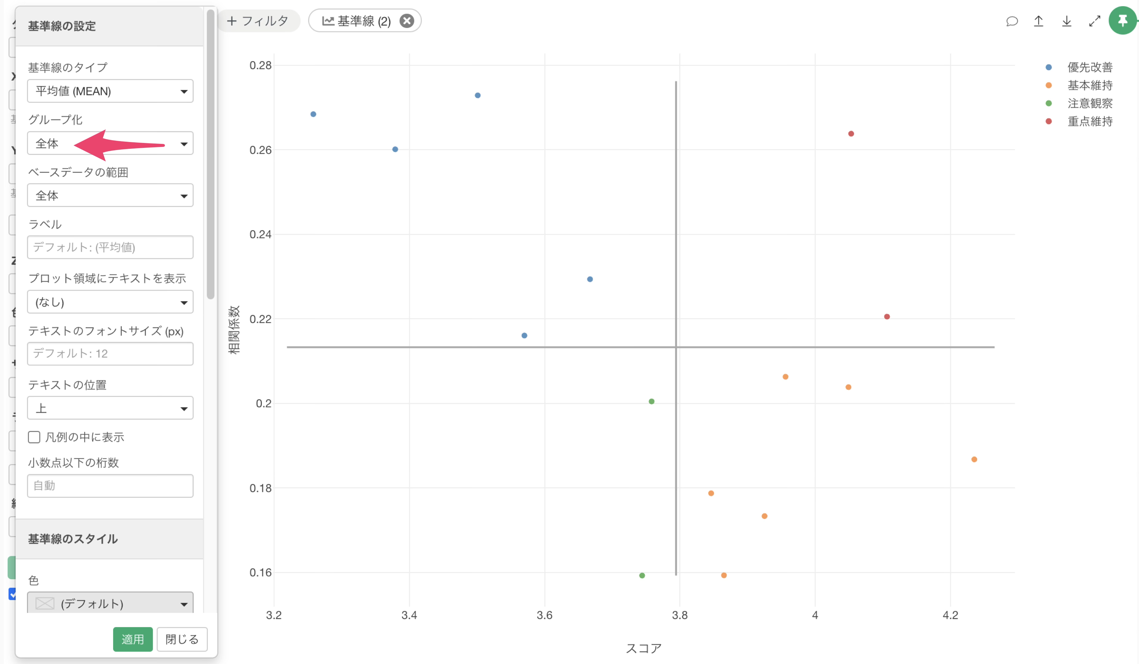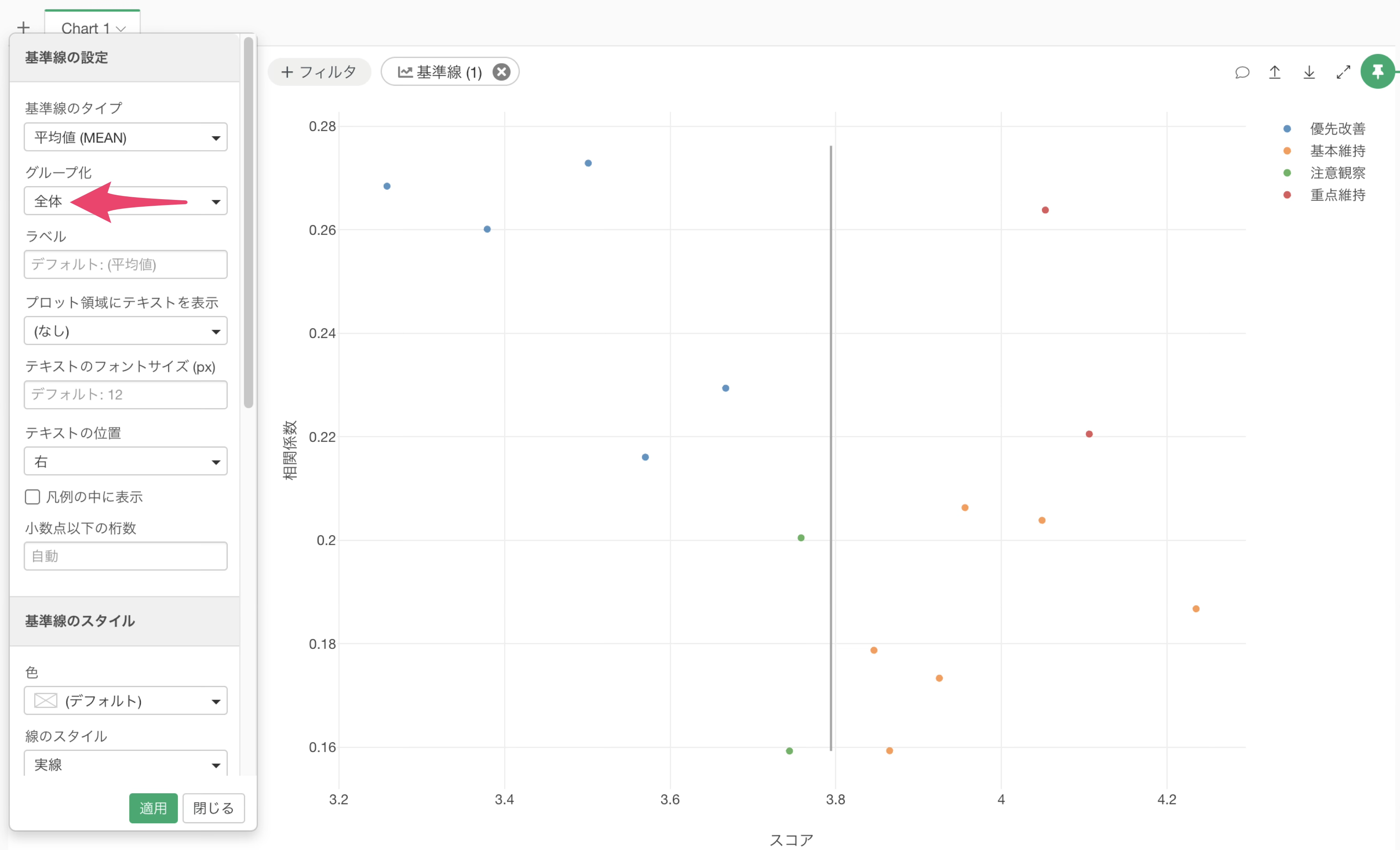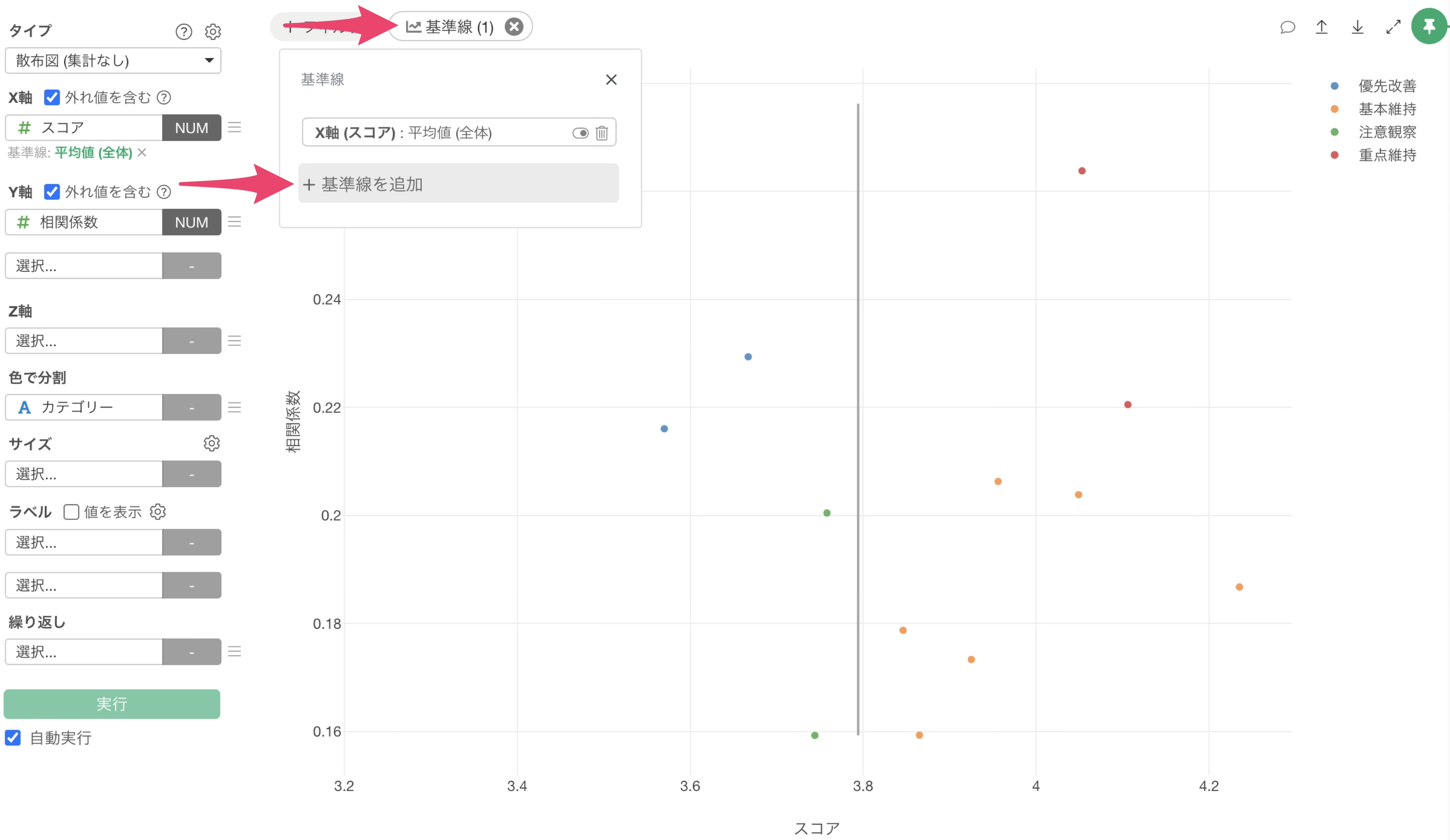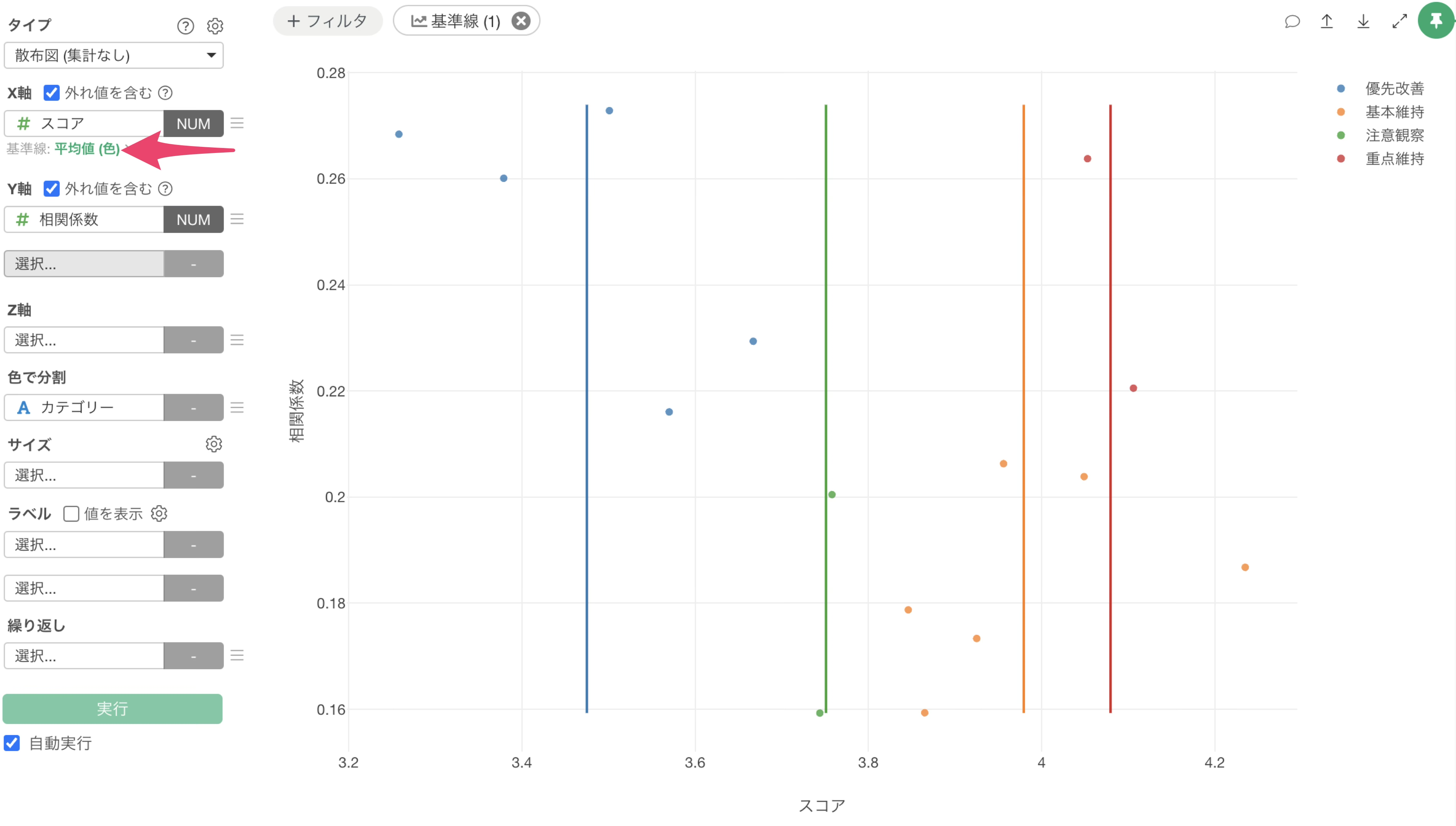 4つのカテゴリーに分類するためにしきい値をリファレンスラインとして表示させたい場合は、チャート上部の基準線のプラスボタンをクリックして、X軸の平均値を選択します。