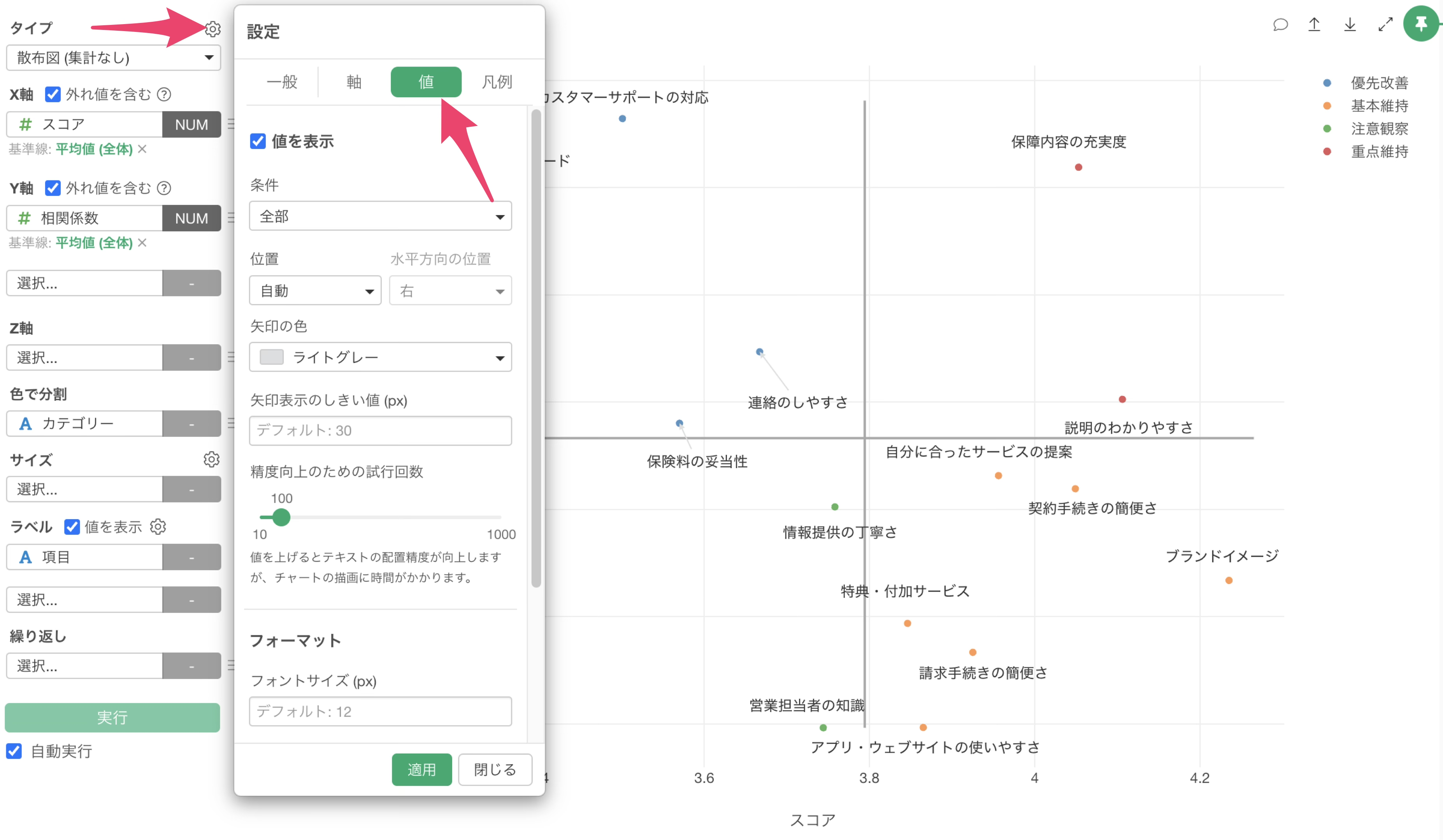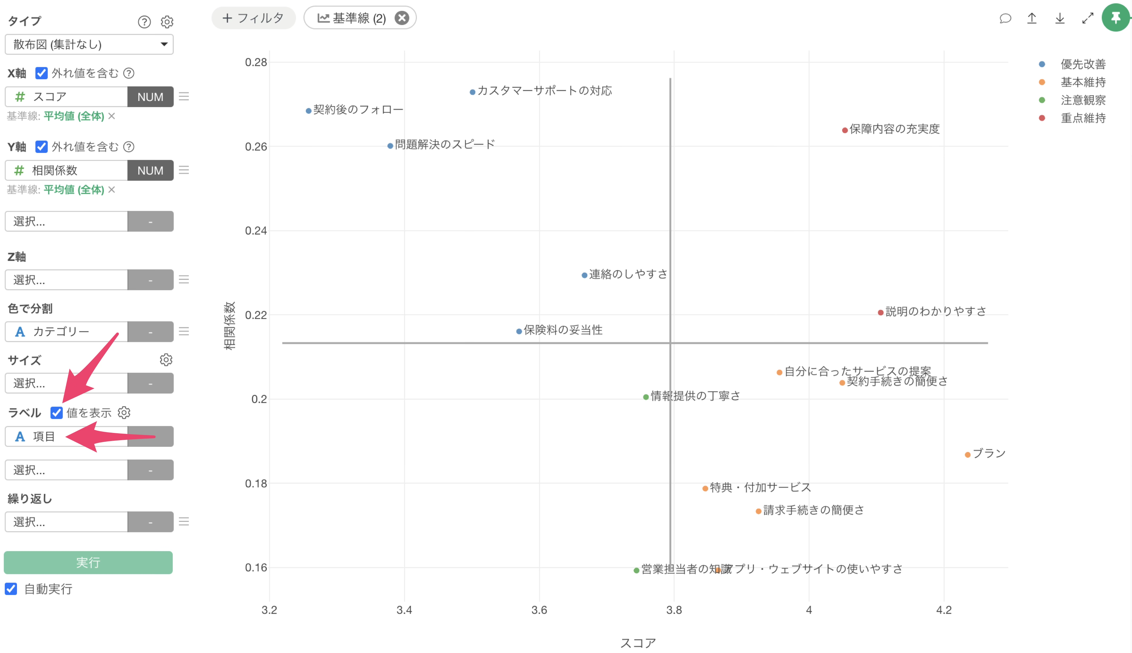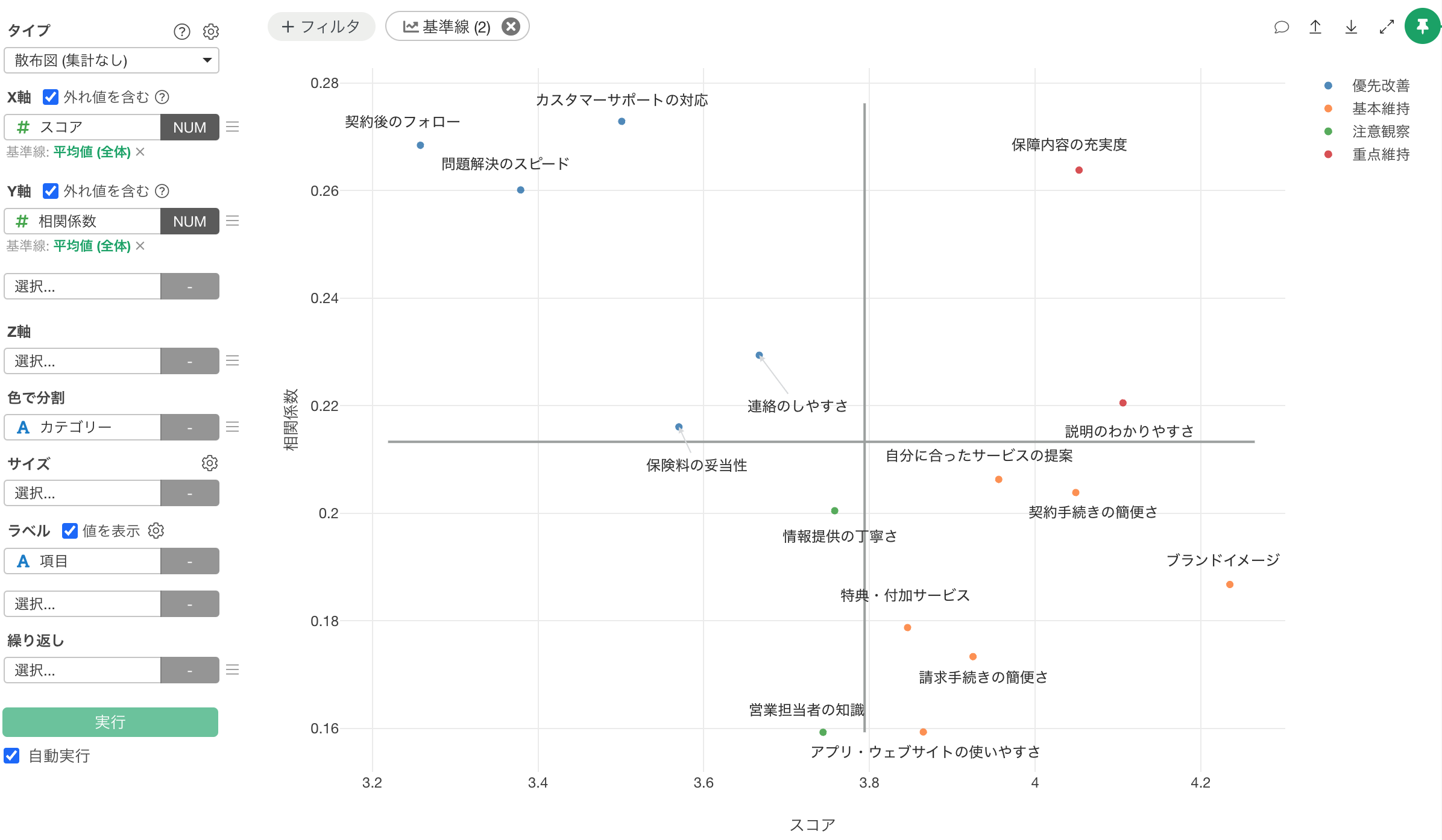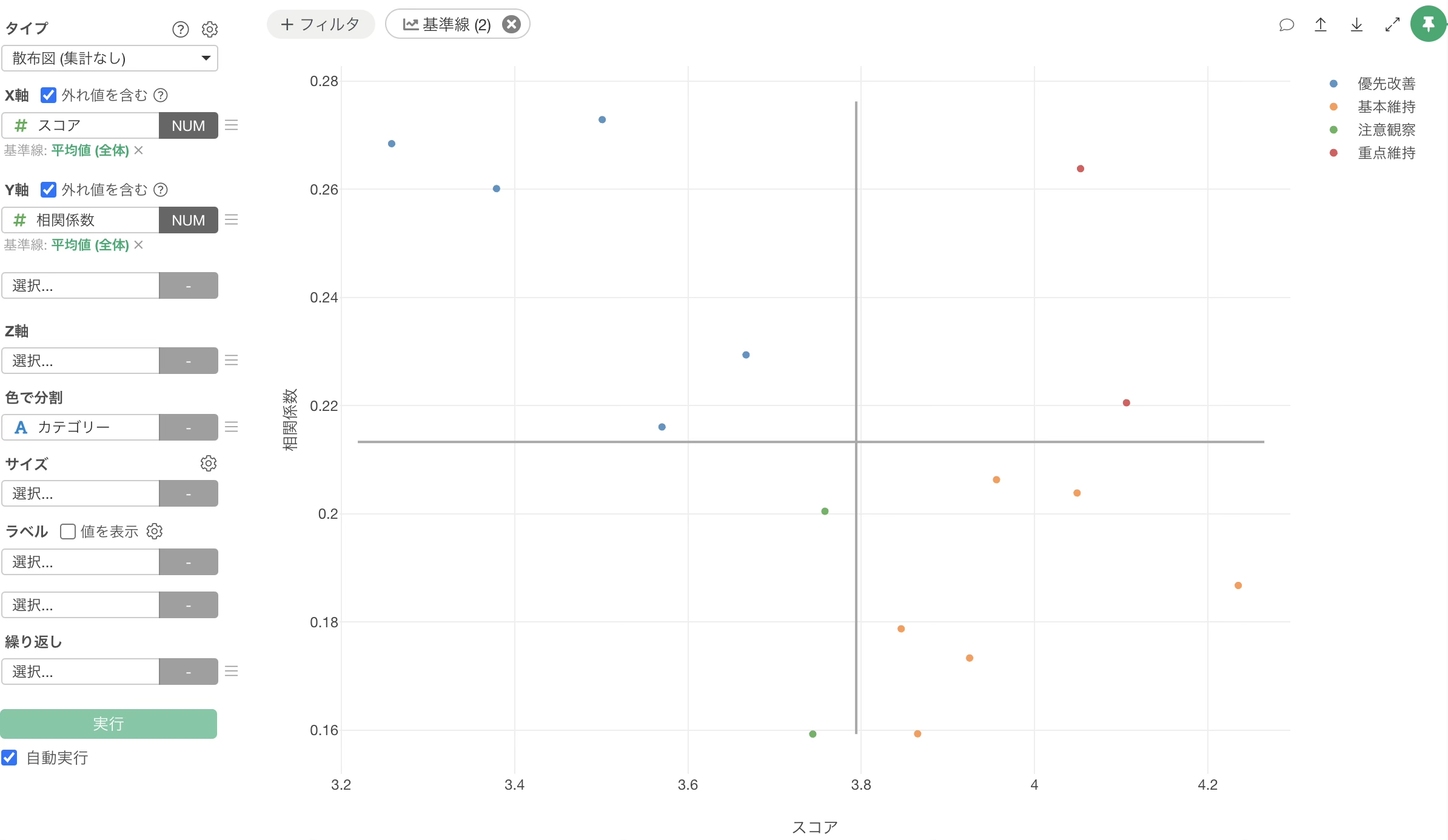 前述したように、評価項目は、評価項目の平均値とターゲットとなる指標に対する相関係数の平均値をしきい値として、4つのカテゴリーに分けられます。