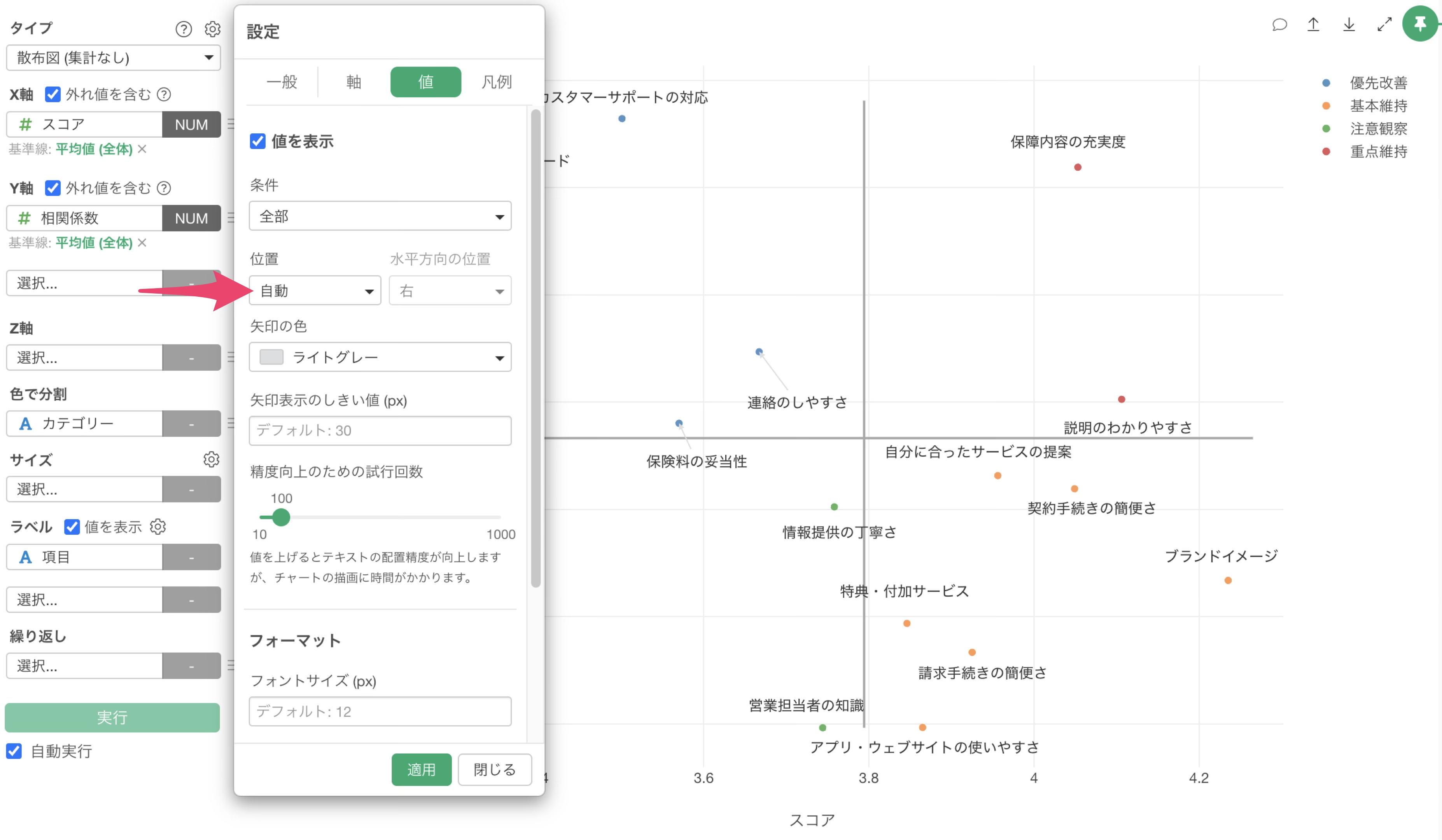 「値を表示」のメニュー内の位置を「自動」に変更し、適用いただくことで、各値の表示を整えることが可能です。