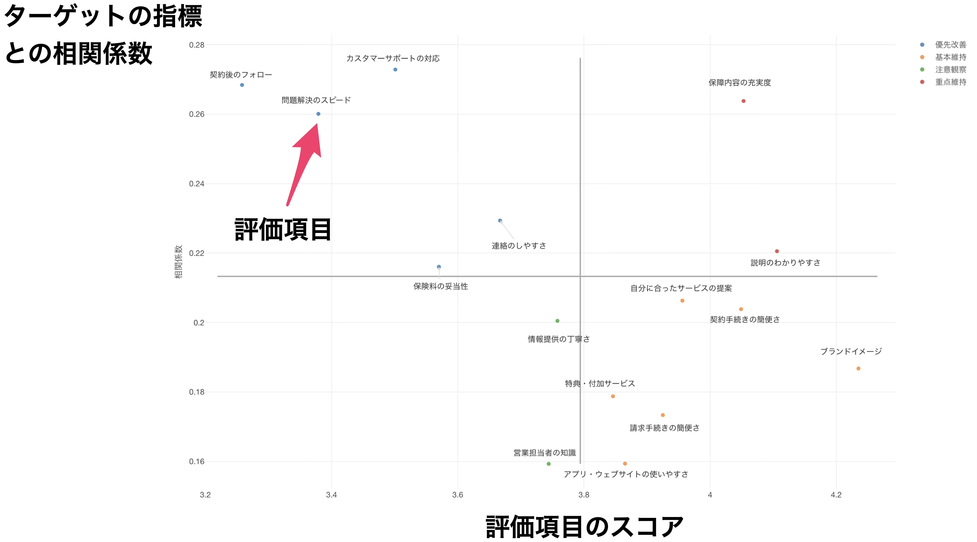 左上の「優先改善」エリアにある項目は、相関は強いもののスコアが低いため、最優先で改善に取り組むべき領域となります。