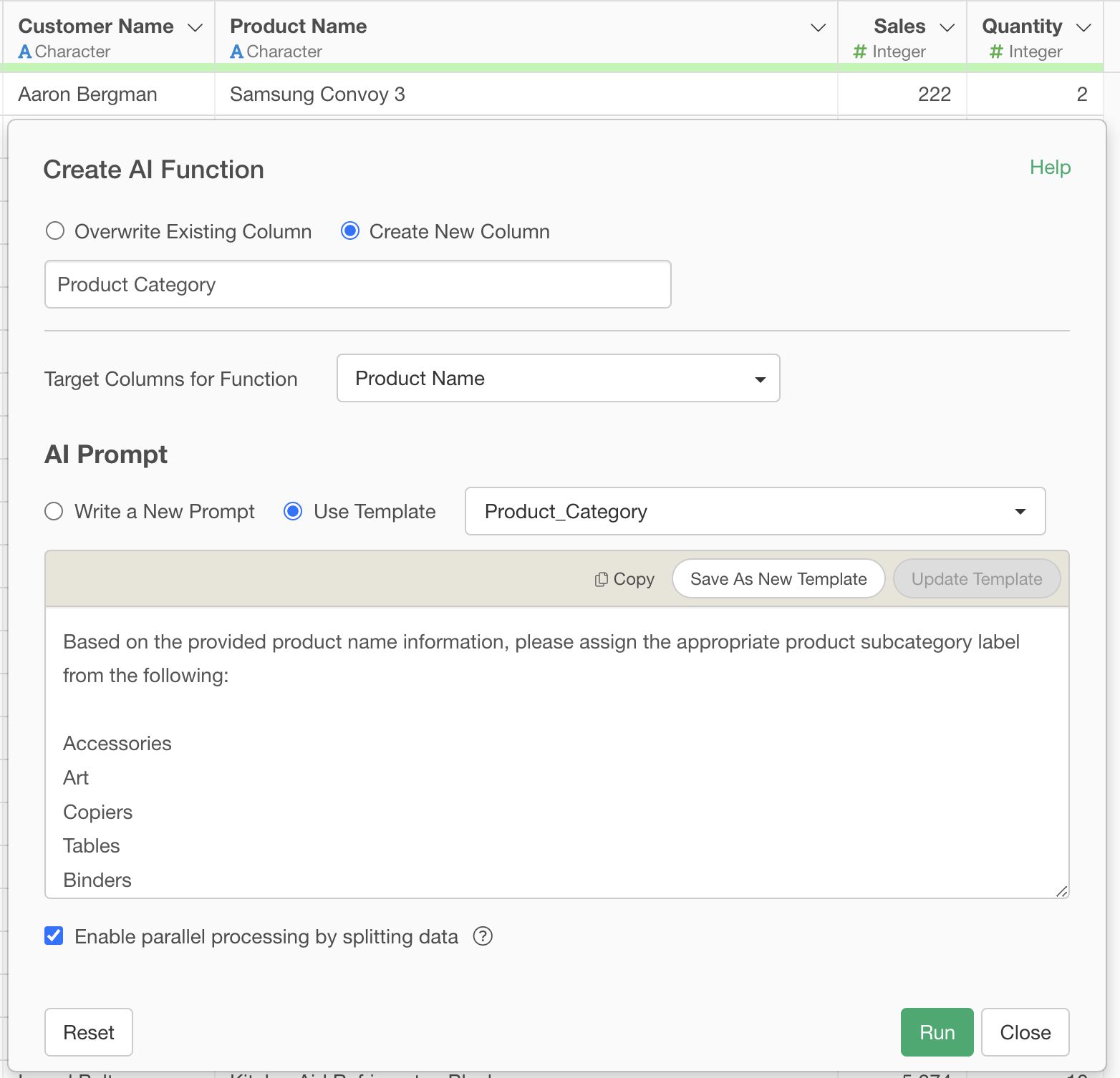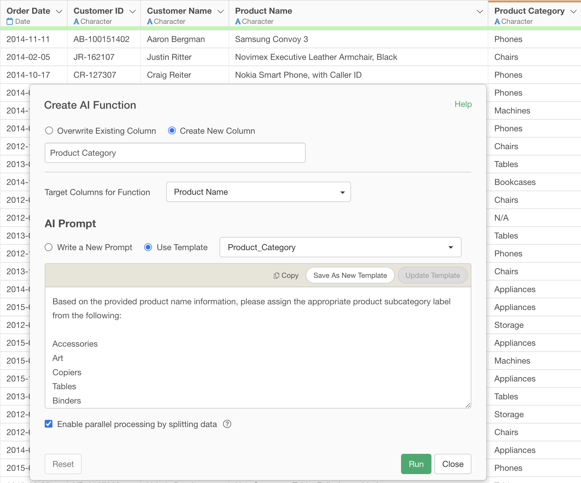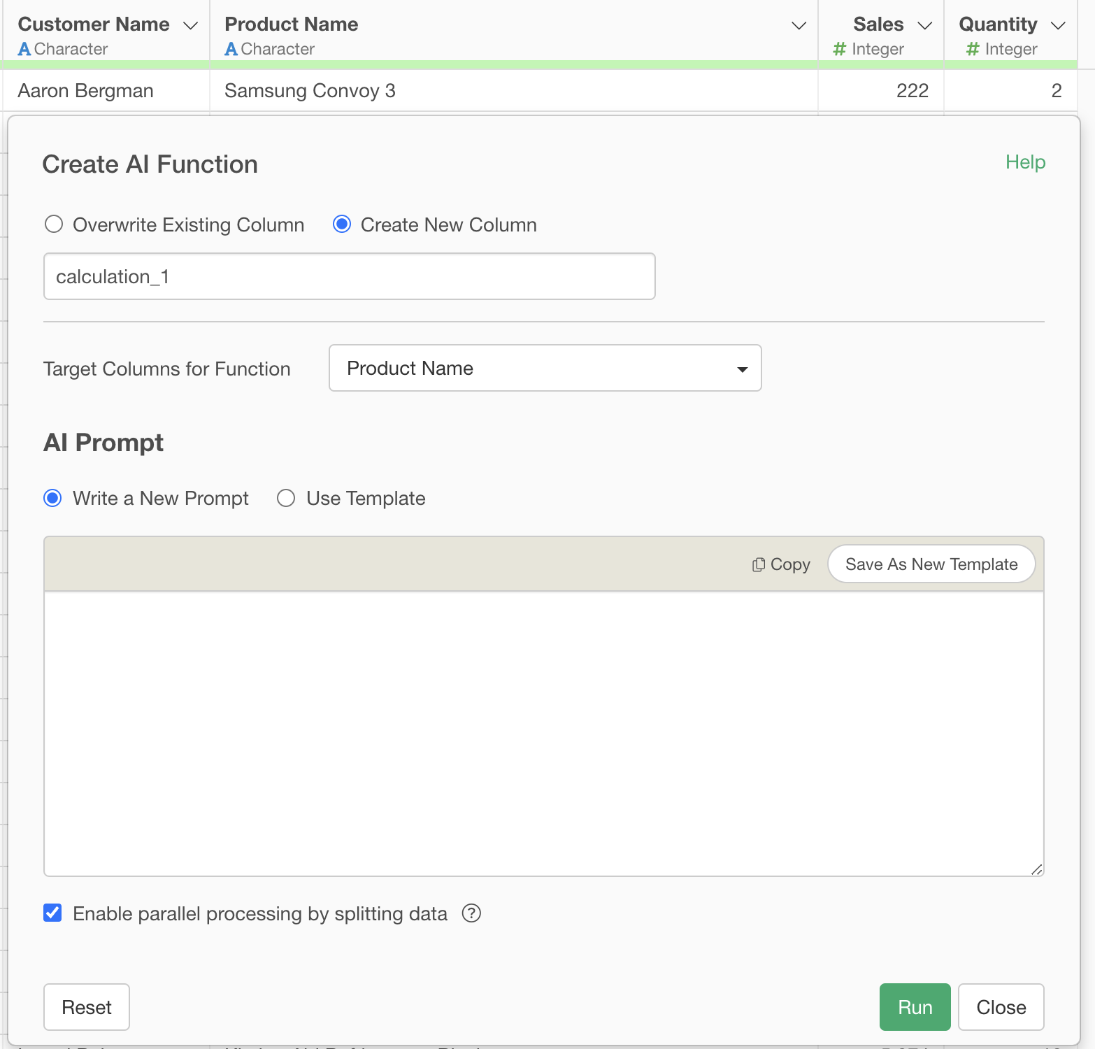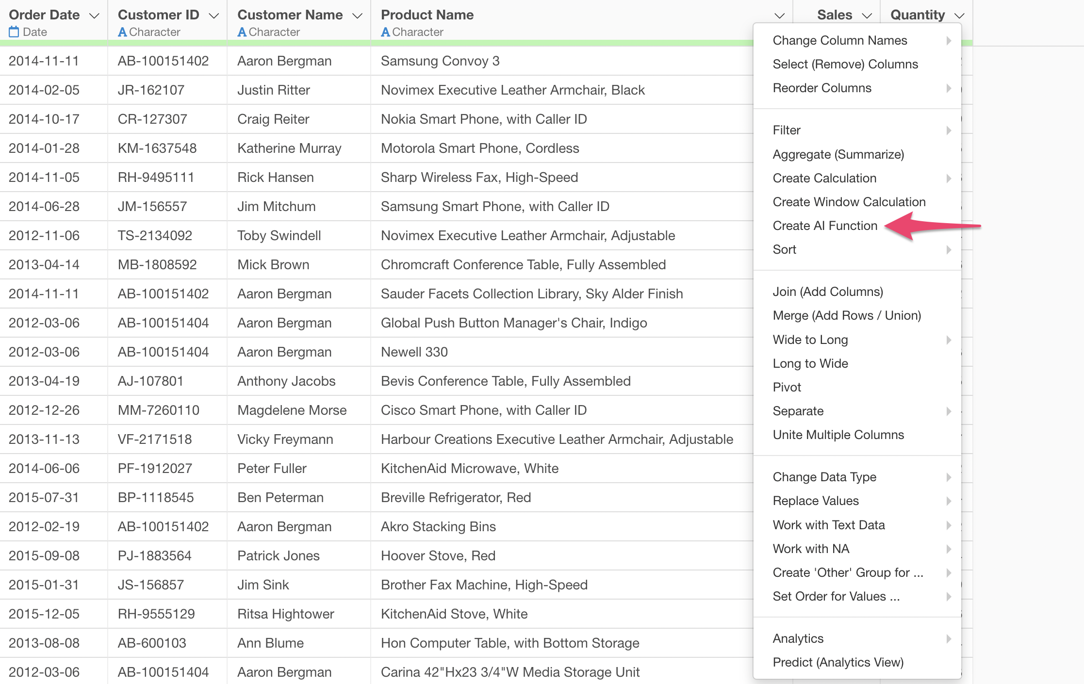 “AI Functions,” newly introduced in Exploratory v14, solve these challenges and enable anyone to create AI-powered functions. Without any programming knowledge, you can easily create custom AI functions by simply writing instructions (prompts) in your own words.