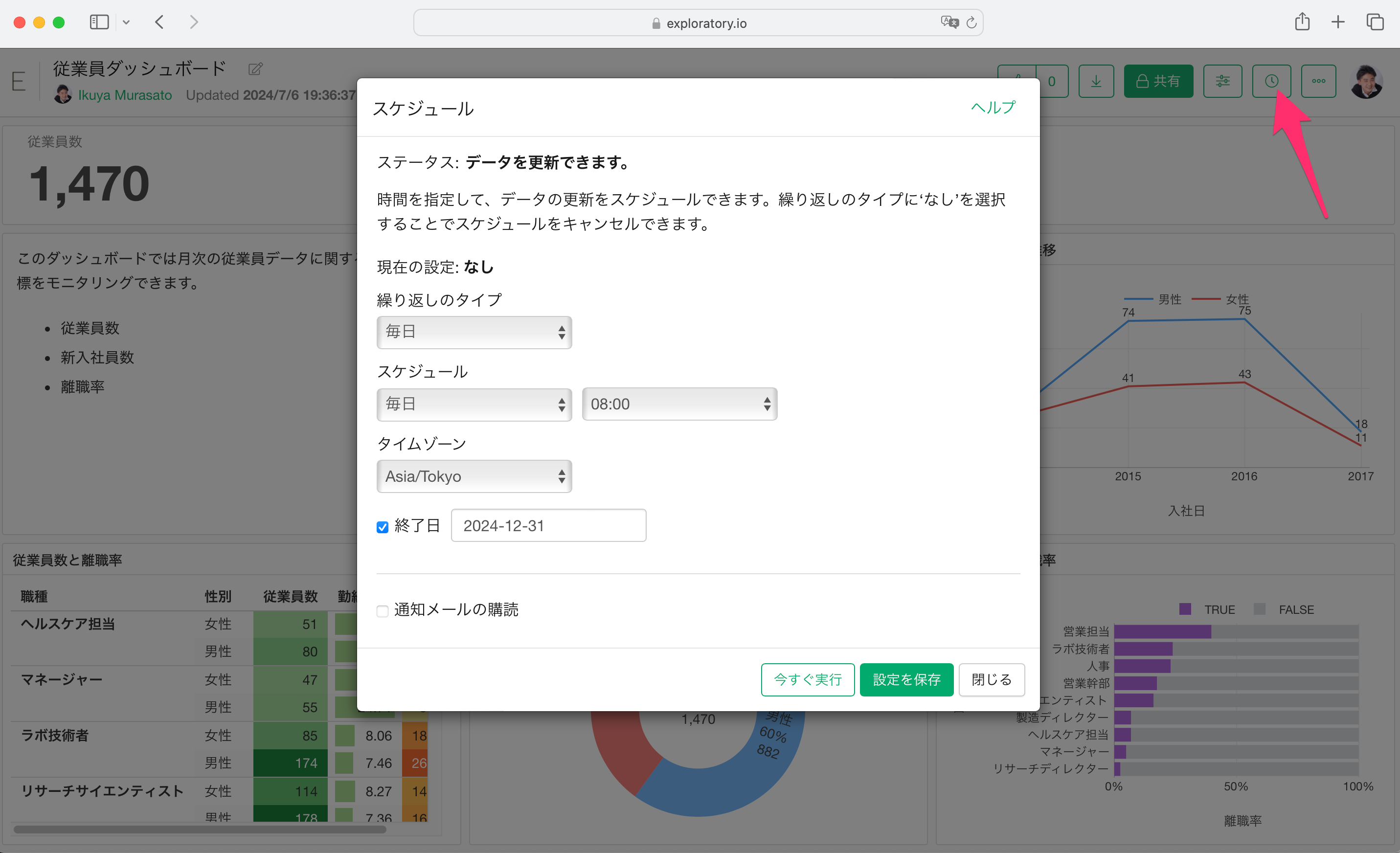 すると、データが再インポートされ、ダッシュボードに含まれるチャートやアナリティクスを更新することが可能です。
