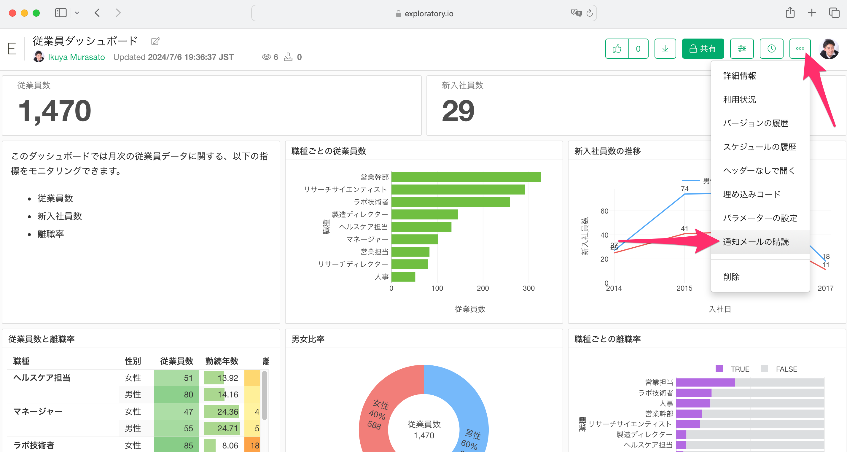 スケジュールが設定されているダッシュボードの場合、ダッシュボードのメニューから通知メールに購読することが可能です。