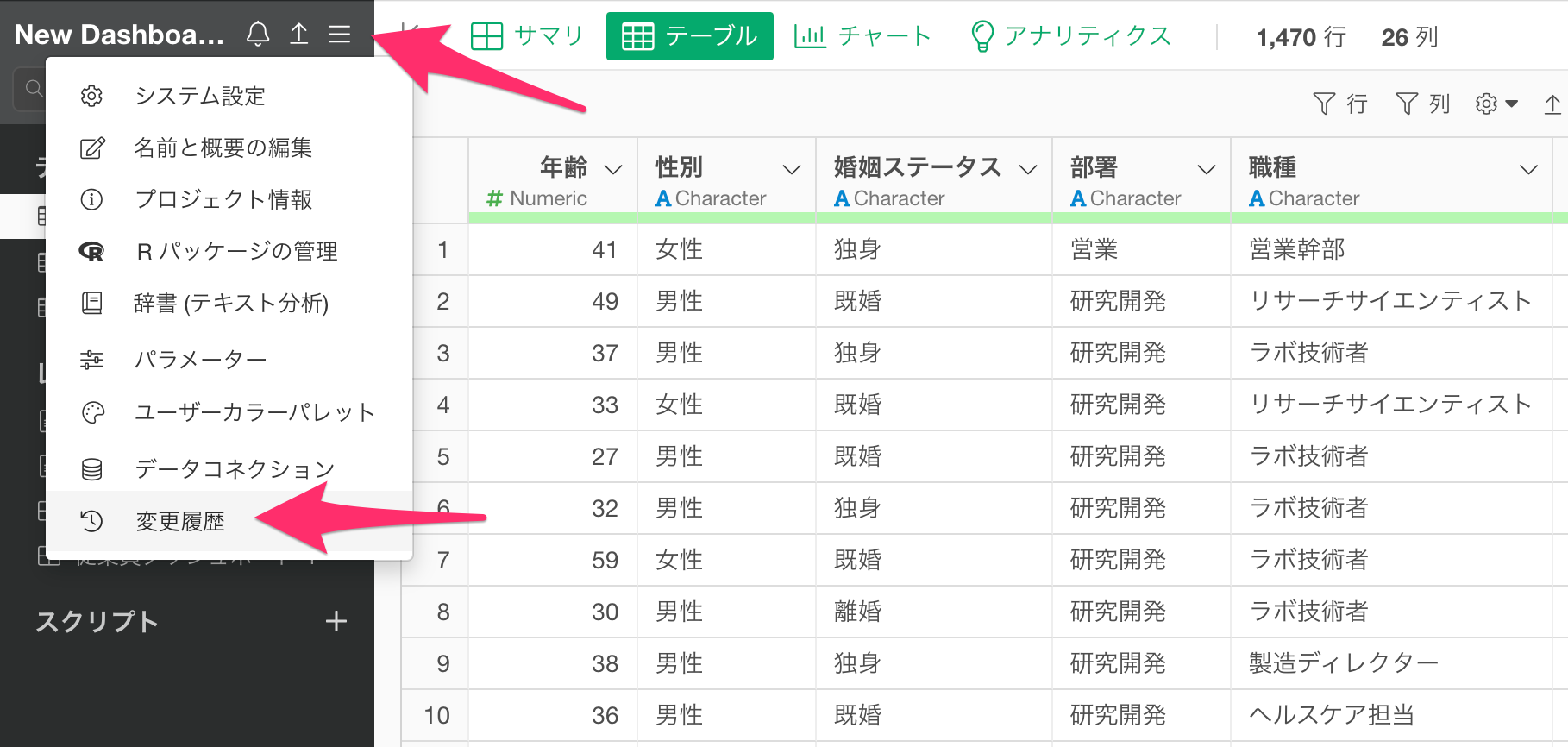 すでに編集済みのダッシュボードを前のバージョンに戻したいときには、プロジェクトメニューの「変更履歴」をクリックします。