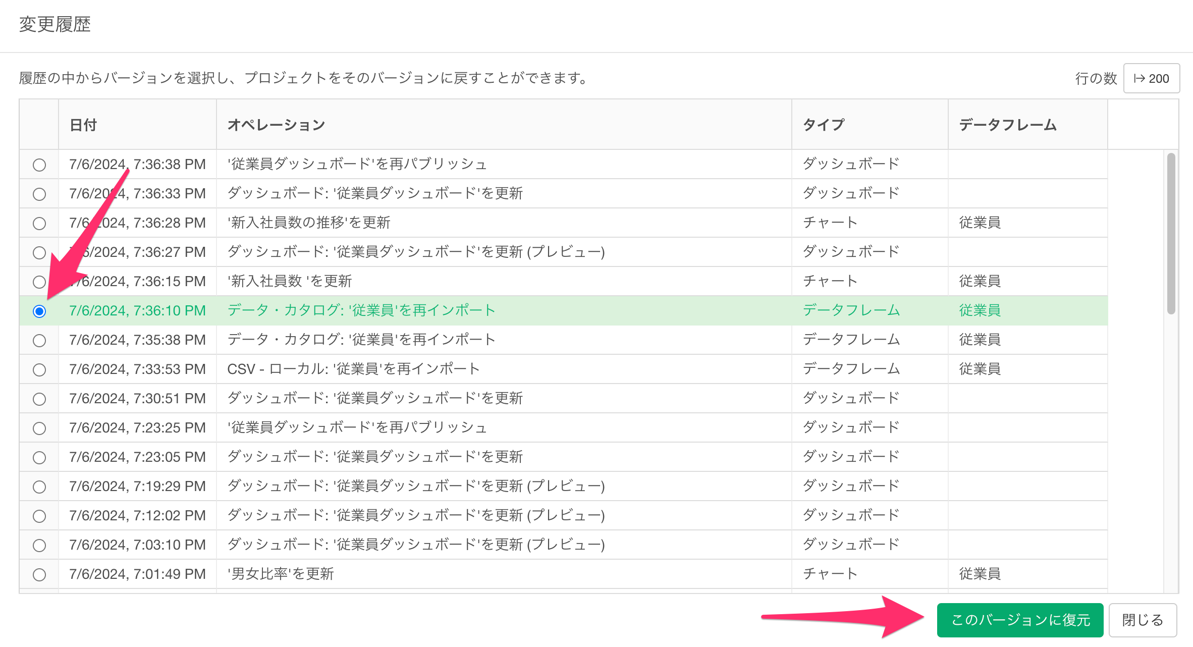 すると、現在いるプロジェクトにおける全ての変更履歴が確認できますので、任意のタイミングにダッシュボードを復元することが可能です。