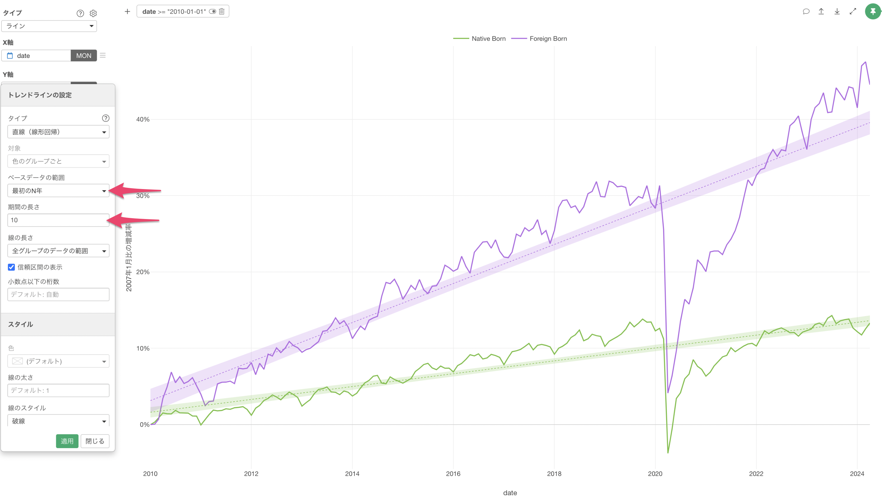 下記はアメリカの就労者数の増減率のチャートで、2007年1月と比べてどれだけ上がっているのか(下がっているのか)を割合として可視化しています。紫色の線が外国生まれ、緑色の線がアメリカ生まれであることを表します。