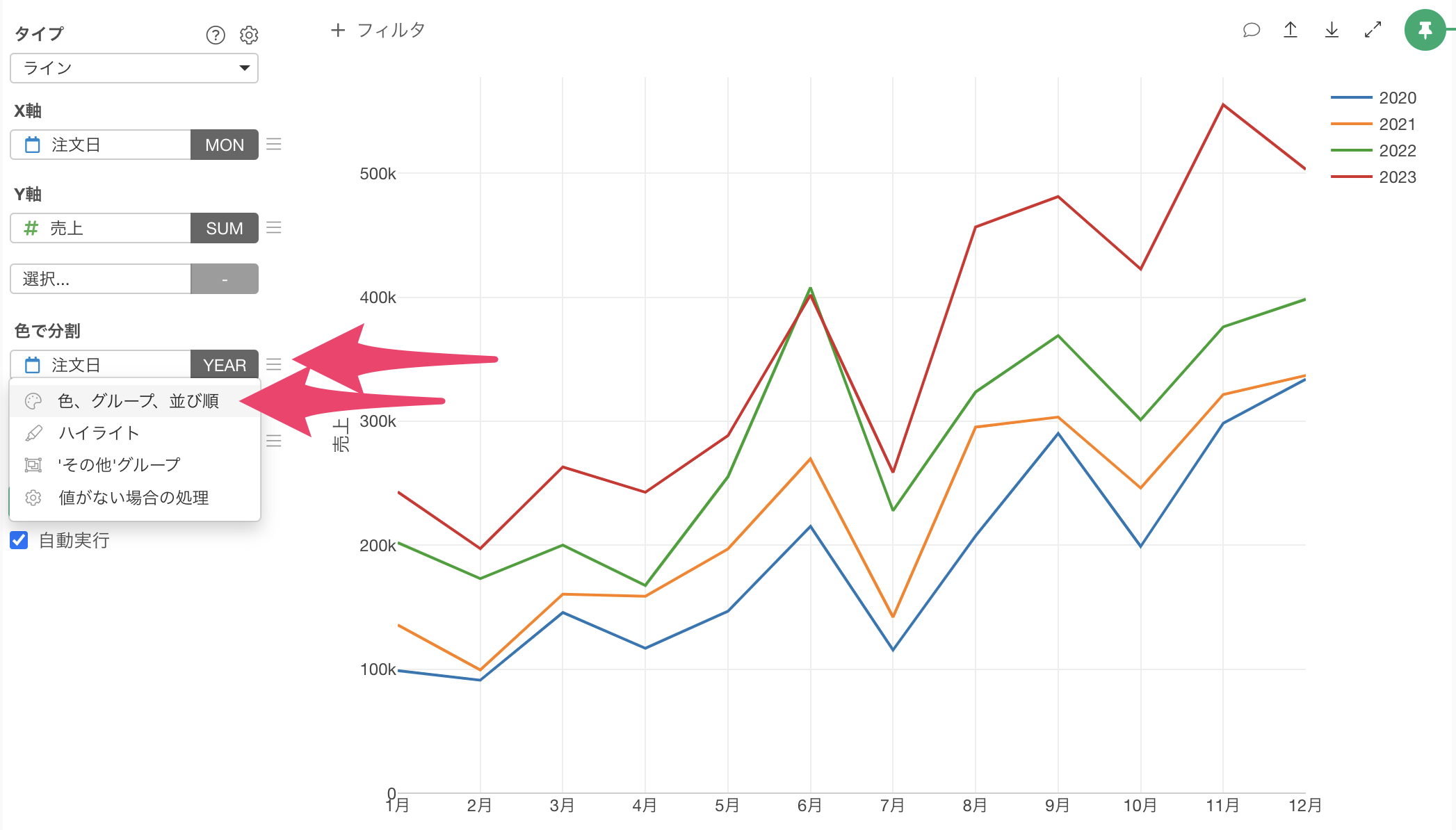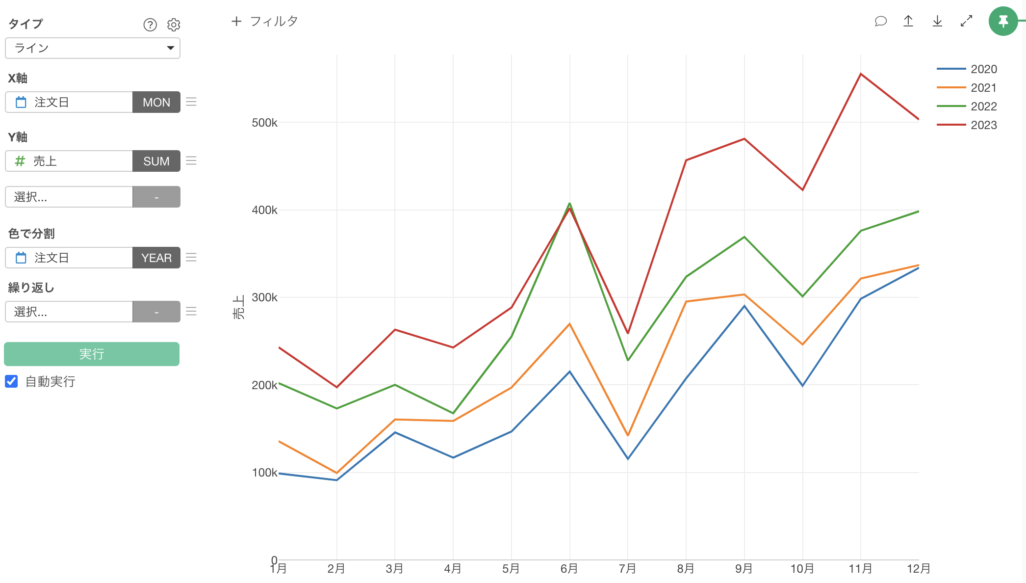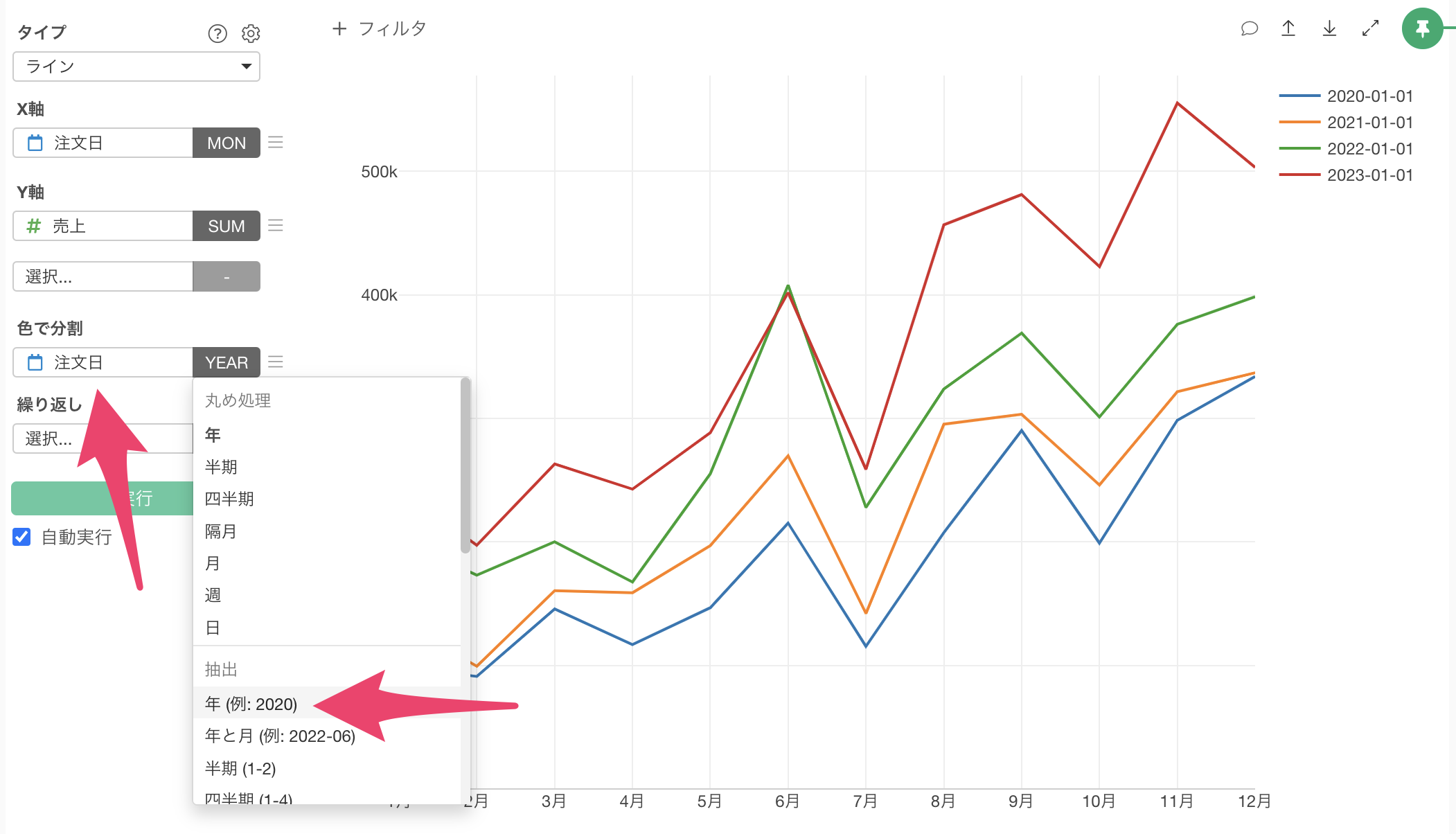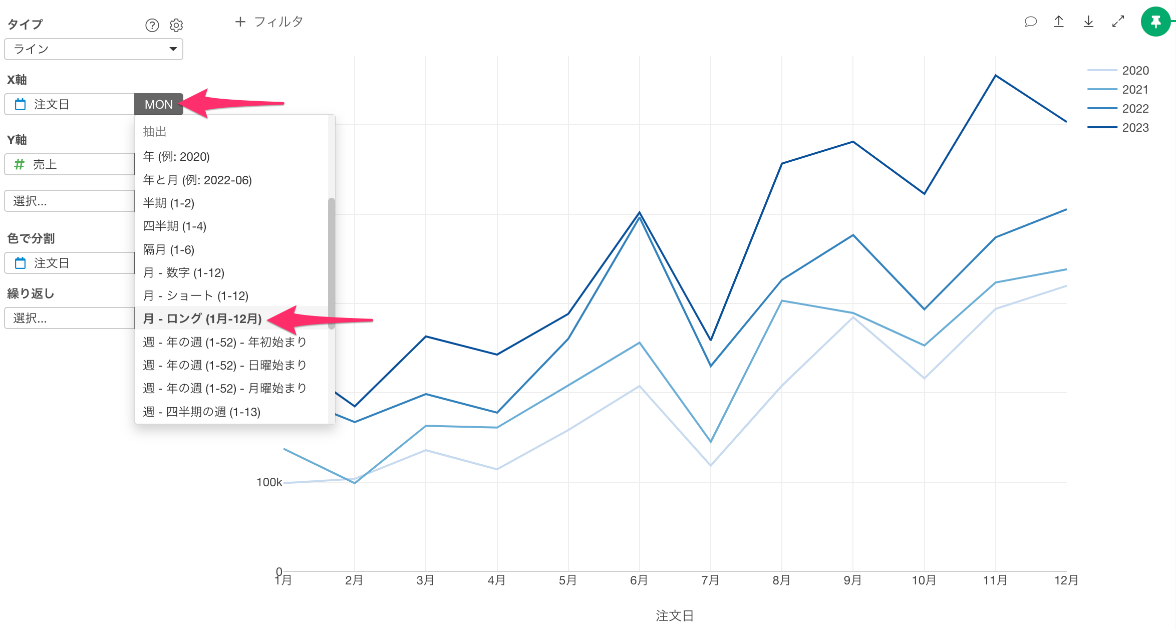 X軸に月の情報を抽出し、年で色分けすることで、1月から12月までの推移を年ごとに比較できるようになり、各月の経年変化や季節性を容易に把握することができます。