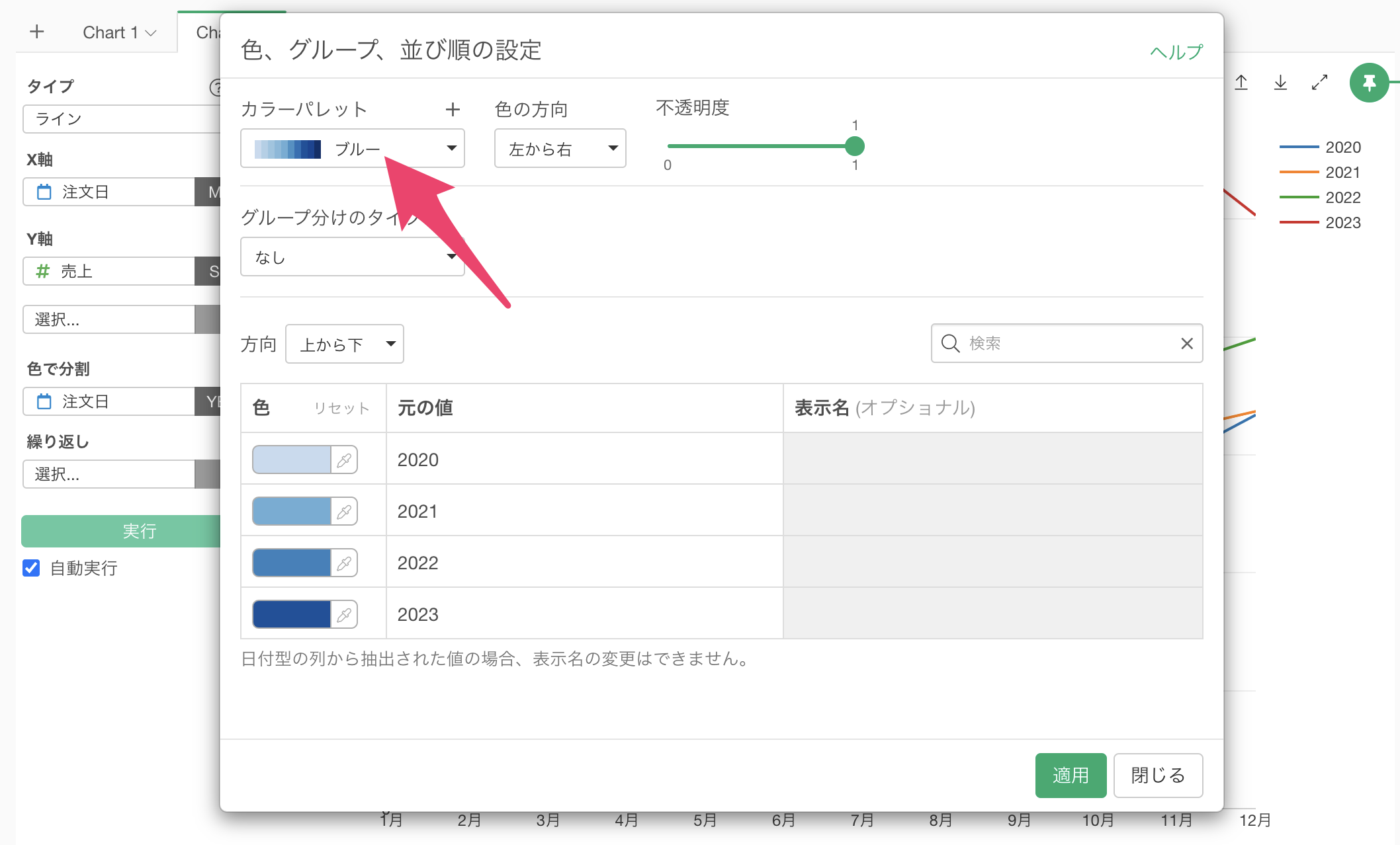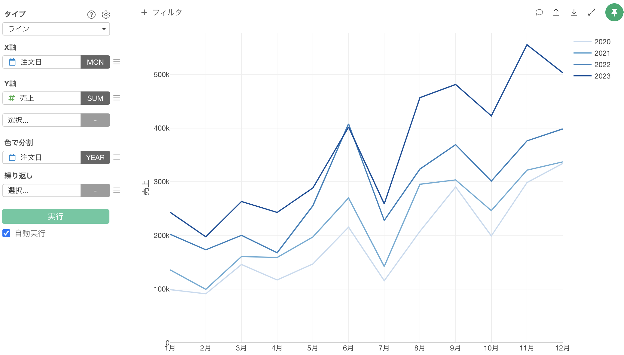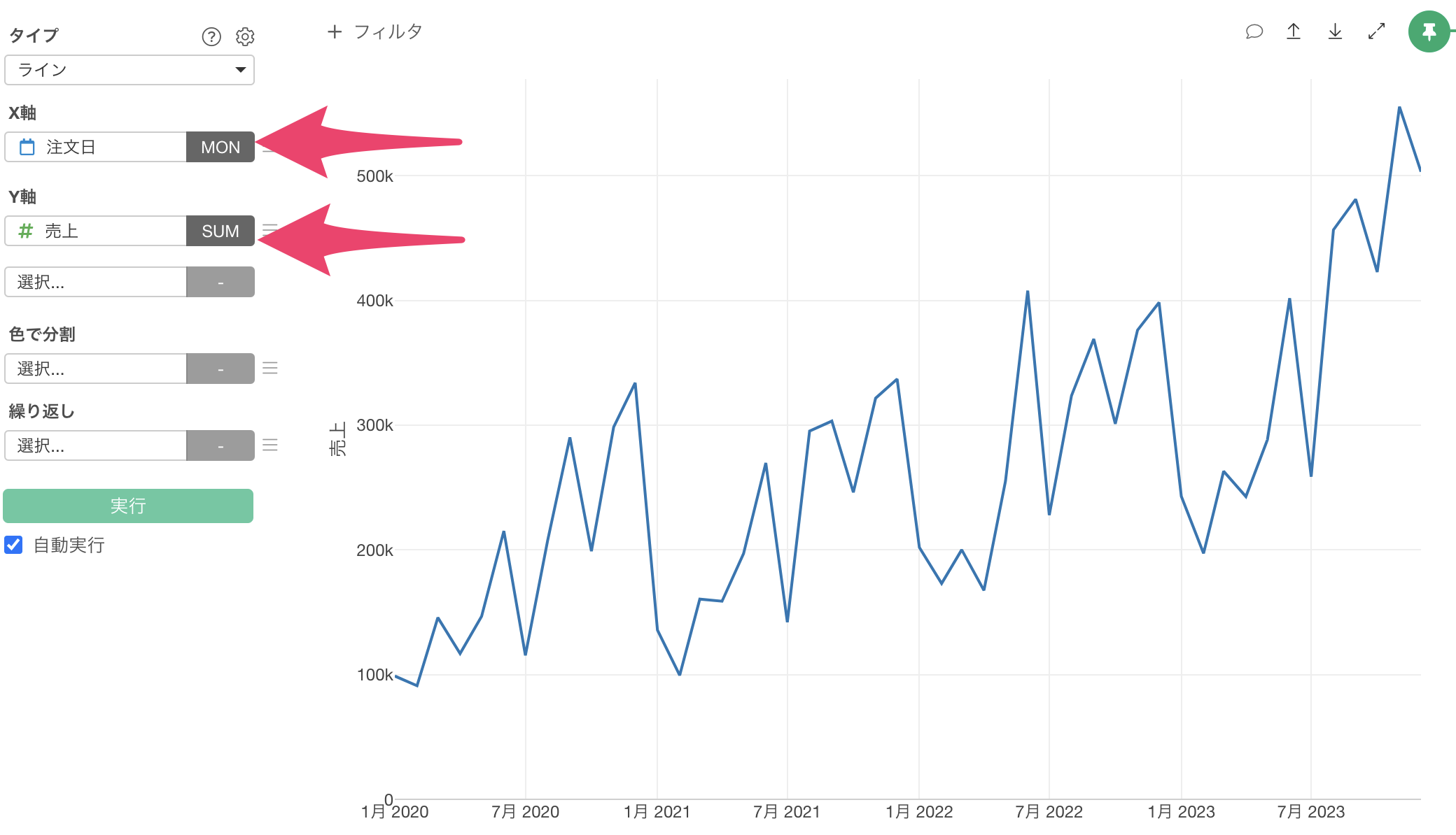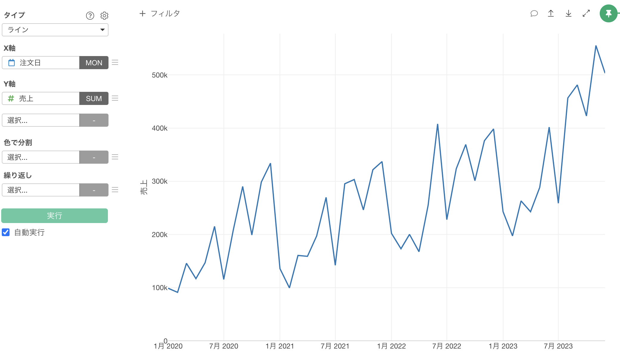 チャートビューに移動して、タイプに「ライン」を選択のうえ、X軸に「注文日」を選択し、日付の単位に「月」を選択し、Y軸に売上の合計値を指定します。