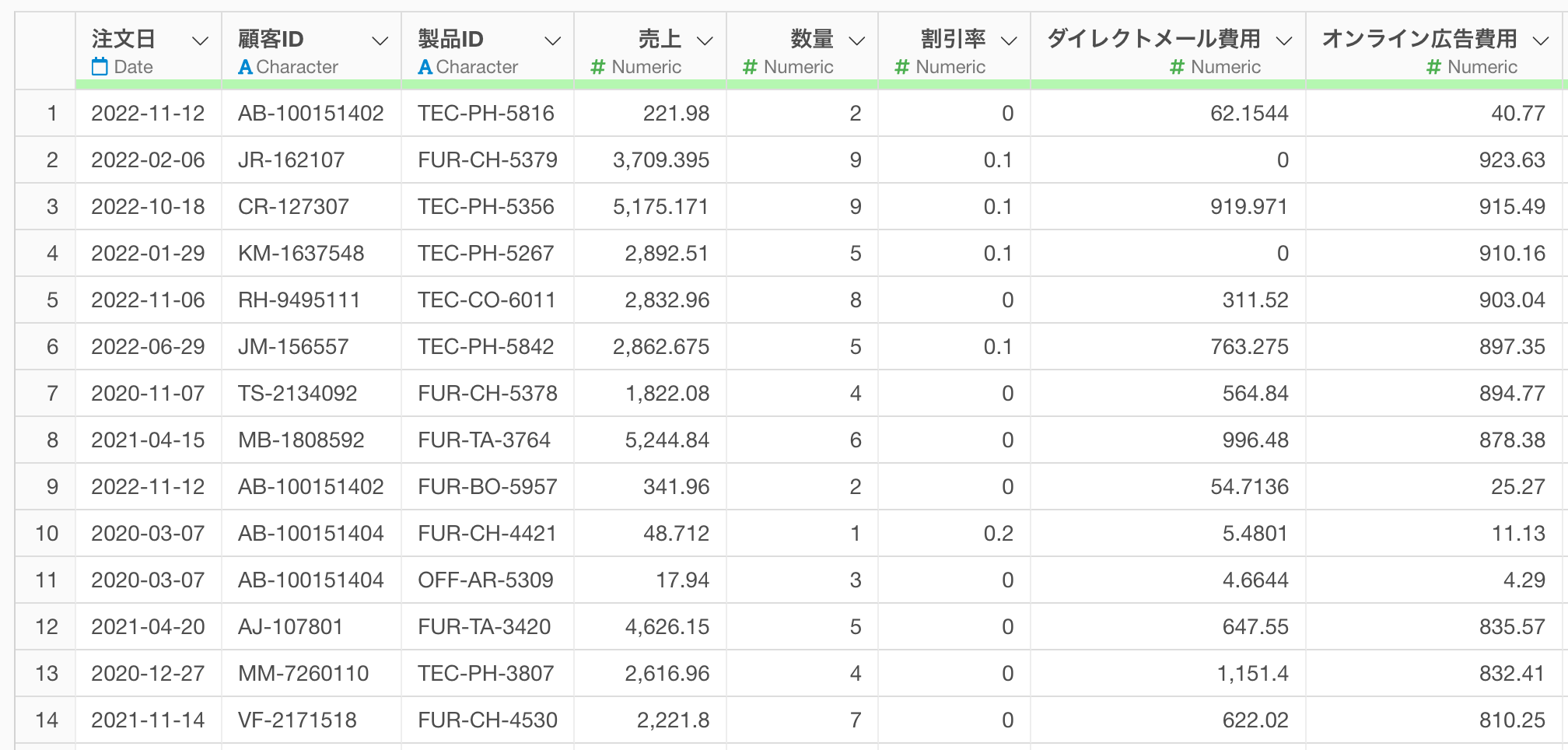 今回は1行が1つの注文を表し、列には顧客ID、注文日、商品情報、売上などの情報が含まれている注文データを利用します。