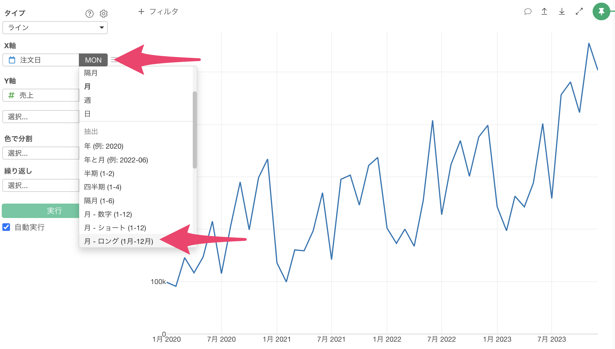X軸の注文日のスケールの下部の「抽出」メニューから「月(ロング)」を選択します。