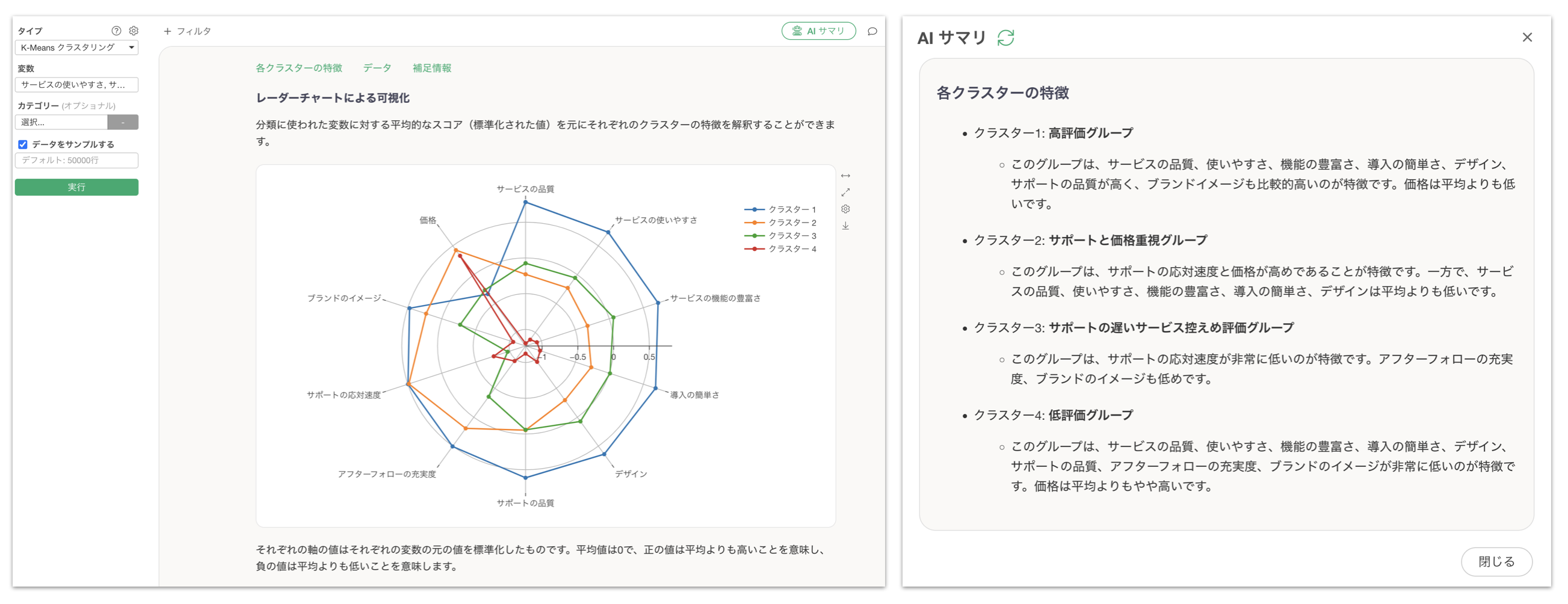 Exploratoryのバージョンv13から新たに追加されたAIサマリー機能を使用することで、K-meansクラスタリングで作成したクラスターごとの特徴を自動的に要約し、素早く結果を理解することが可能になります。この機能により、レーダーチャートや散布図などの複数のチャートを詳細に分析する前に、各クラスターの主要な特徴を瞬時に把握できるようになります。