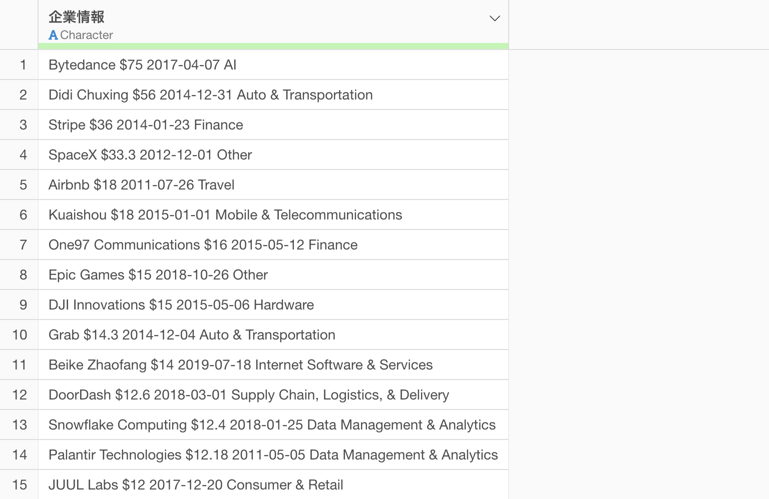 今回使用するデータは企業情報データであり、1つの列に企業名、時価総額、設立年月日、業界名の4つの情報が格納されています。