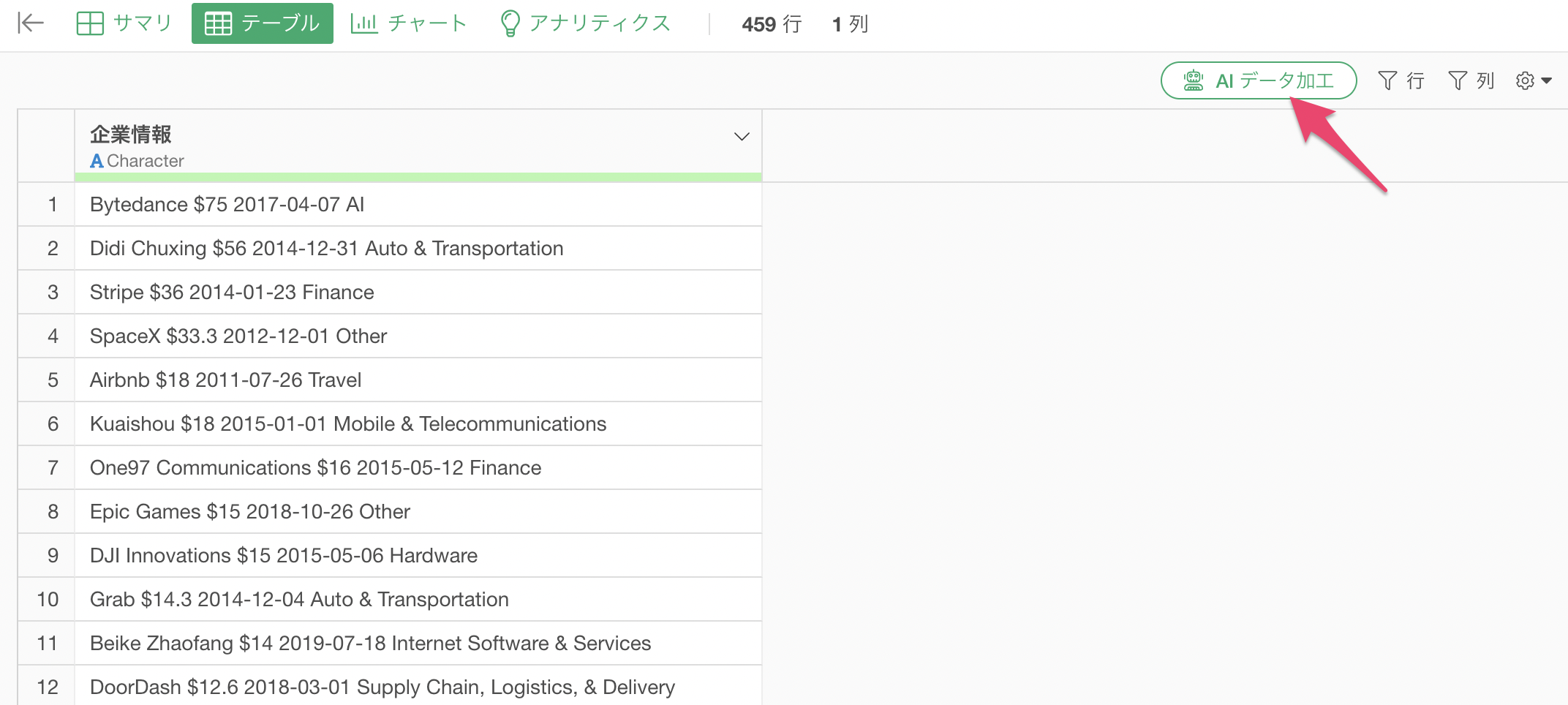 テーブル・ビューから「AI データ加工」のボタンをクリックします。