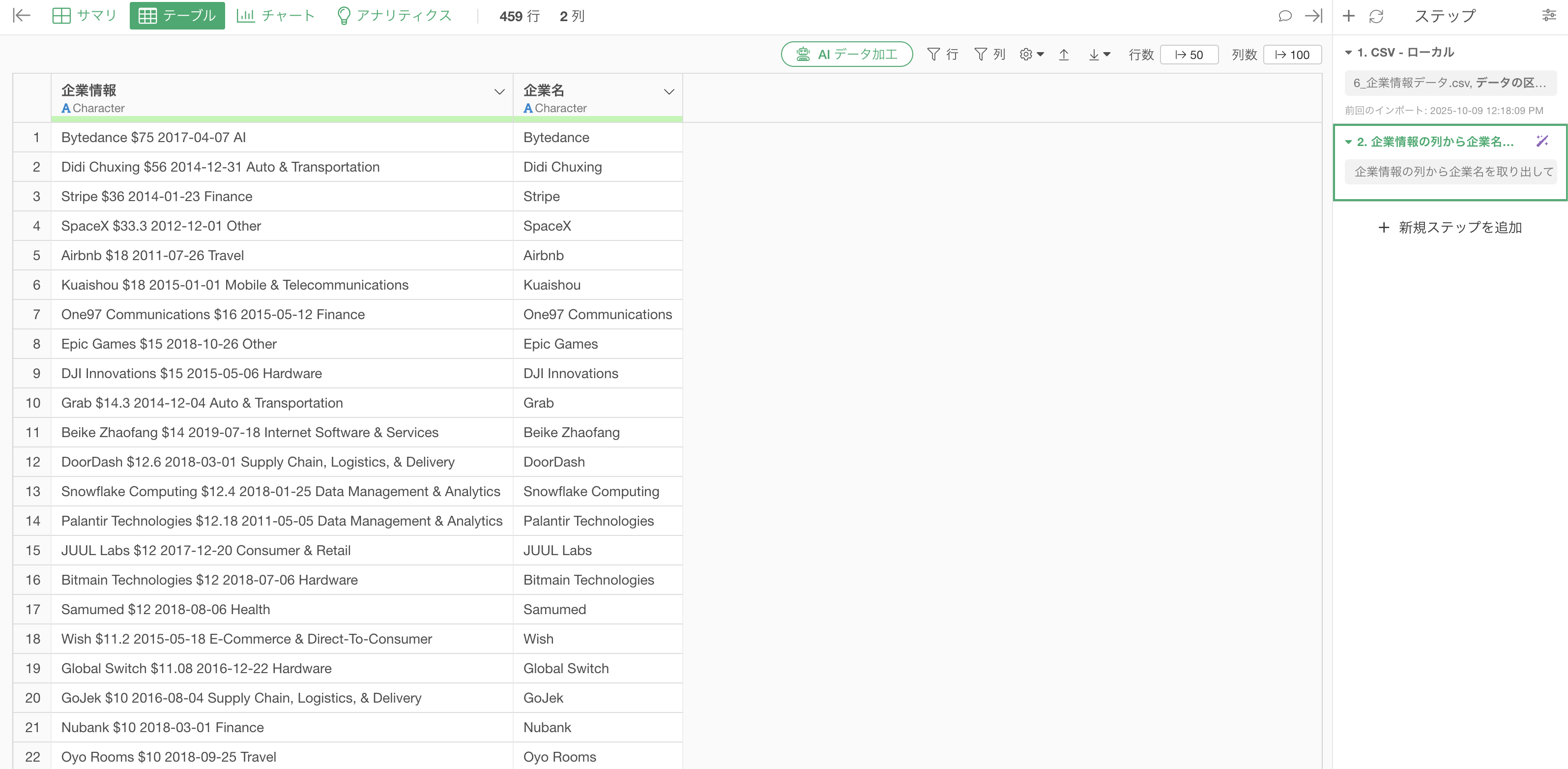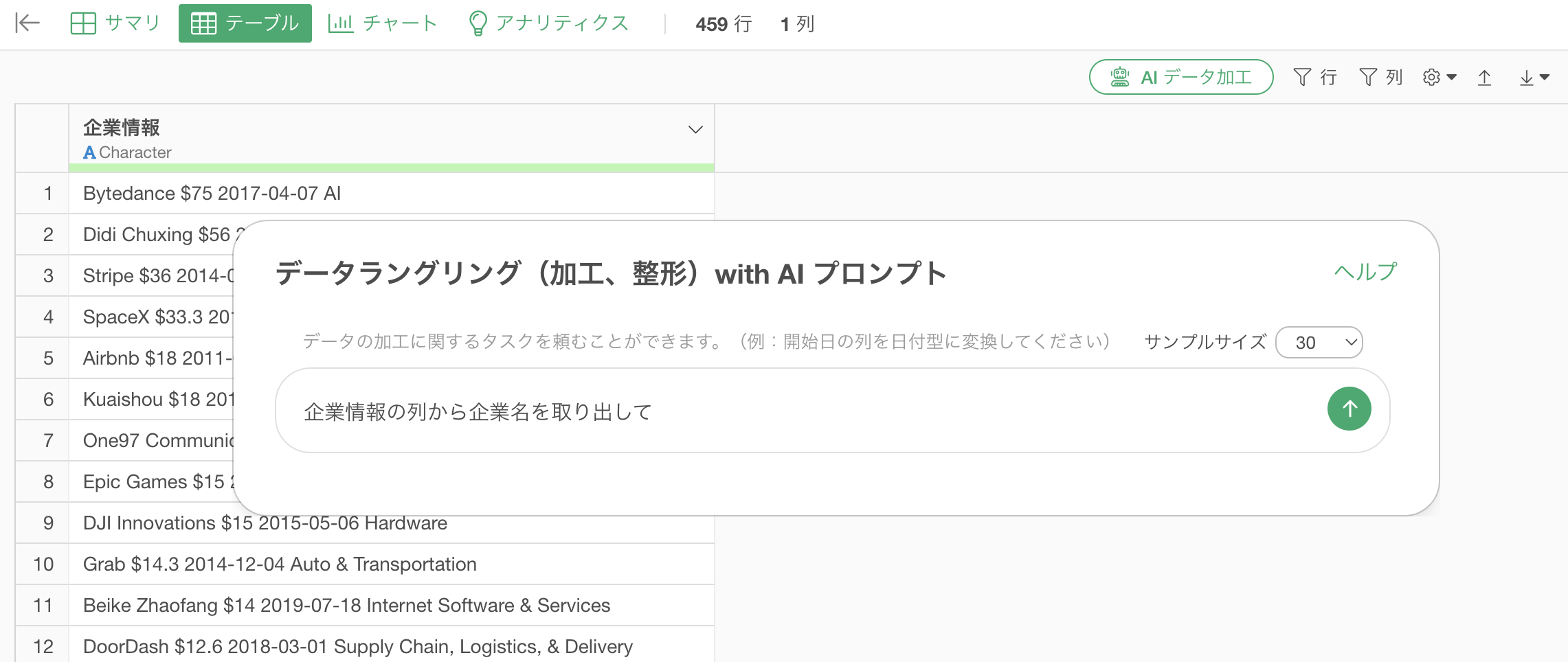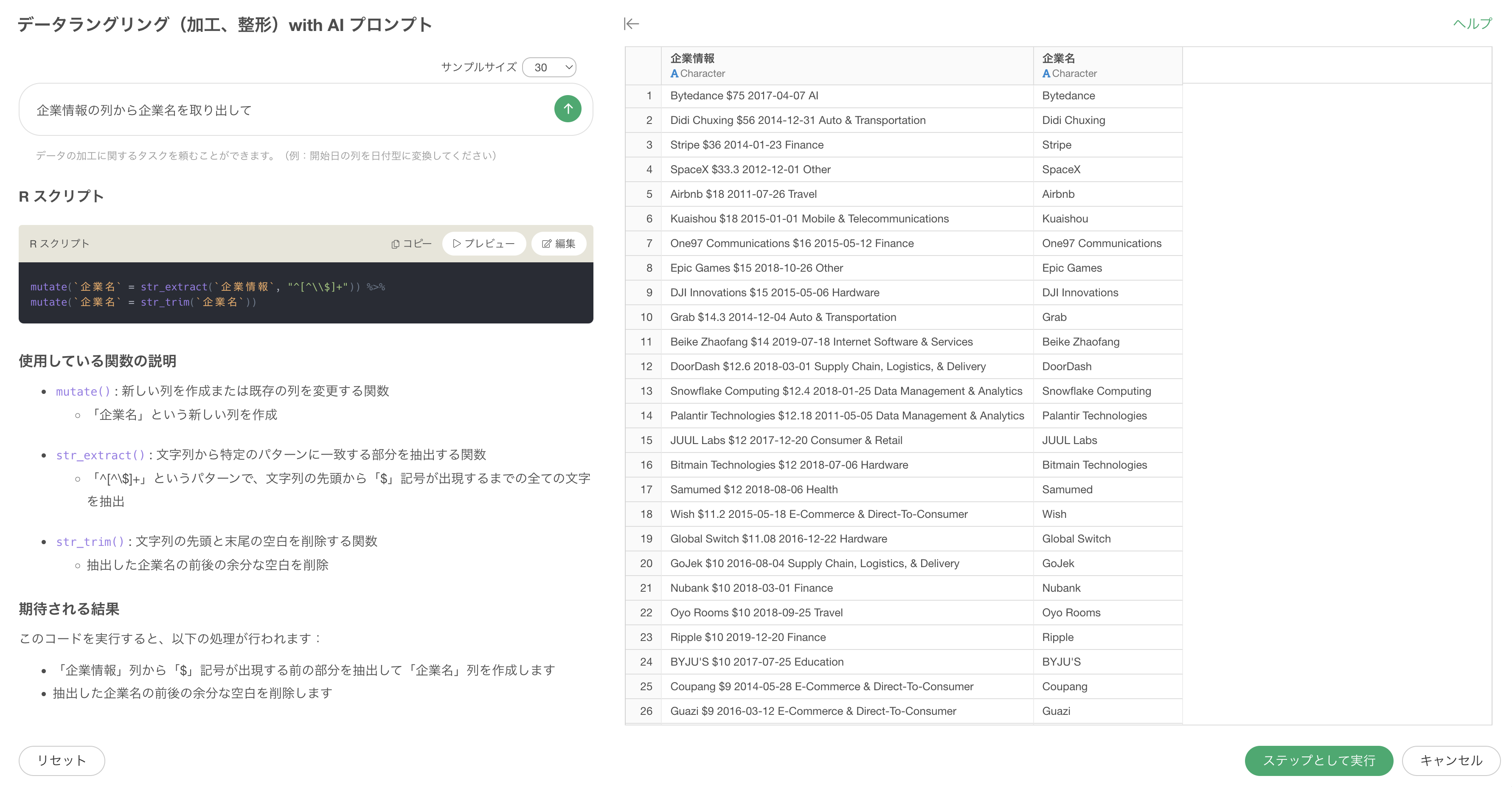 プロンプト入力欄に「企業情報の列から企業名を取り出す」と入力し、実行します。