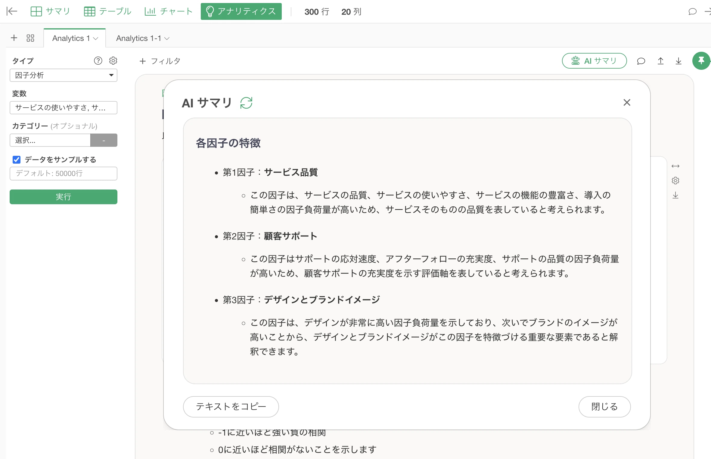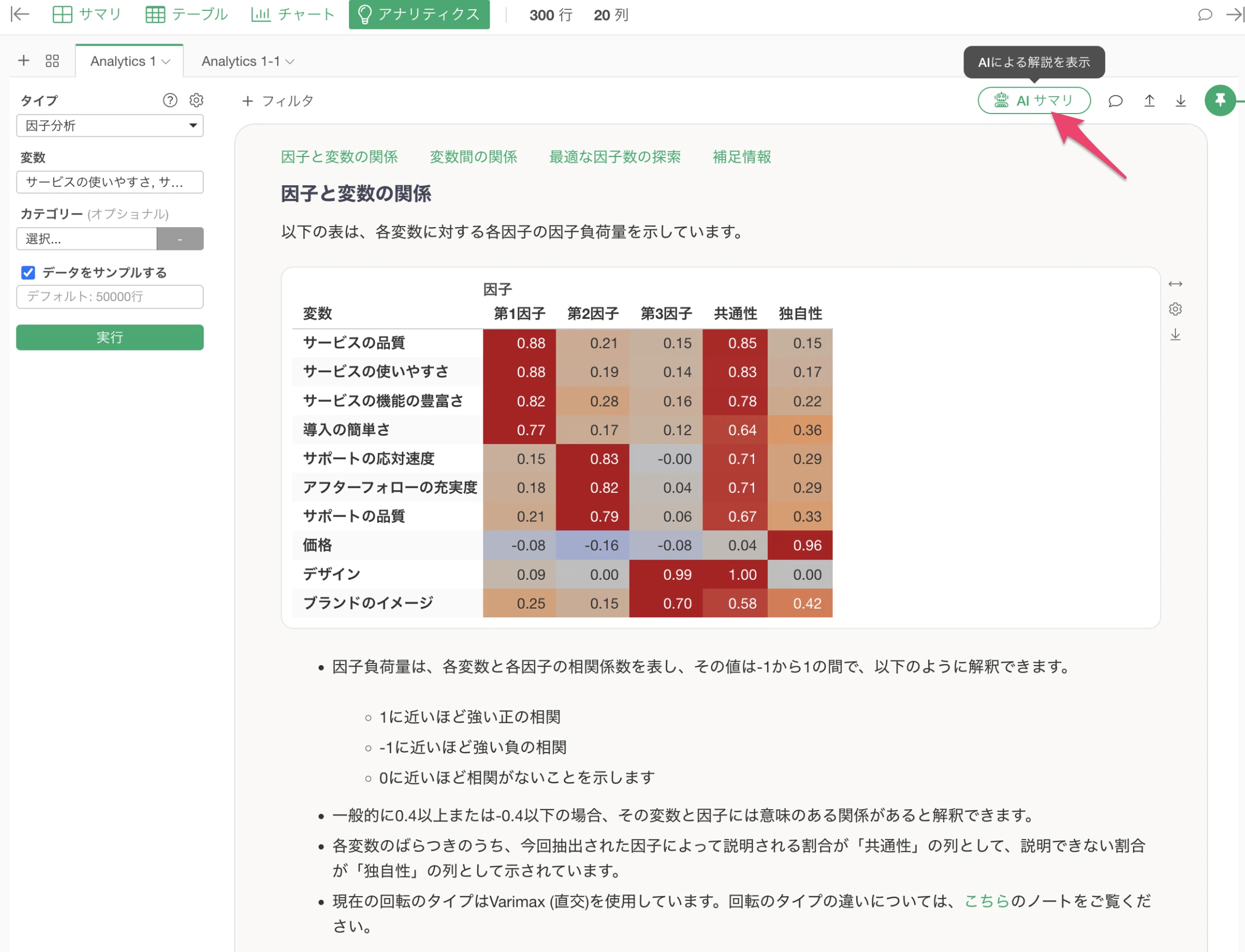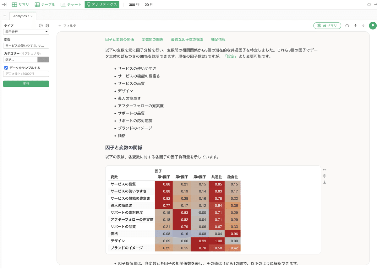 ちなみに、v13で新しく追加された**「AIサマリ」機能では、複雑な因子分析の結果を自動的に要約してくれます。使い方は驚くほど簡単で、因子分析を実行した後に「AIサマリ」のボタンを押すだけ**です。