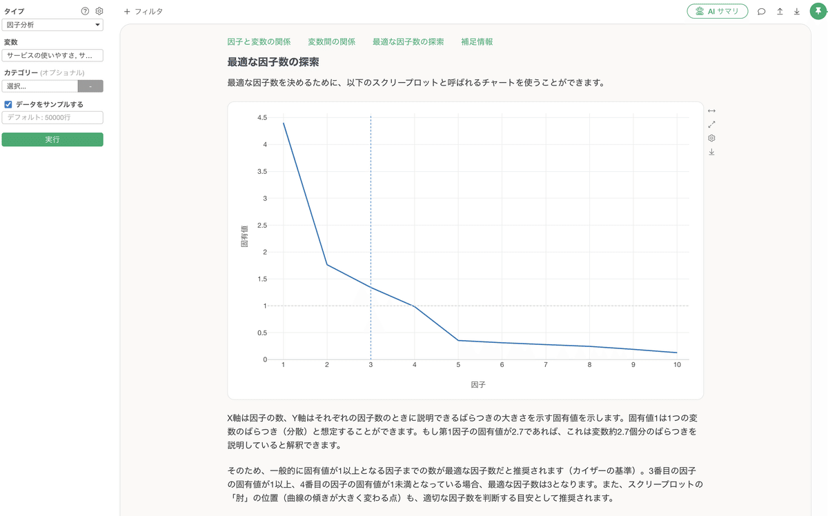 「肘」の位置や固有値1以上の基準について、ガイド付きのアナリティクスで分かりやすく説明されているため、専門知識がなくても適切な判断ができます。