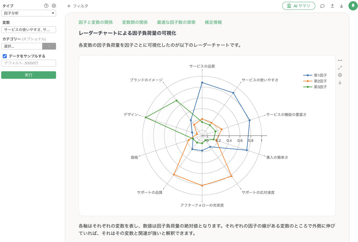 このチャートで、第1因子は「サービス品質」関連の変数で外側に伸び、第2因子は「サポート」関連で外側に伸びていることが一目で分かります。ガイド機能により、チャートの読み方も詳しく解説されているため、初心者でも安心して解釈できます。