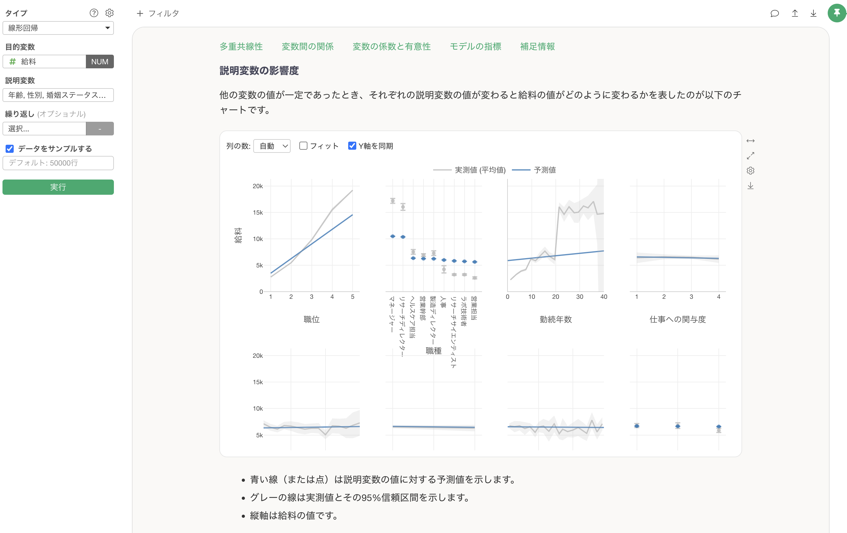 Exploratoryでは、線形回帰やロジスティック回帰といった統計の予測モデルや、ランダムフォレストやXGBoostといった機械学習系の予測モデルがサポートされており、これによって多変量分析を行うことが可能です。
