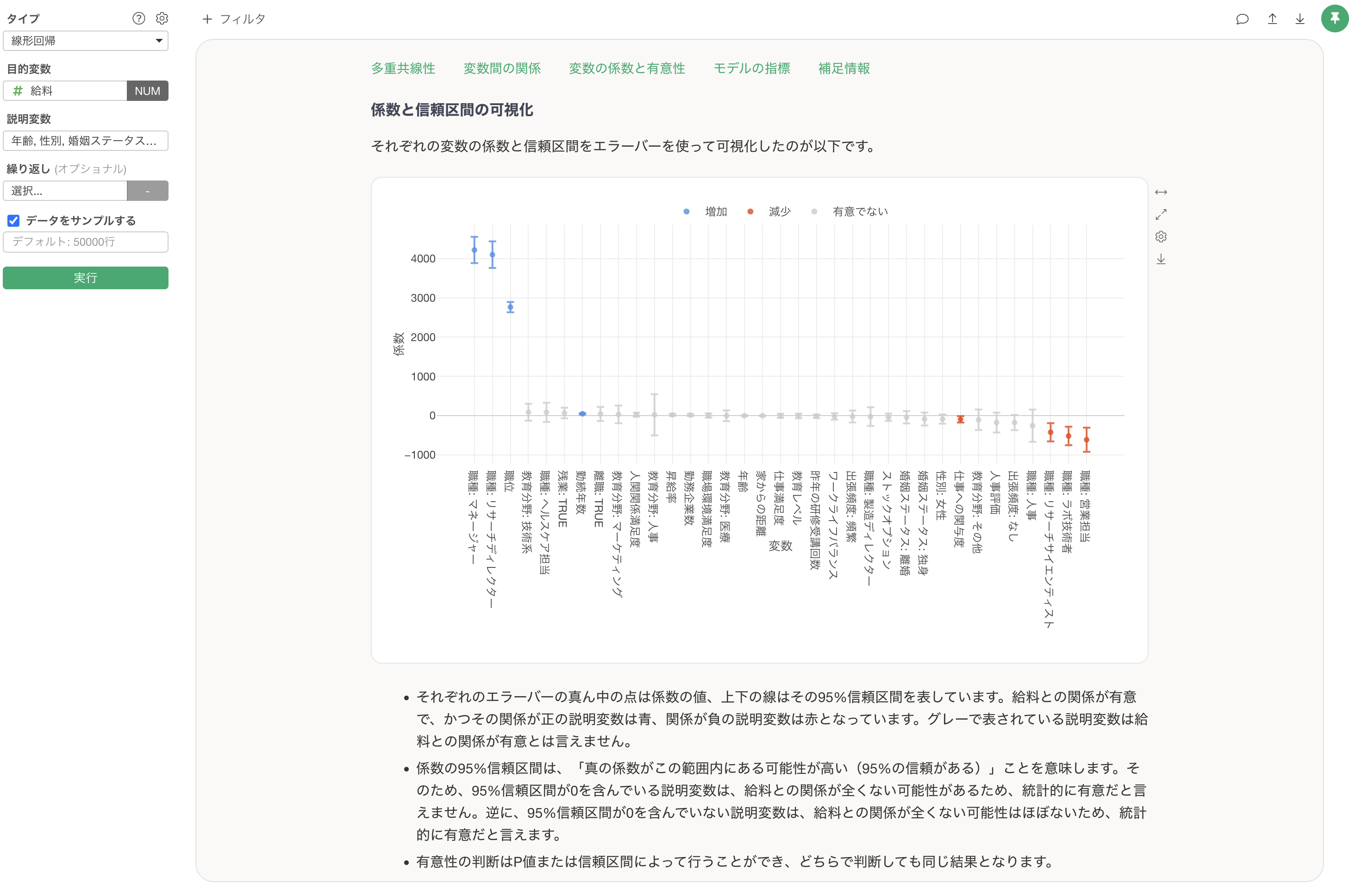 統計の予測モデル(例: 線形回帰、ロジスティック回帰)では、係数における信頼区間が表示されます。この係数の信頼区間による読み取り方についても、モデルの種類に応じて詳しく解説されるため、統計の専門知識がなくても適切に結果を解釈することができます。