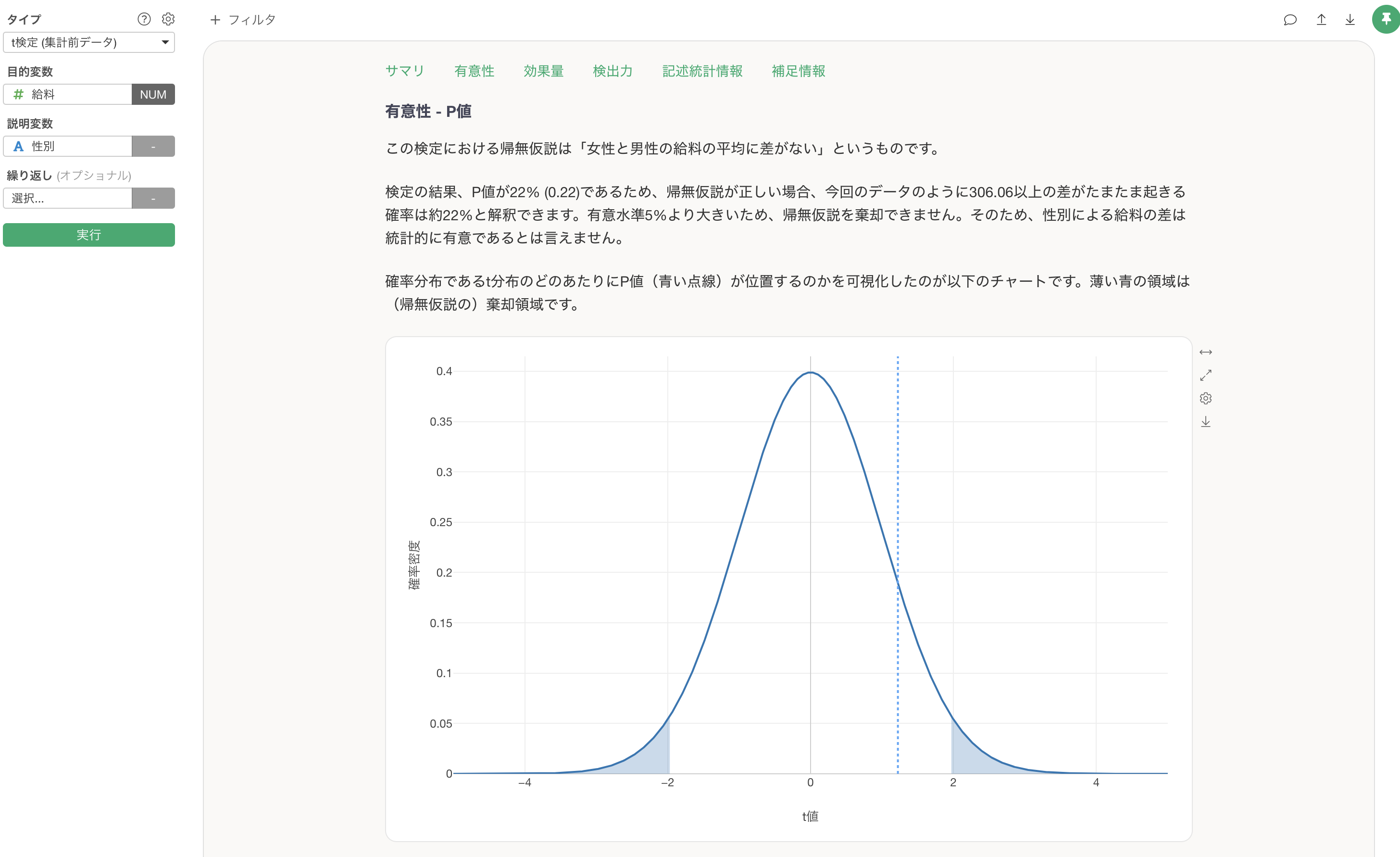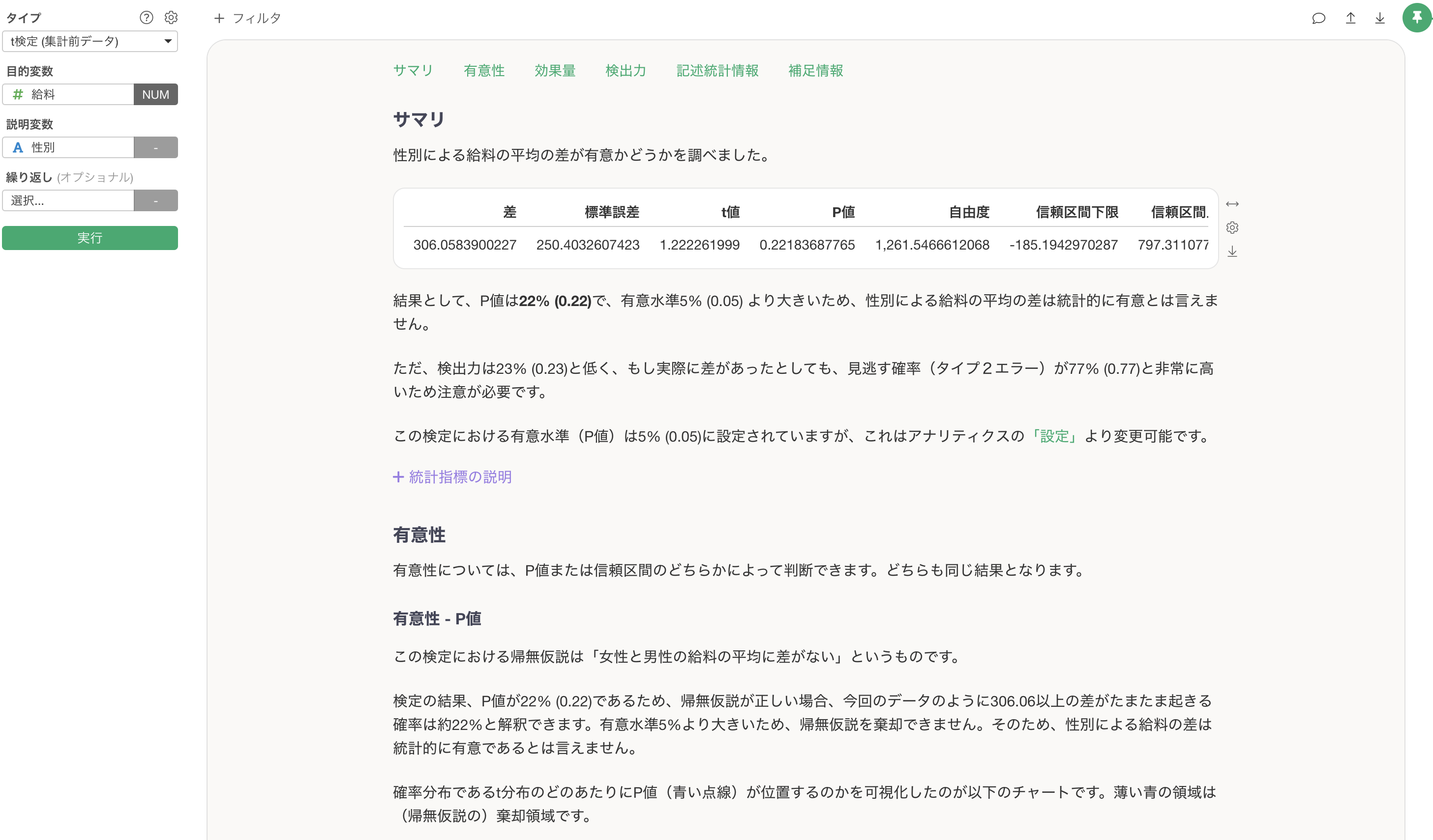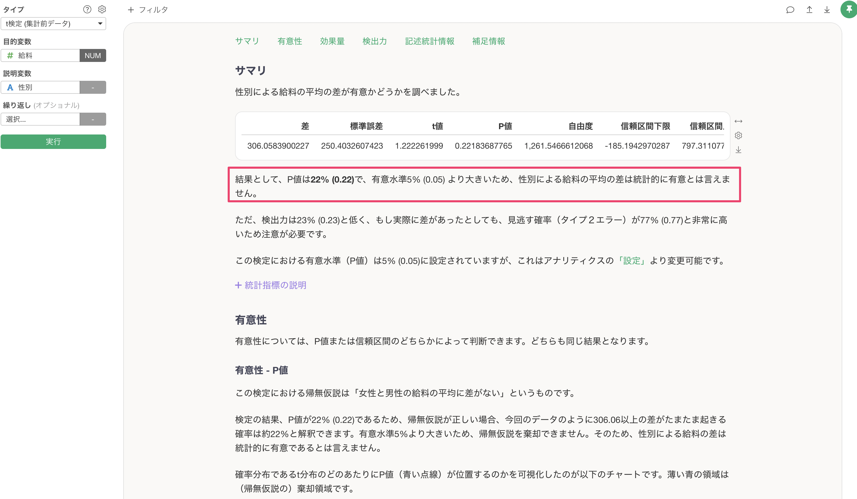 そもそも有意性やP値が何かといった説明については、「有意性 - P値」のセクションにて説明されるようになっています。