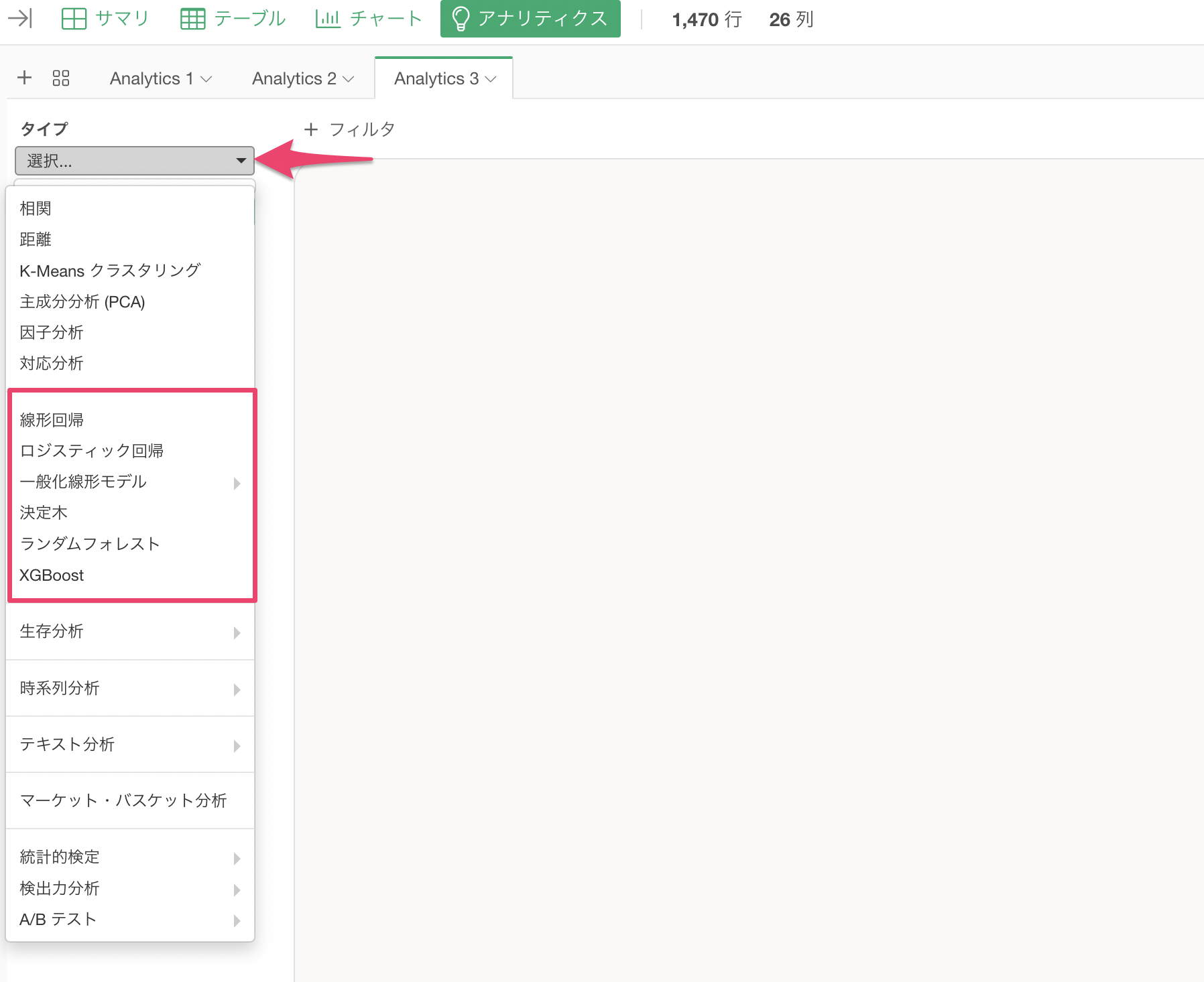 そこで、v13で追加された「**ガイド付きアナリティクス」**の機能では、分析結果を初心者でも理解できるよう、各チャートの見方や分析手法に関する詳細な説明が自動で表示されるようになっています。
