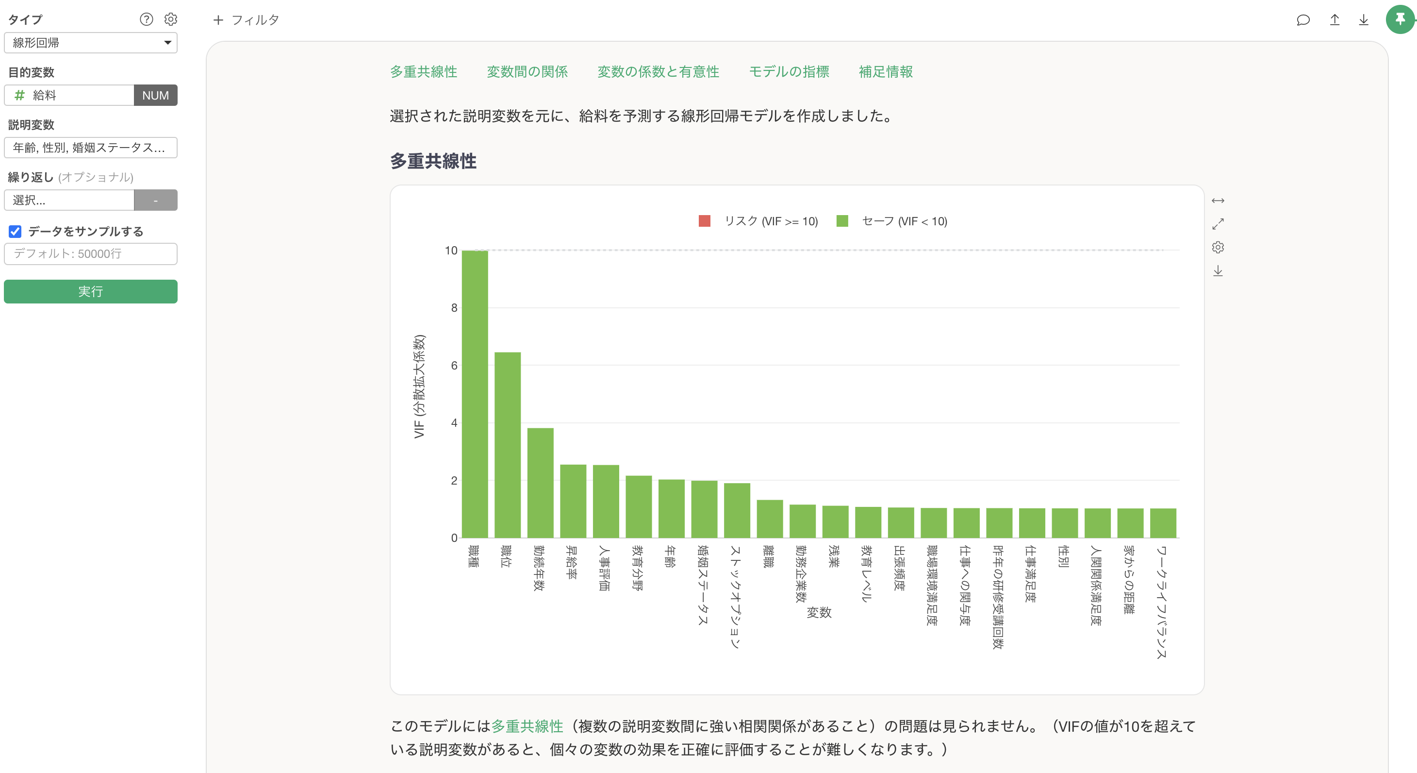 例えば、線形回帰などの回帰系の予測モデルを行う際には、相関が強すぎる説明変数を同時に選ぶと「多重共線性」といった問題が発生してしまいますが、そういった問題があったときには適切なガイドが表示されるようになっています。