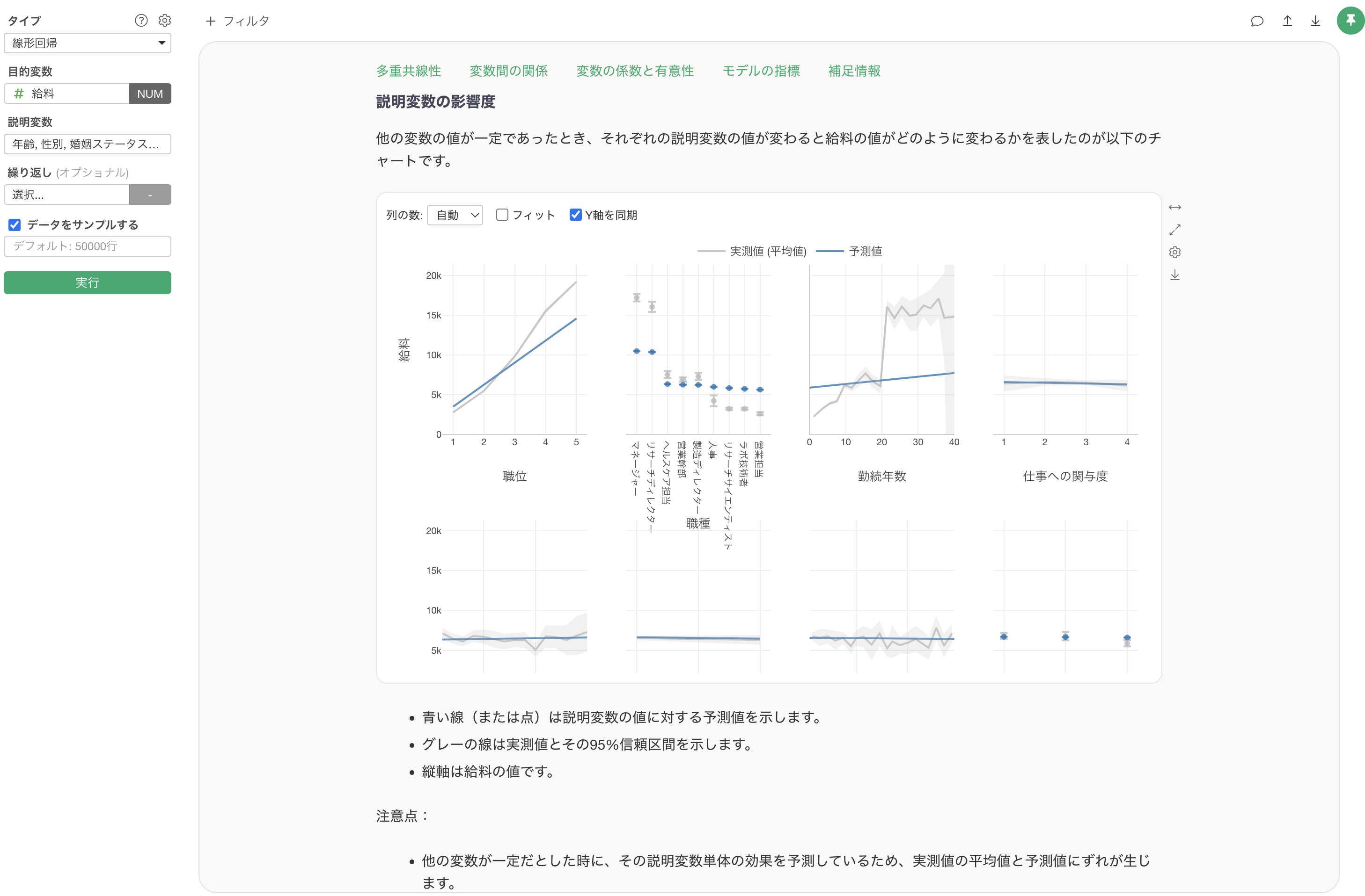 多変量分析を行った際には、実測値と予測値の結果を「説明変数の影響度」の下でチャートが表示されるようになっています。このチャートの結果をどのように読み取っていくのかも、注意点などを交えて詳しく説明がされます。