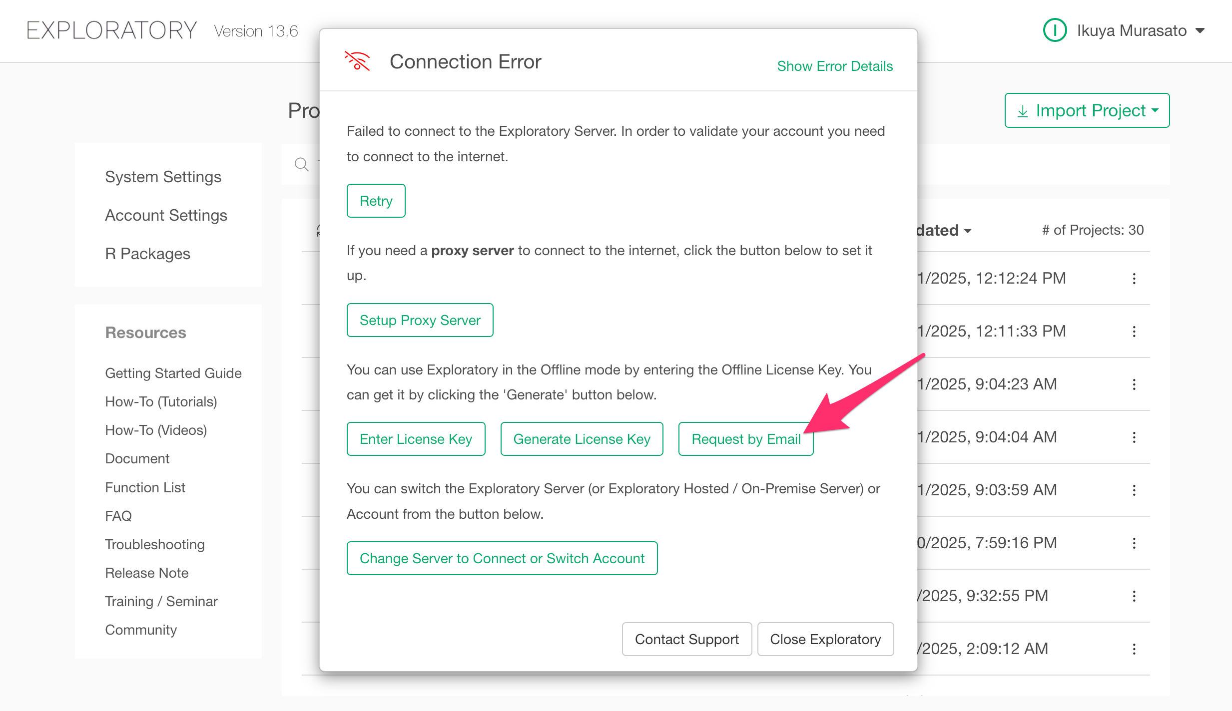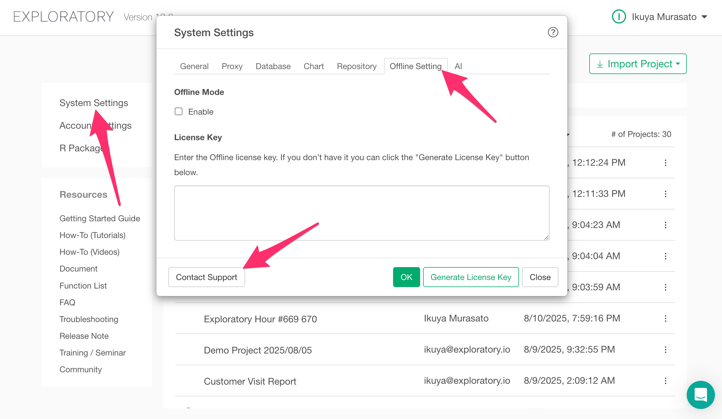 Once you start Exploratory, go to System Settings, Offline Setting and Contact Support.