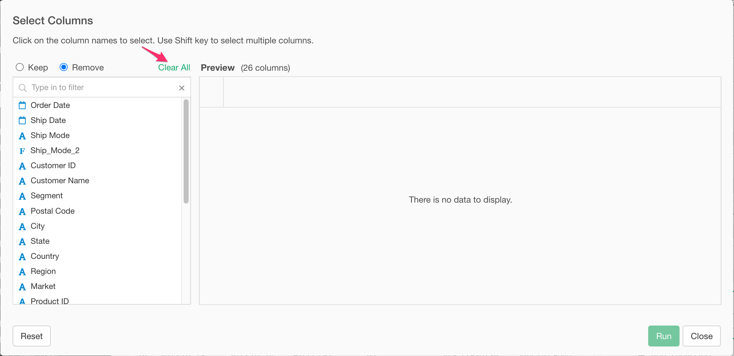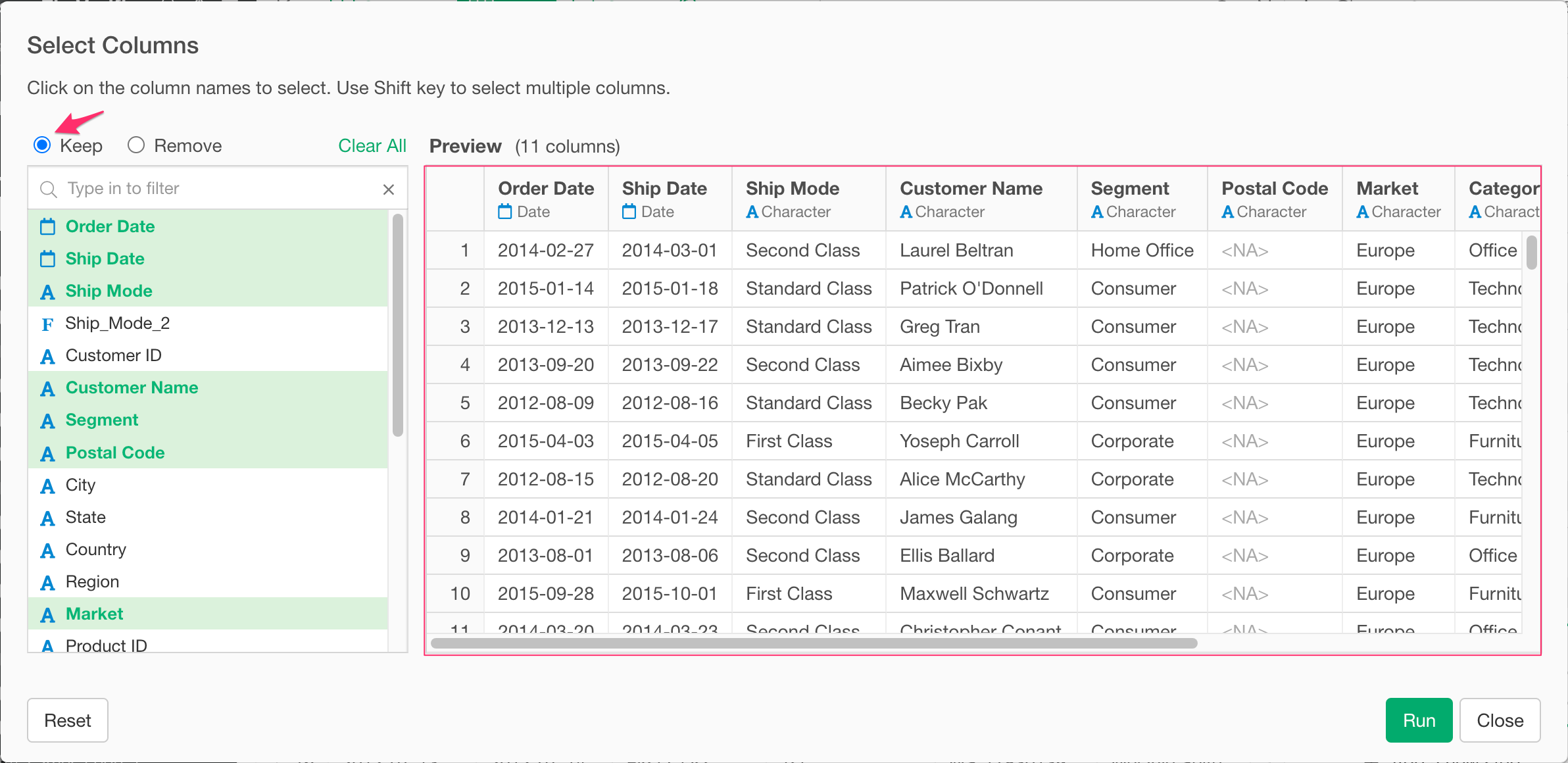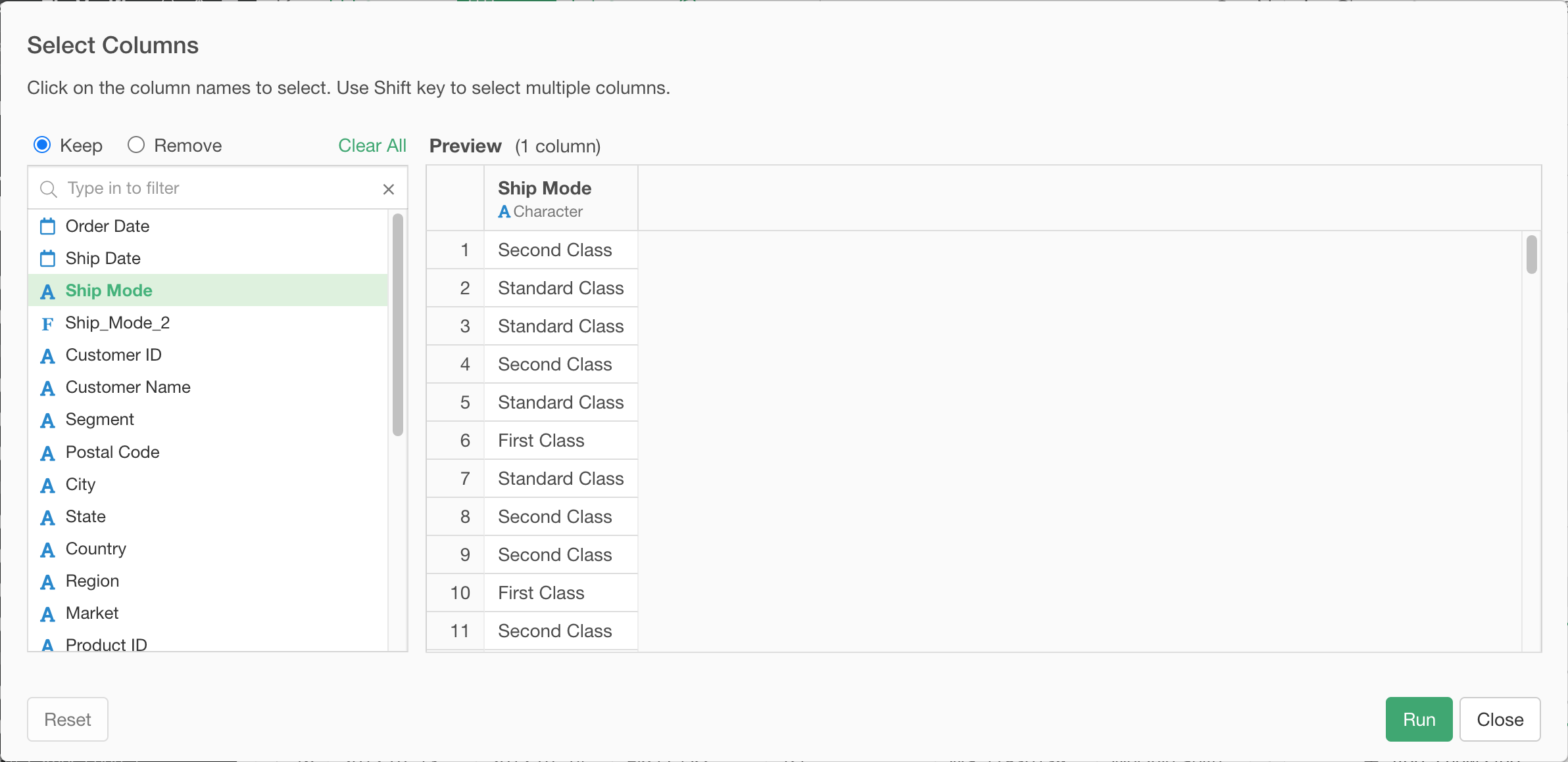 When you want to select and keep the necessary columns, check "Keep" and select the columns you want to keep.