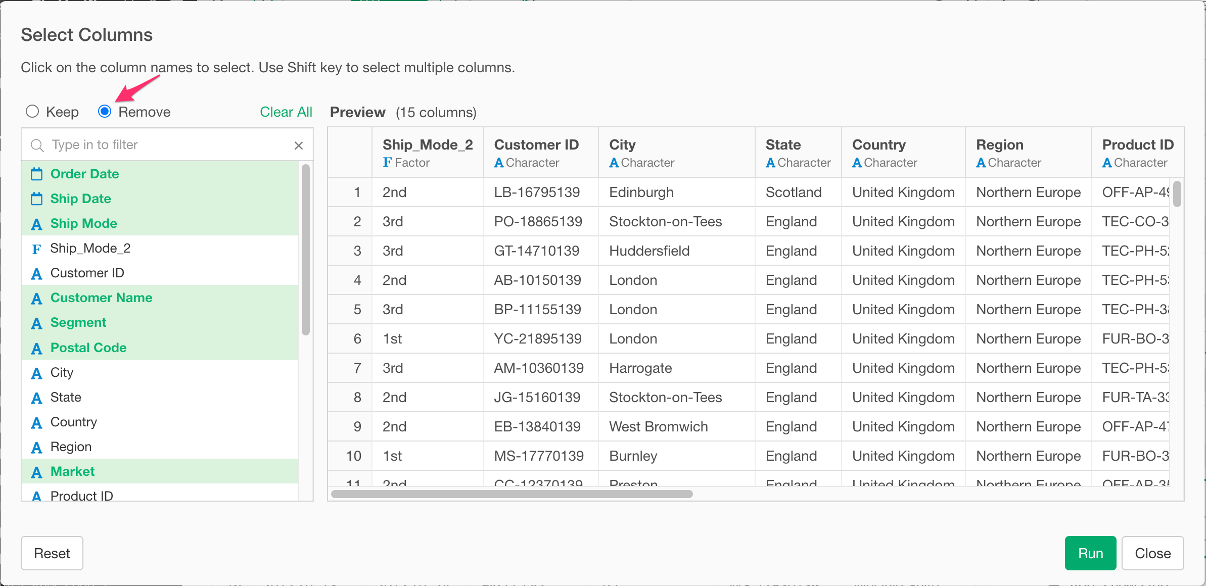 When you select "Select (Remove) Columns," a dialog box will appear allowing you to keep the necessary columns or remove the unnecessary columns.