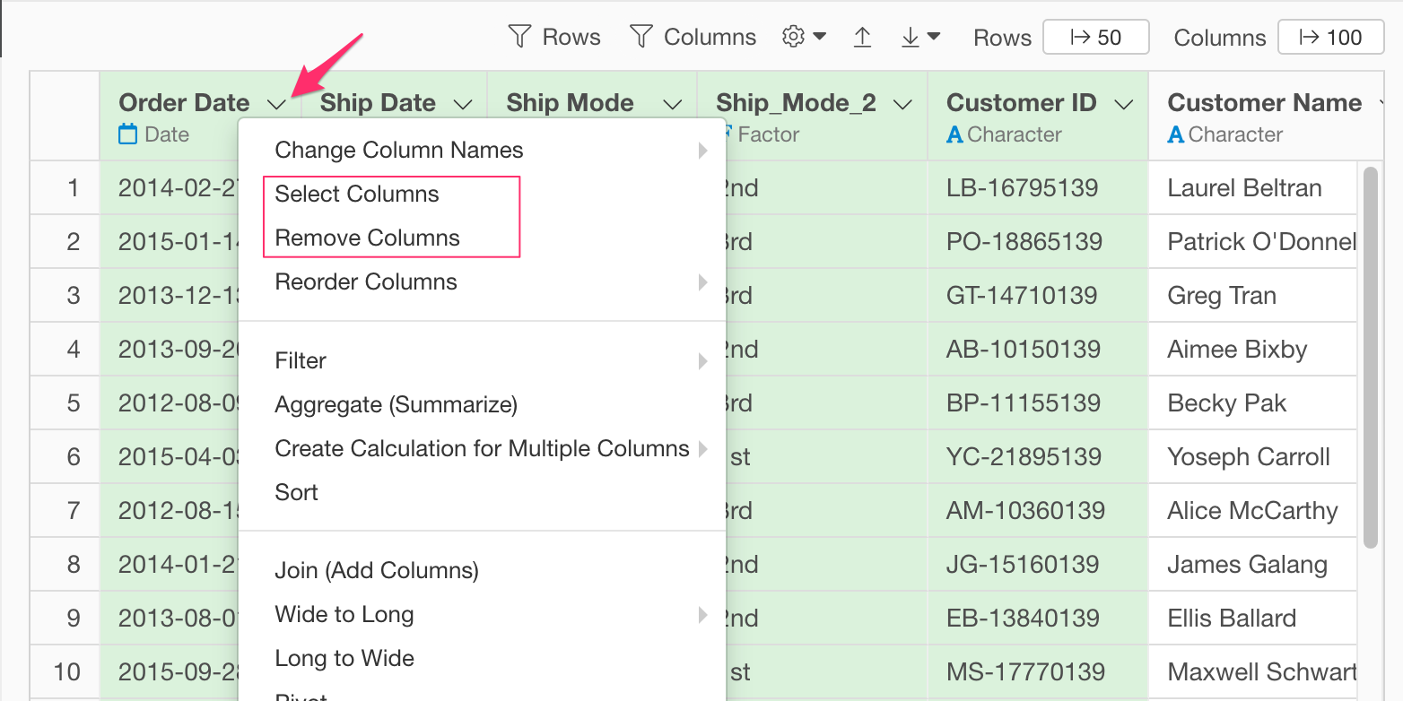 When you want to keep only the necessary columns or delete unnecessary columns from the imported data, select "Select (Remove) Columns" from the desired column header menu.