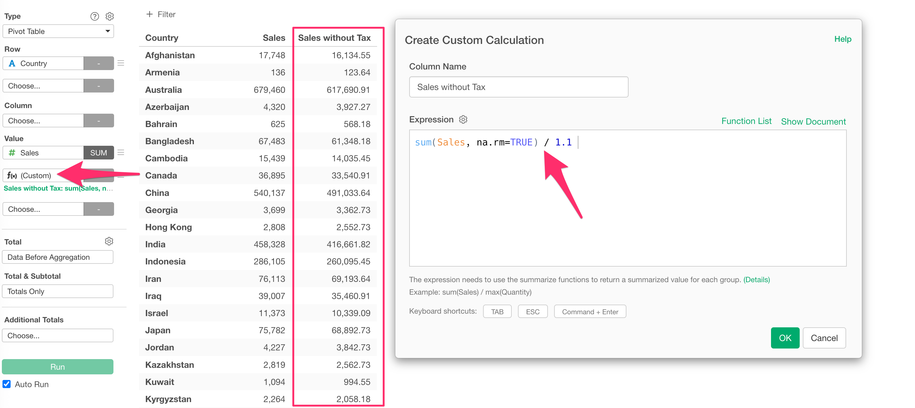 This will display the Custom Calculation dialog, which works the same way as in the chart example above.