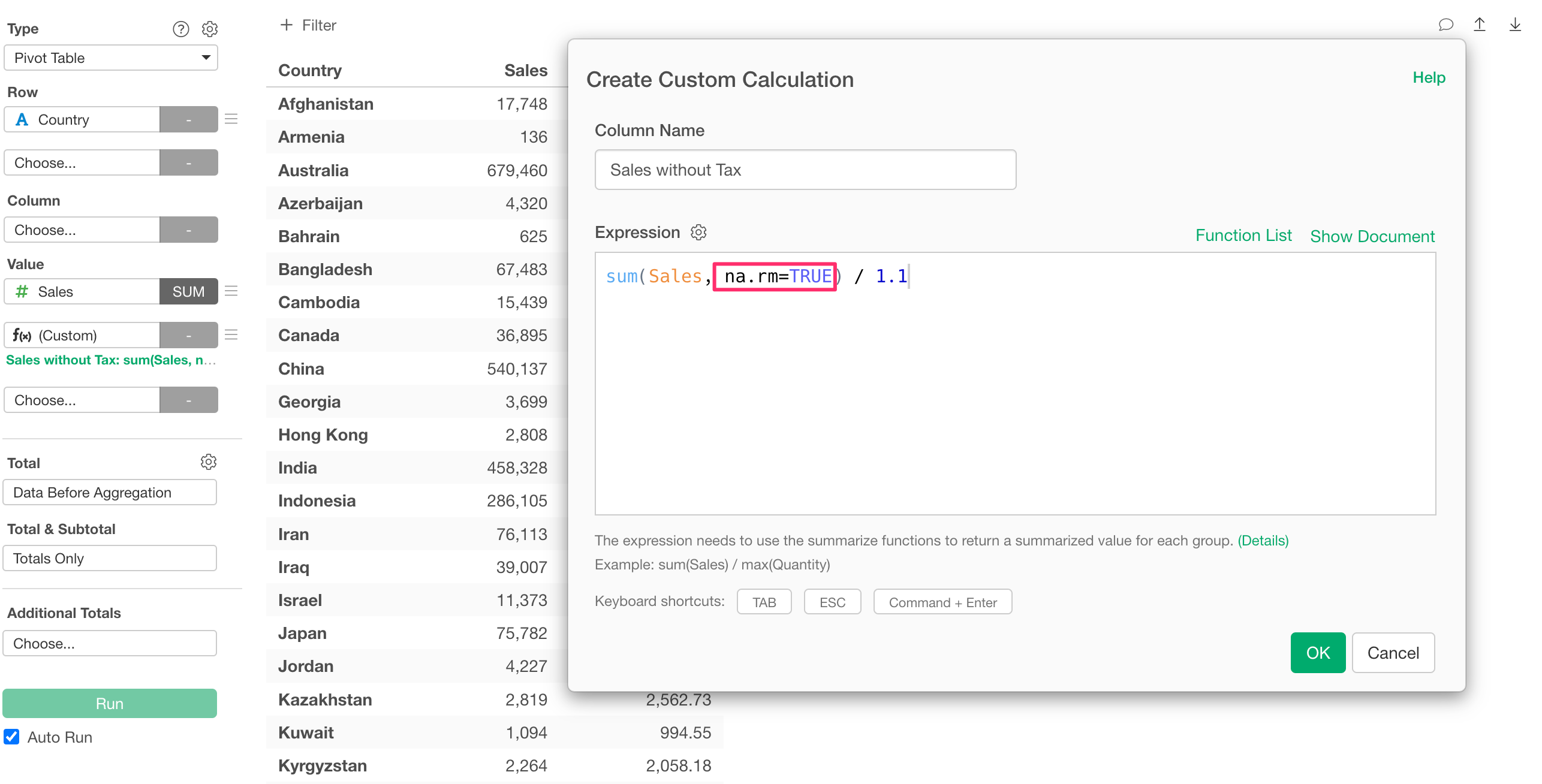 na.rm=TRUE or the result will be missingWhen using custom calculations in charts or pivot tables, if the data being aggregated contains missing values, simply using an aggregation function may not display results.