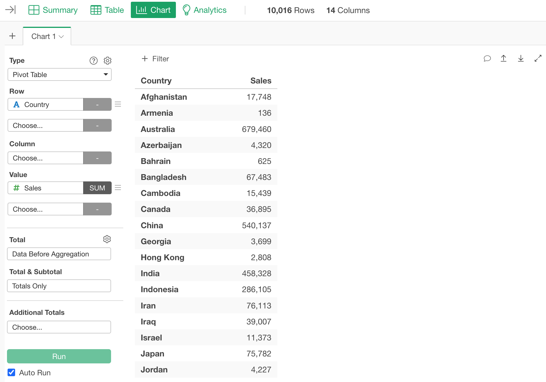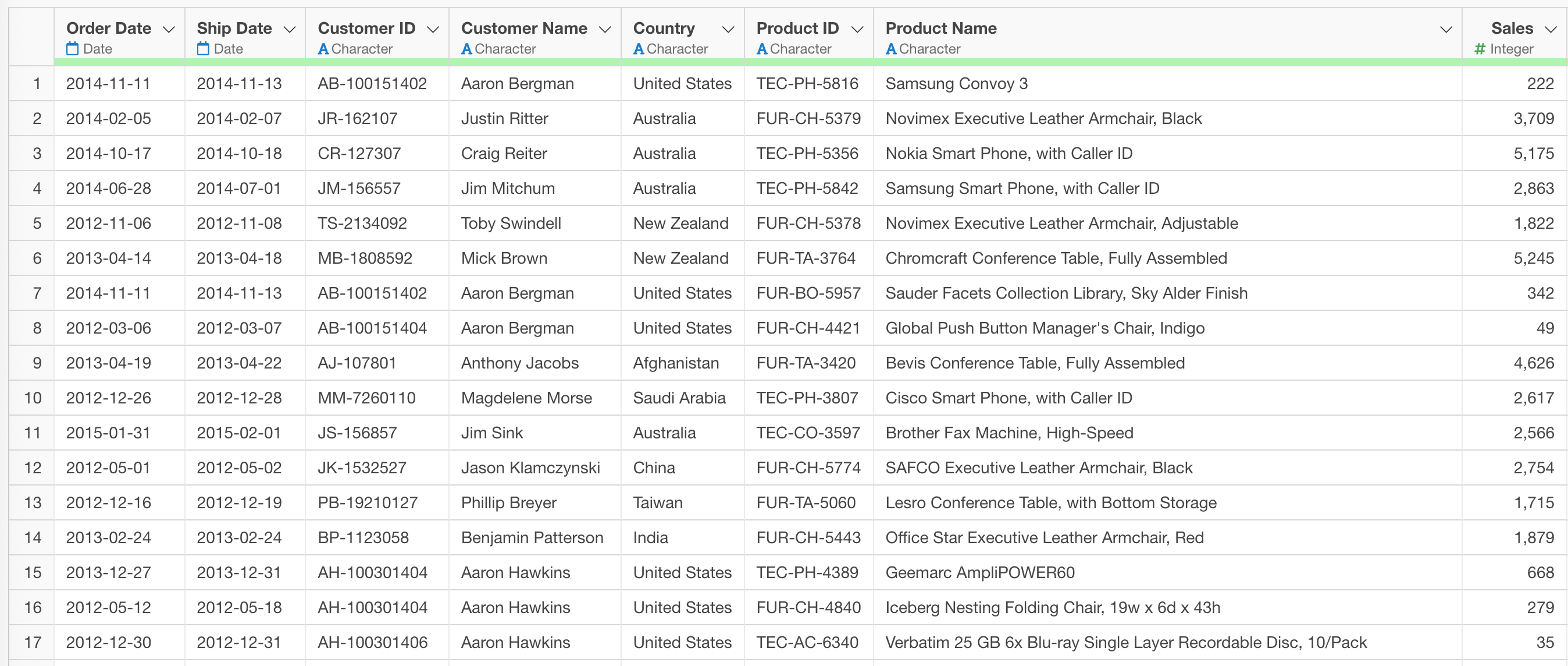 In this example, each row represents a single order detail, with columns containing the country of sale, sales amount, and other order information.