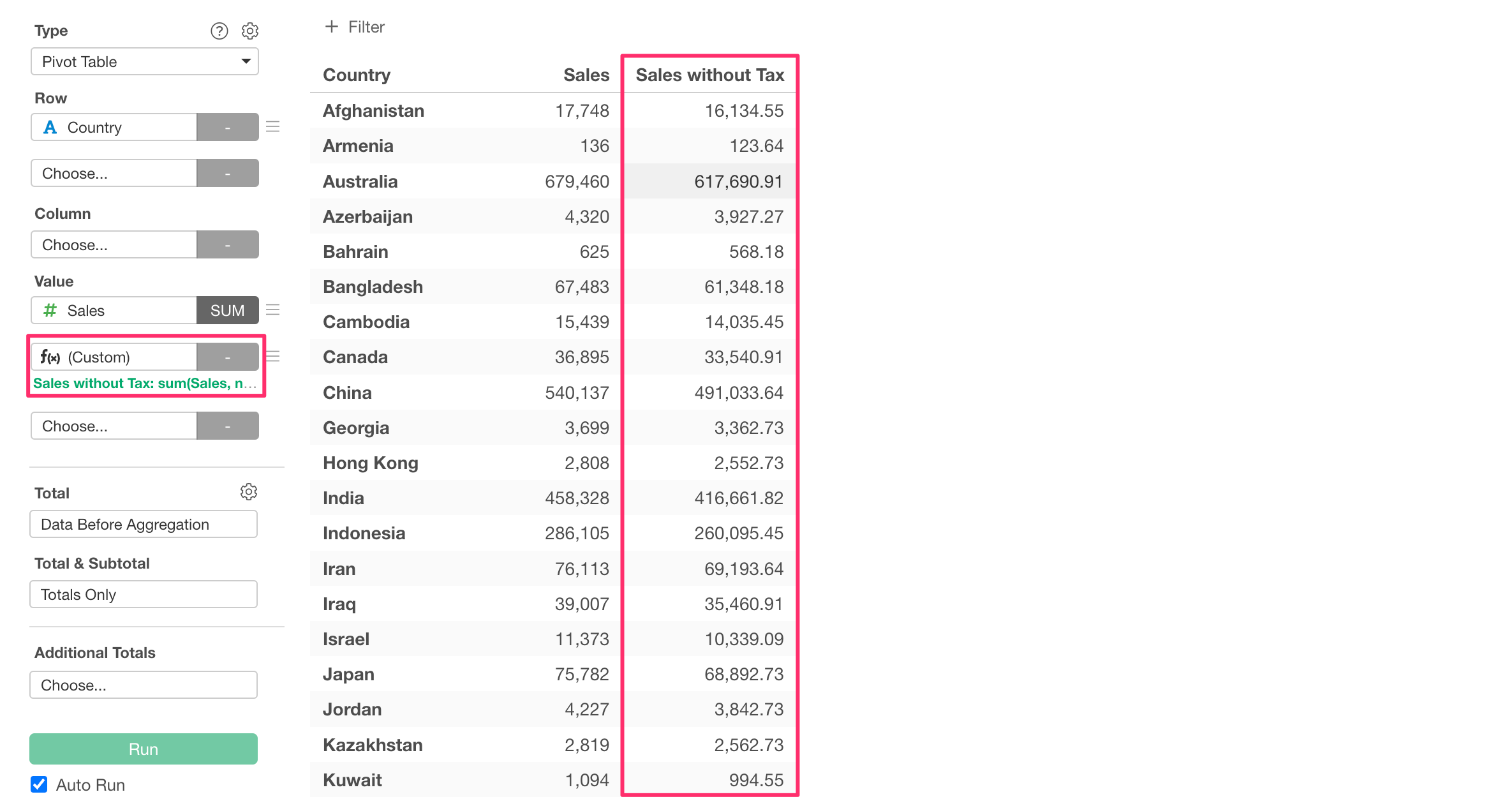 A new column will appear in the pivot table showing the total sales amount without the 10% tax.