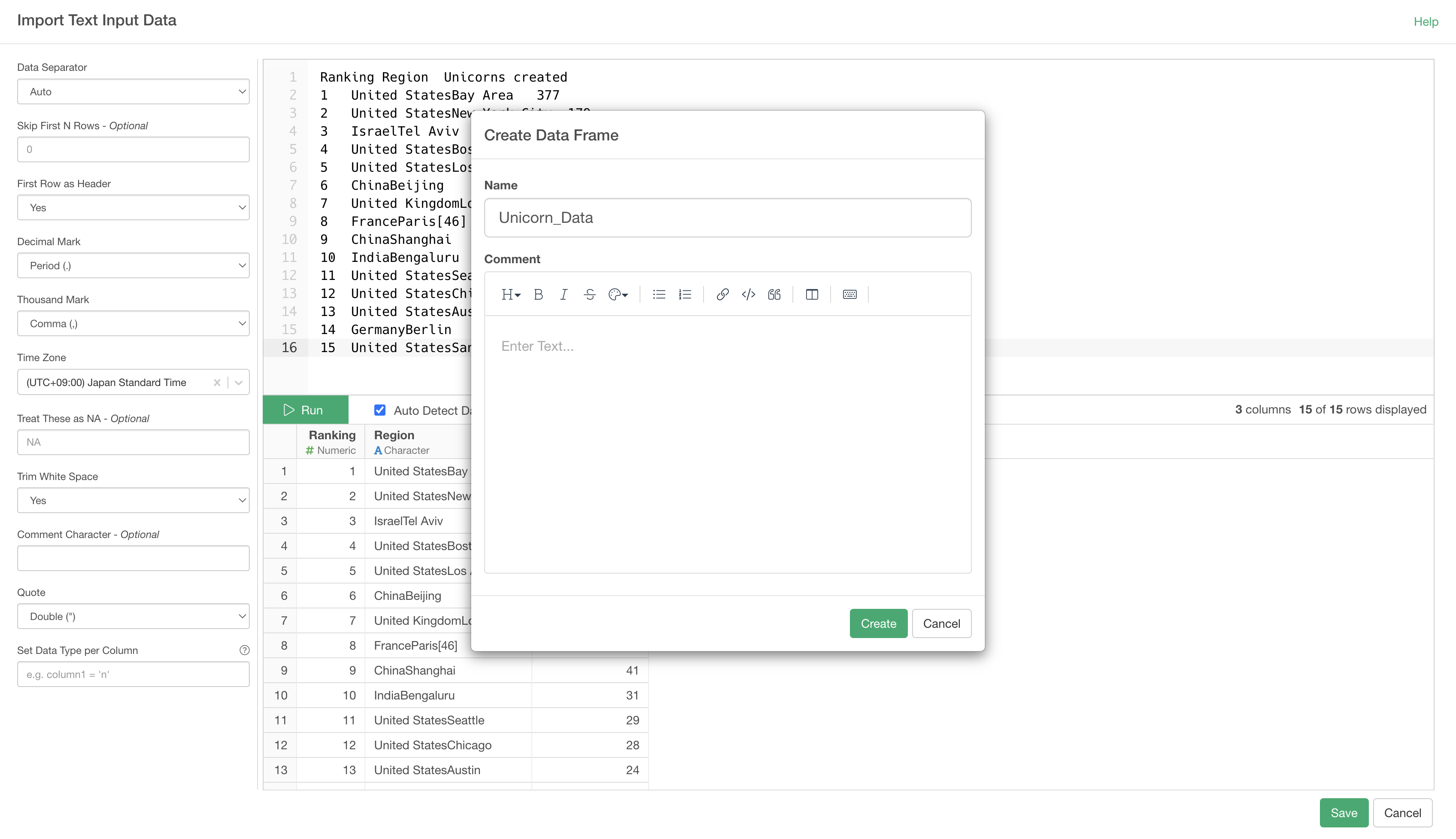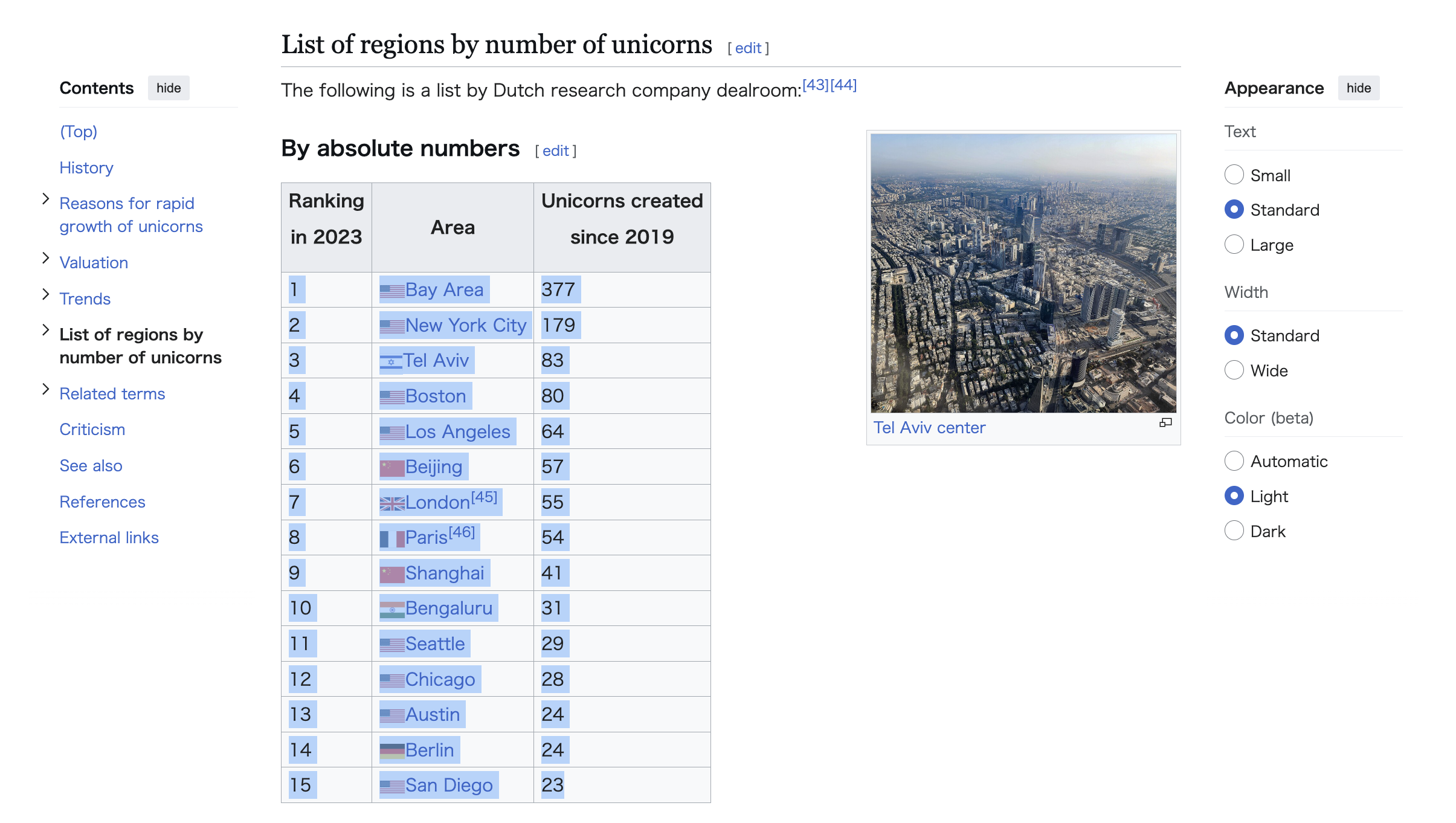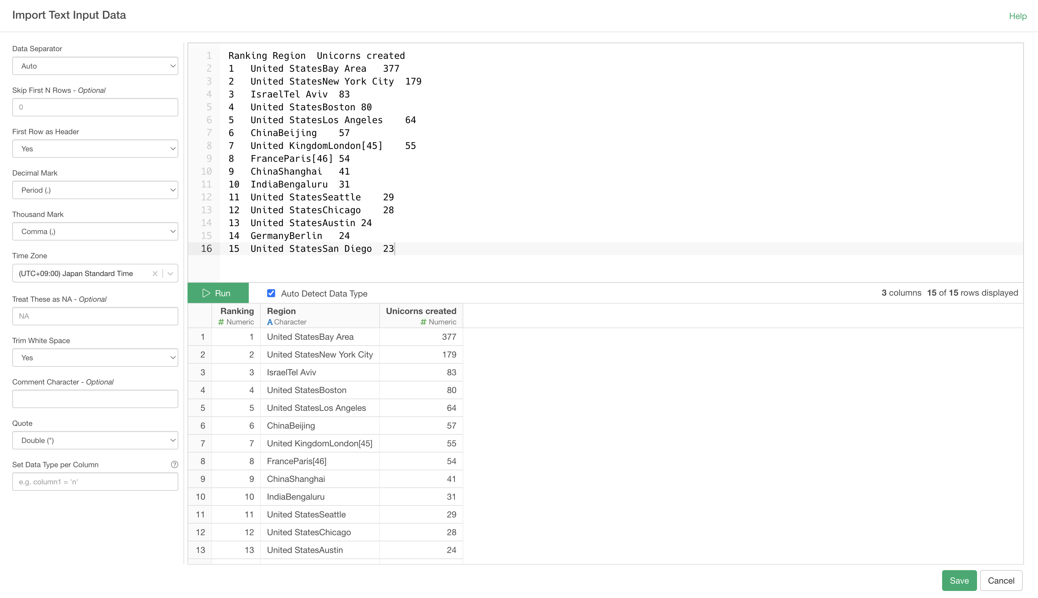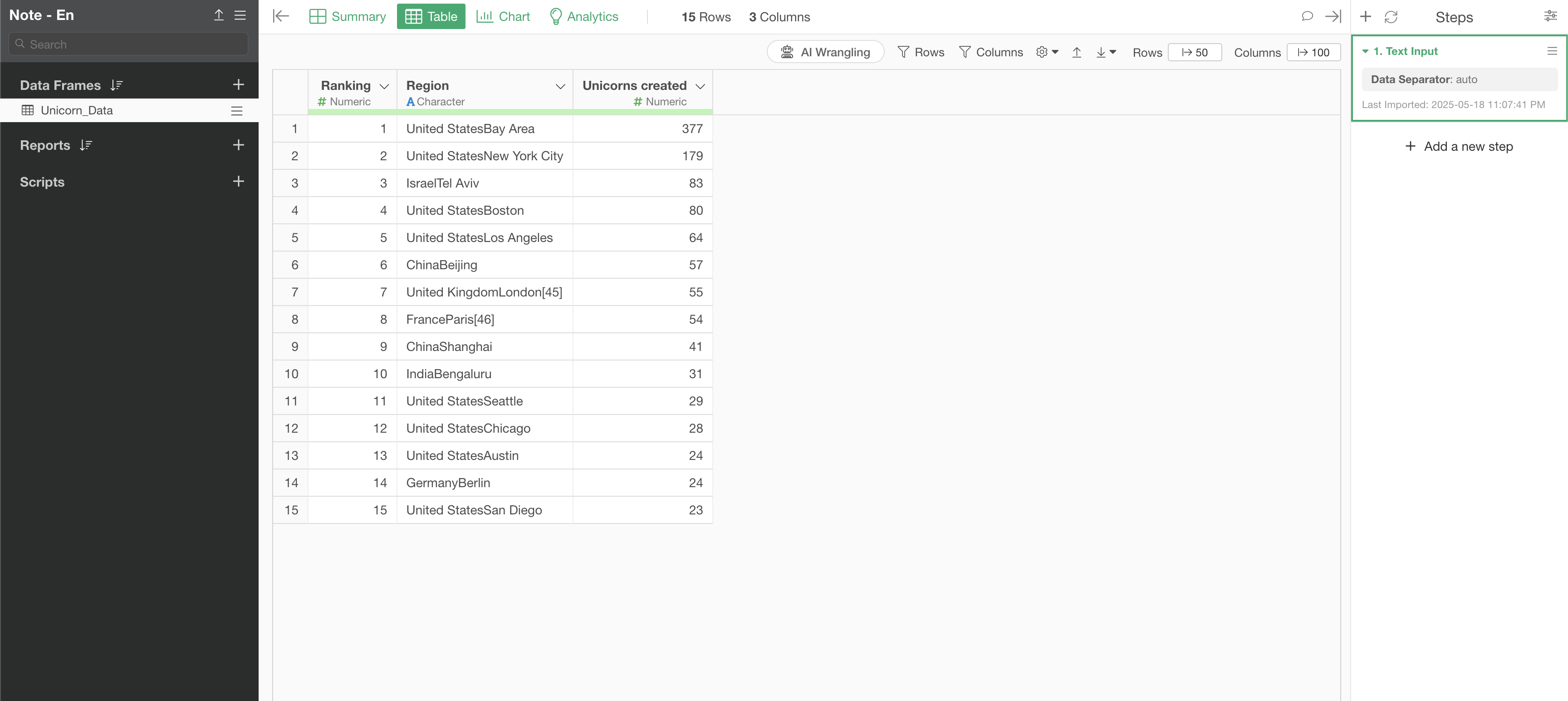 For example, copy the list of unicorn companies by region from this Wikipedia page.