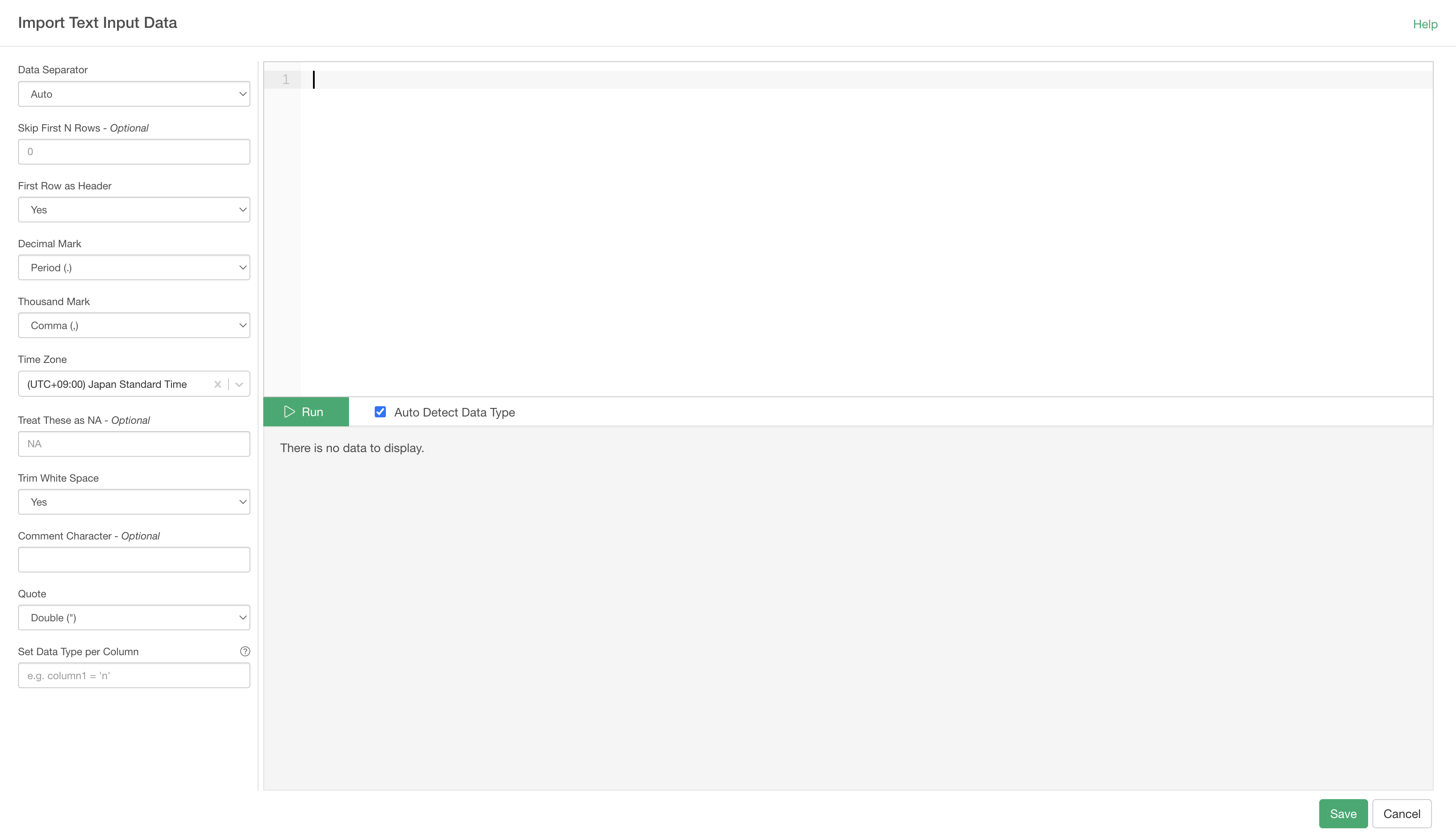 An import dialog will be displayed where you can manually enter data in the editor section. Data entry is done in a column and row format, and you can use tabs, spaces, commas, etc. as delimiters.