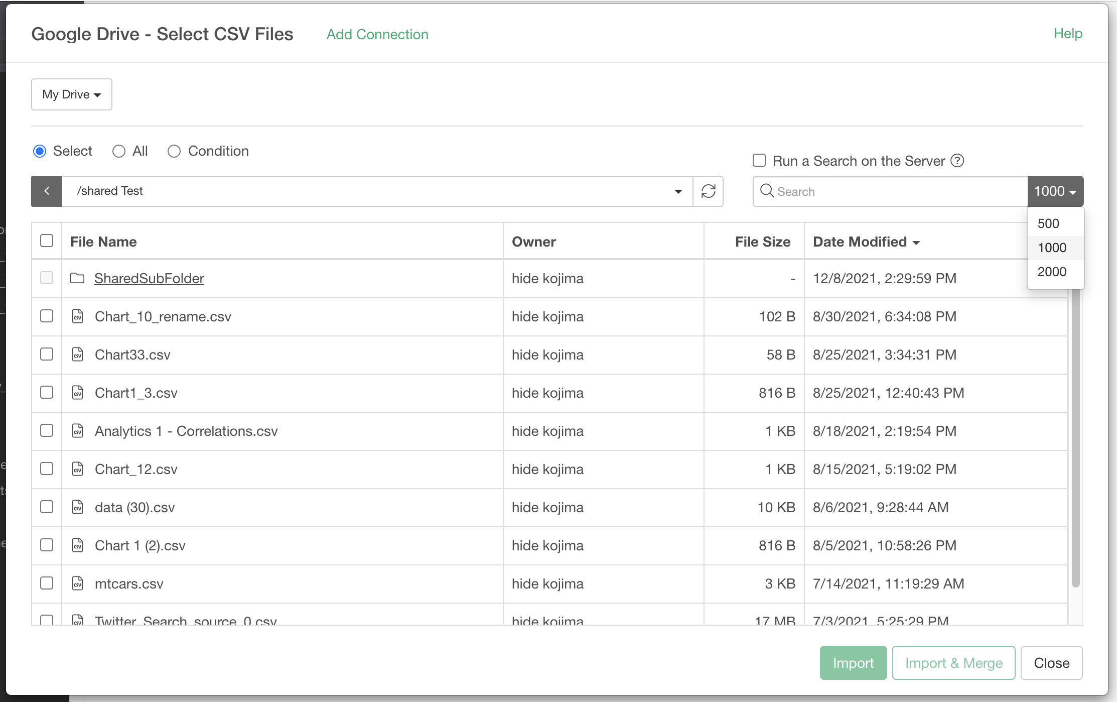 Once selected, you can see the list of files under My Drive. Also, for Google Drive, you can control number of files shown in the list by selecting option from pull down list.