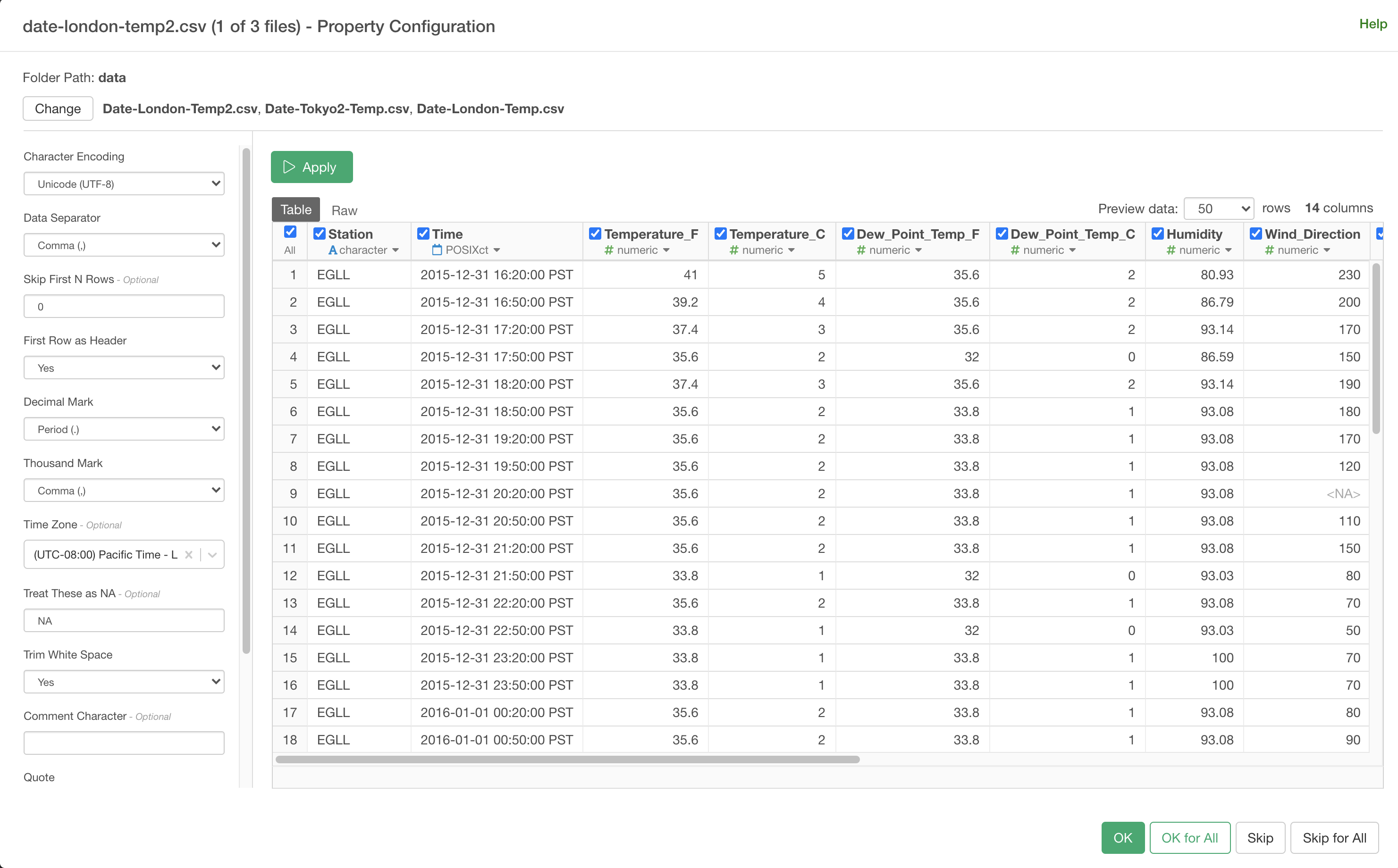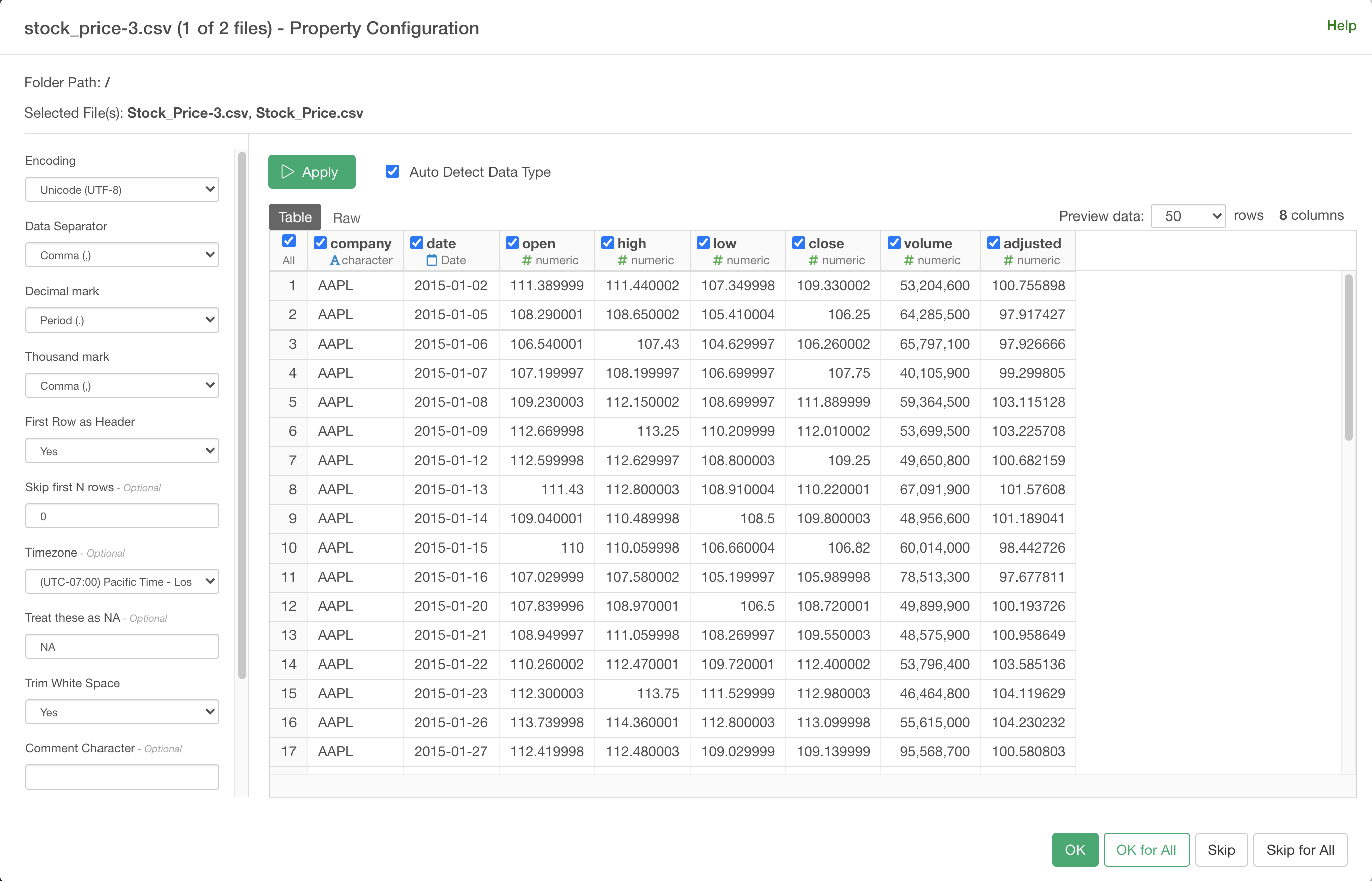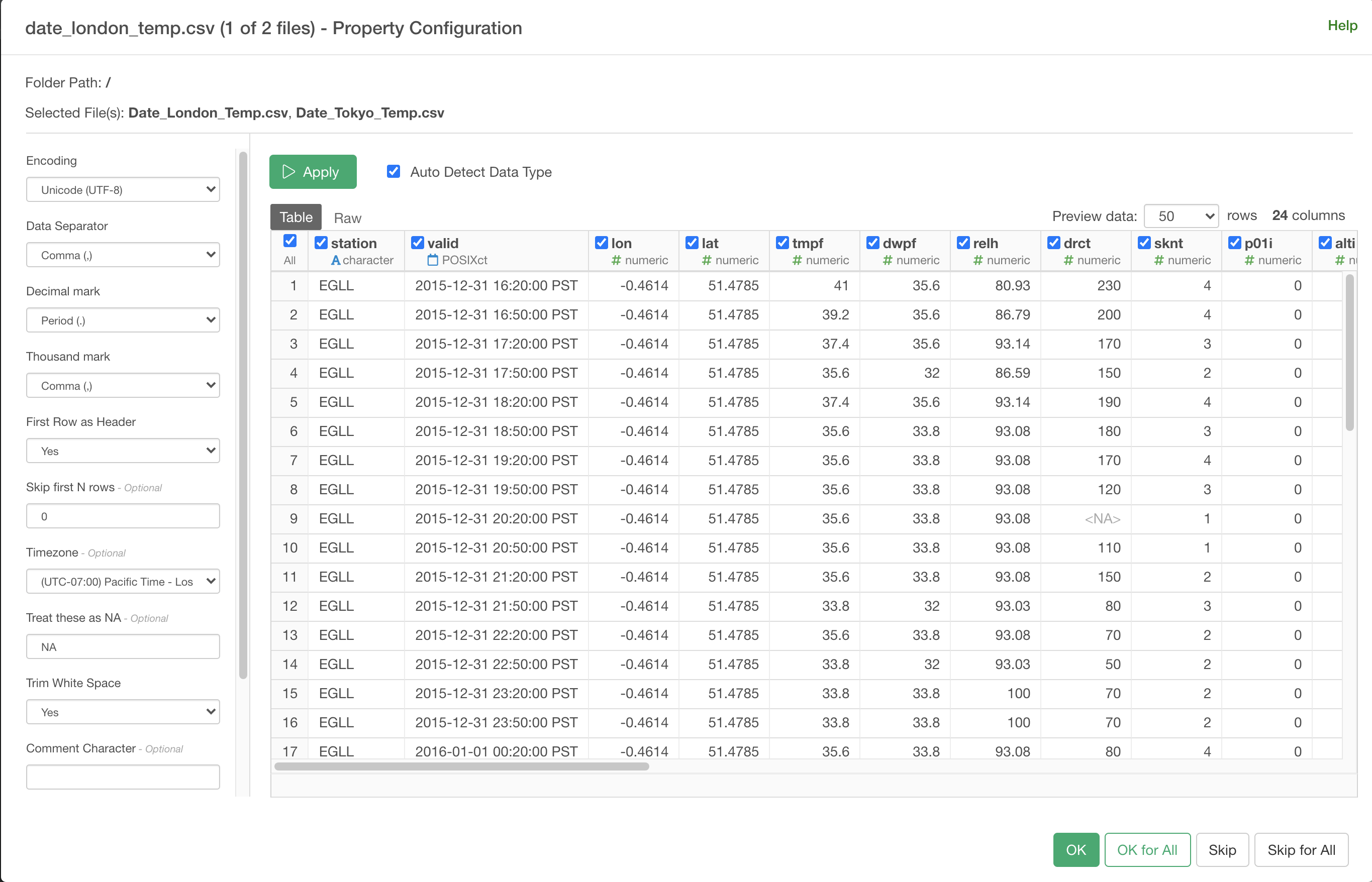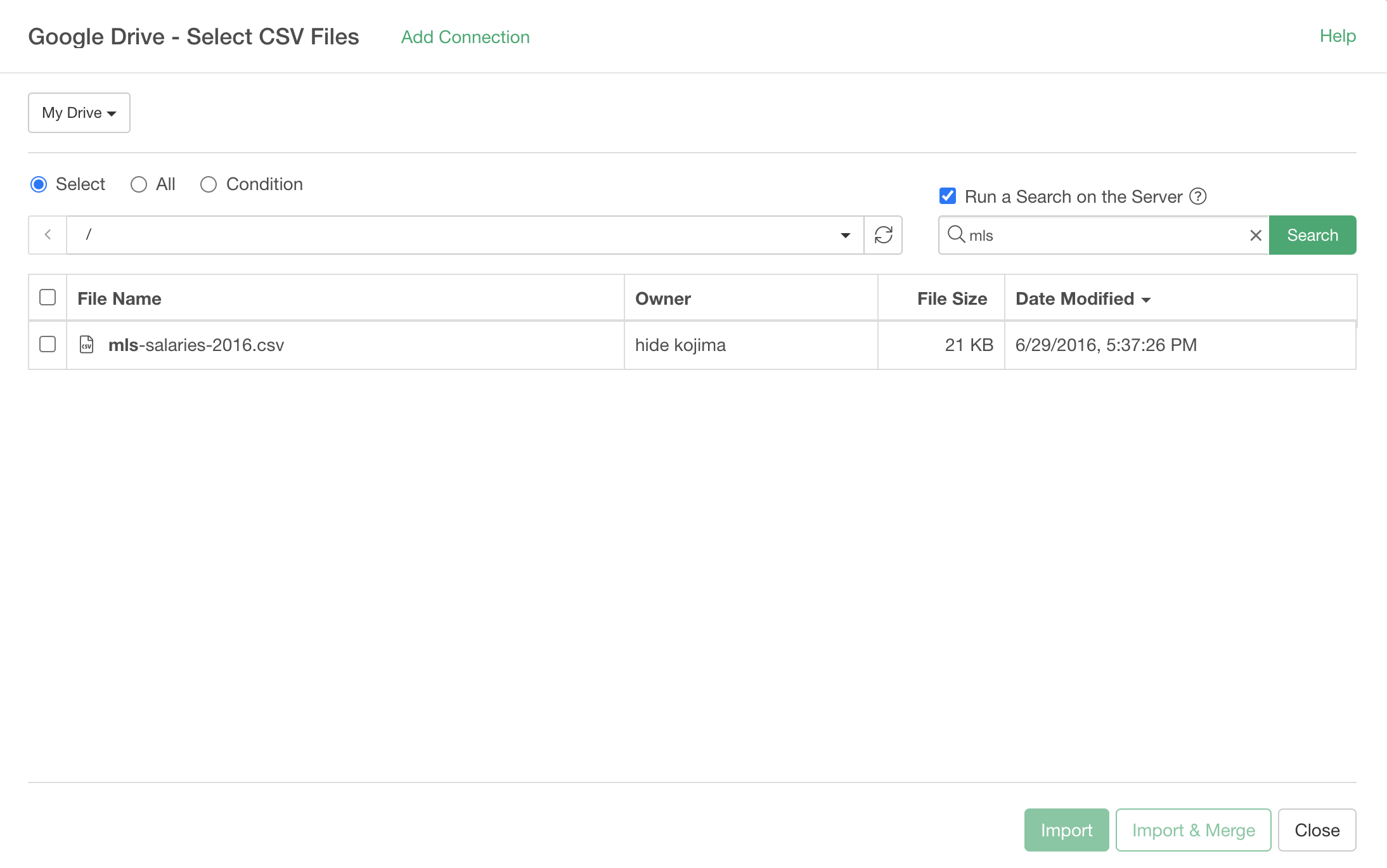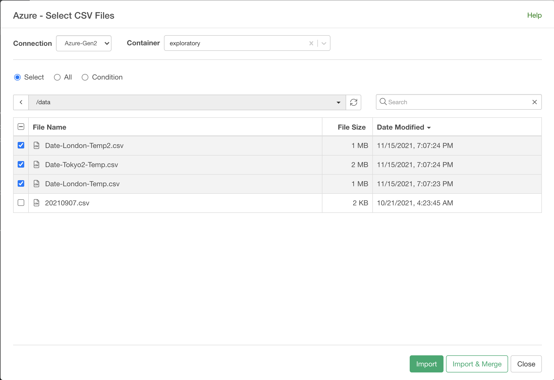 If you want to import multiple files that share the same column structure as a single data frame, check the files you want to import and click the "Import & Merge" button.