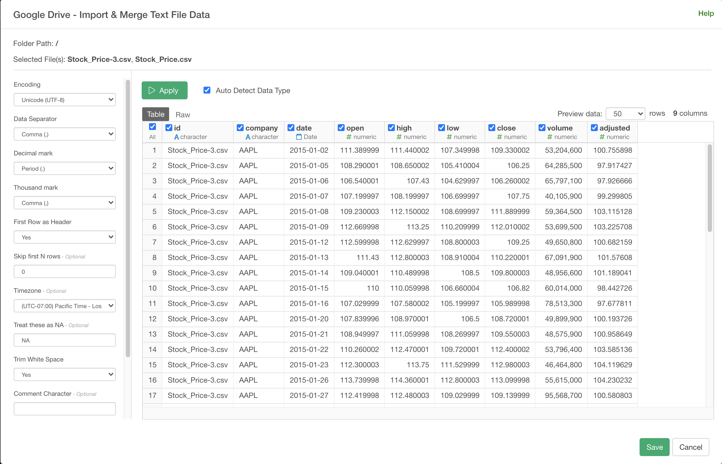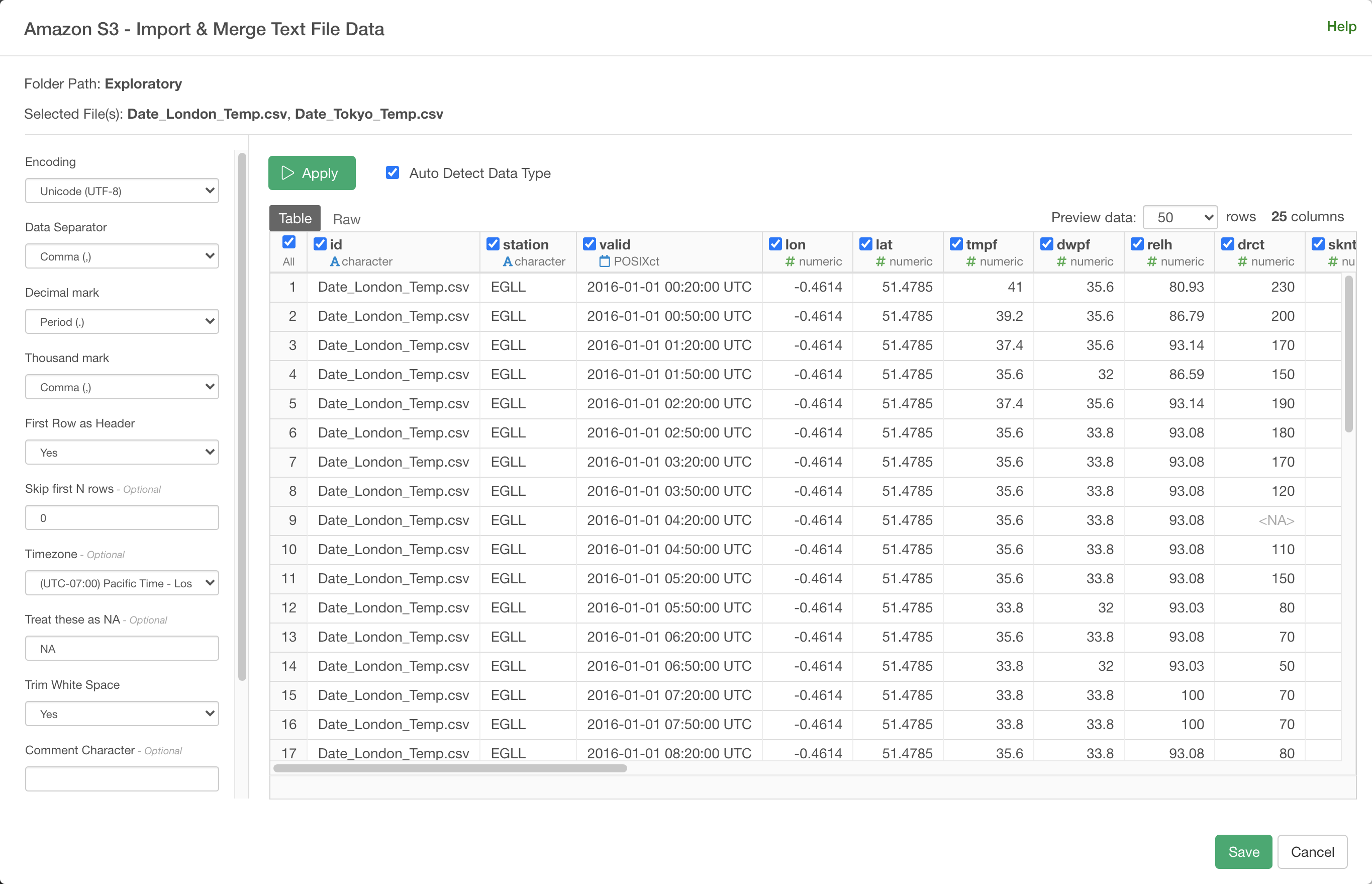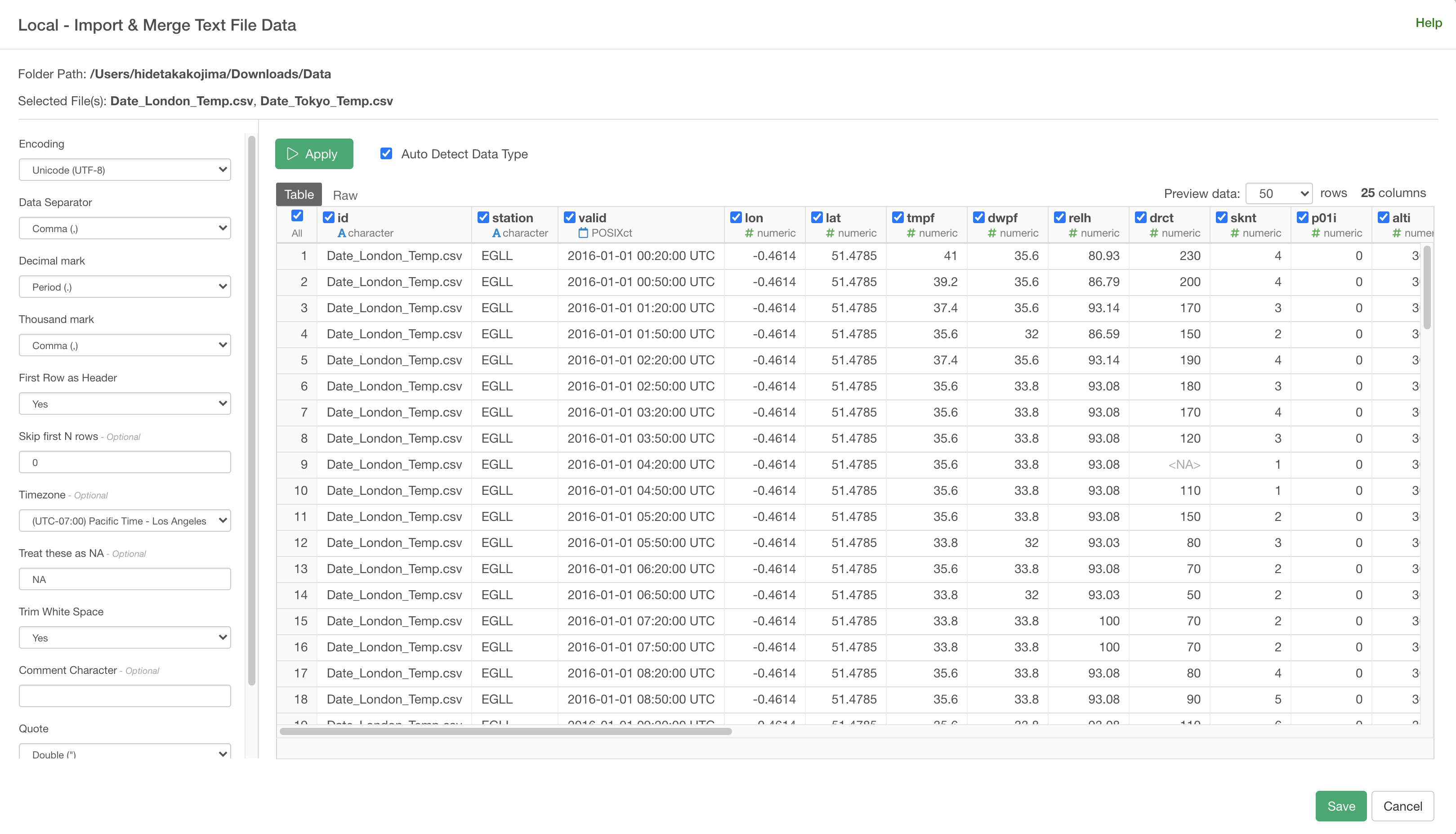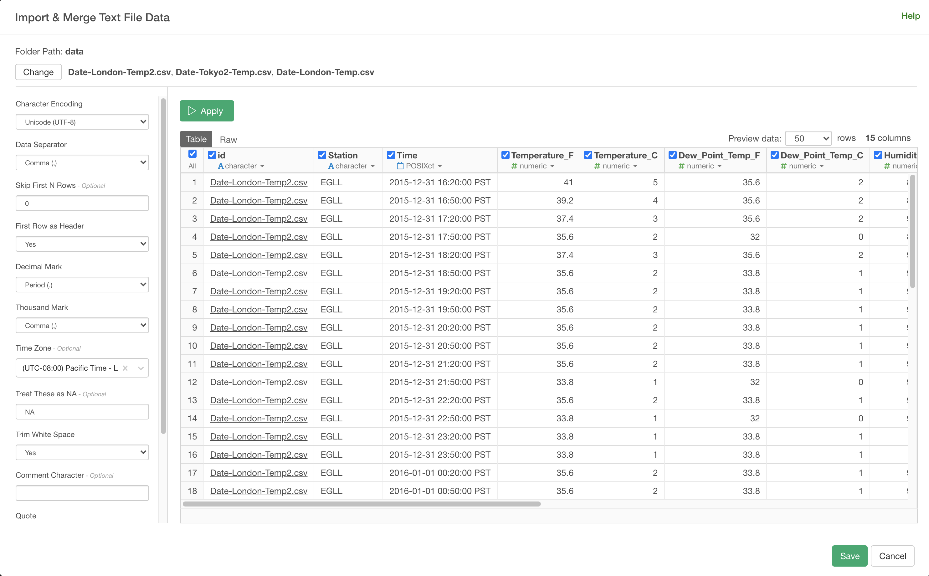 When you click the "Import & Merge" button, you can preview the data as a single data frame with the file name in the id column, as shown below. If there are no problems, click the Save button to import the data.