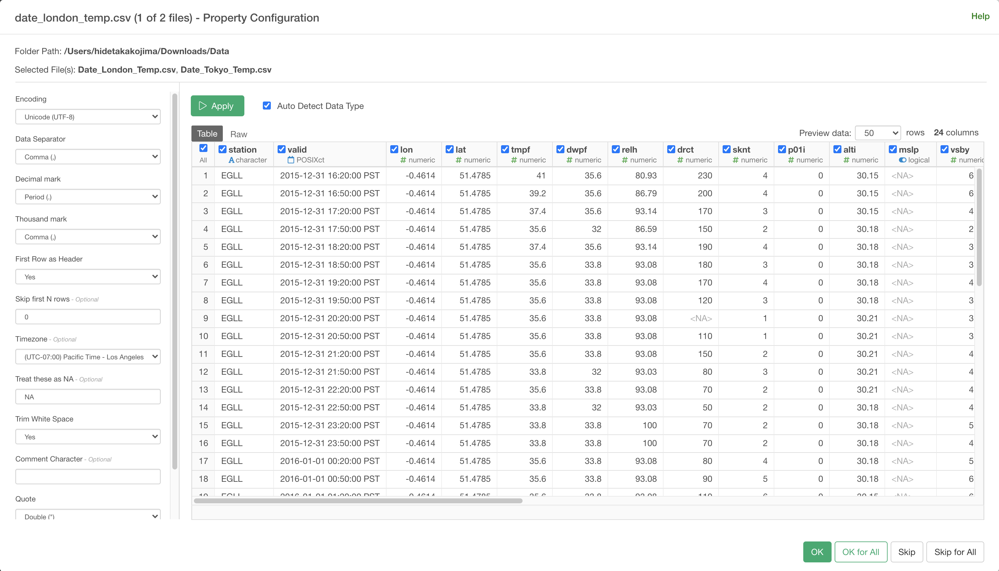 If you click on the "Import" button, you can set the properties for each selected file as shown below. If you click the "OK All" button, the same property settings will be applied to all files, and you can import the data without opening the settings screen for each file.