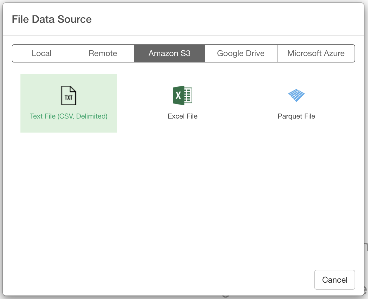 Then select the "CSV" or "Excel" or "Parquet" icon under Amazon S3 tab on the File Data Source dialog.
