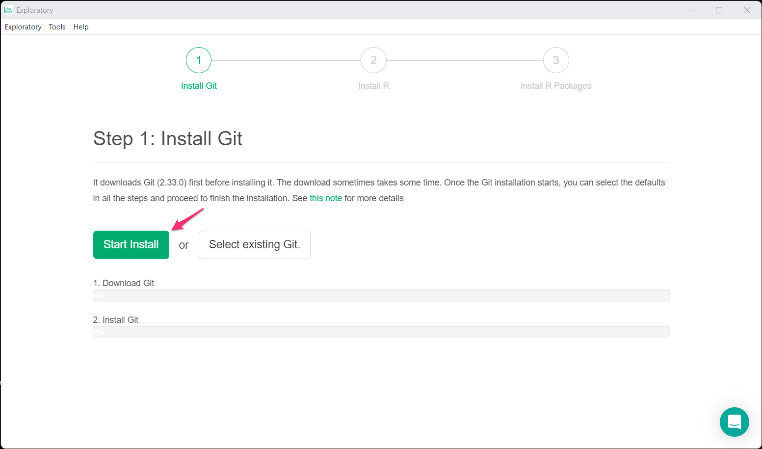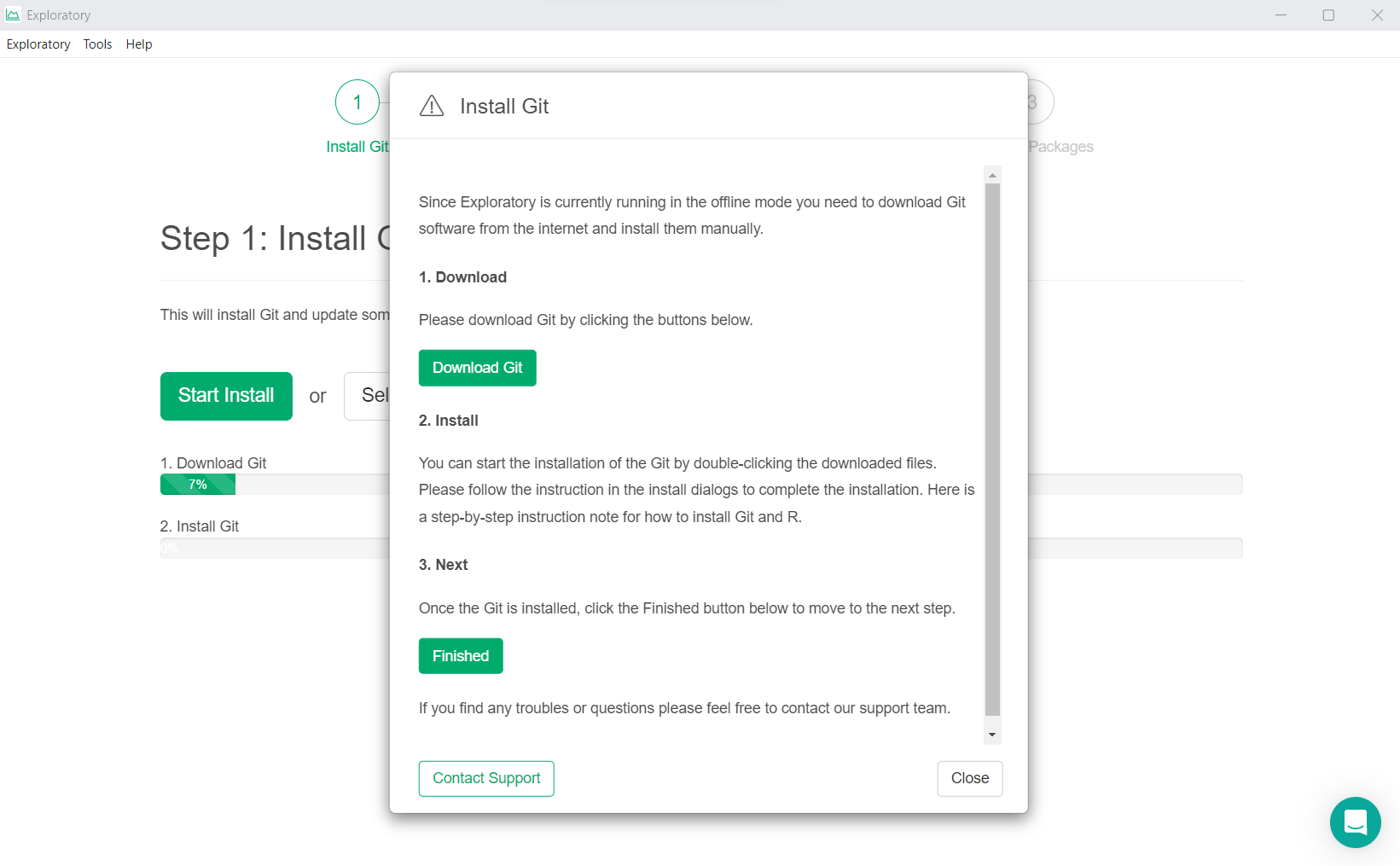 If the required software is not installed automatically during the installation of Exploratory, the following dialog will appear and you will need to install Git or R manually.